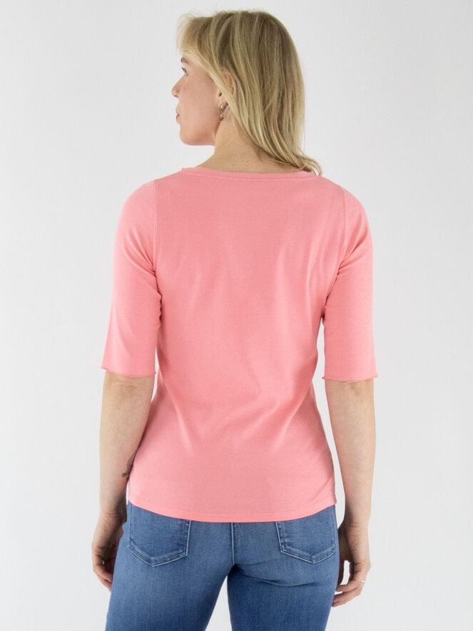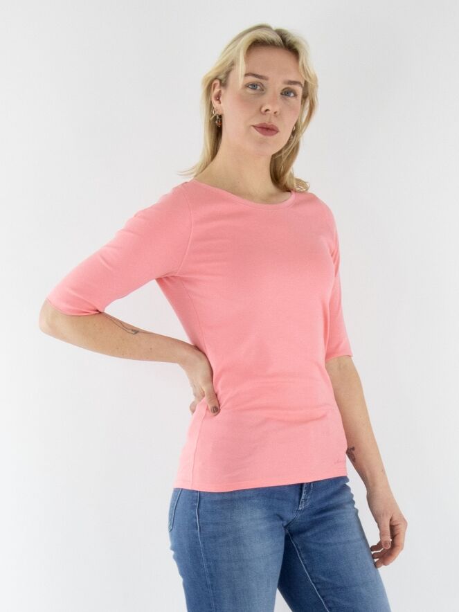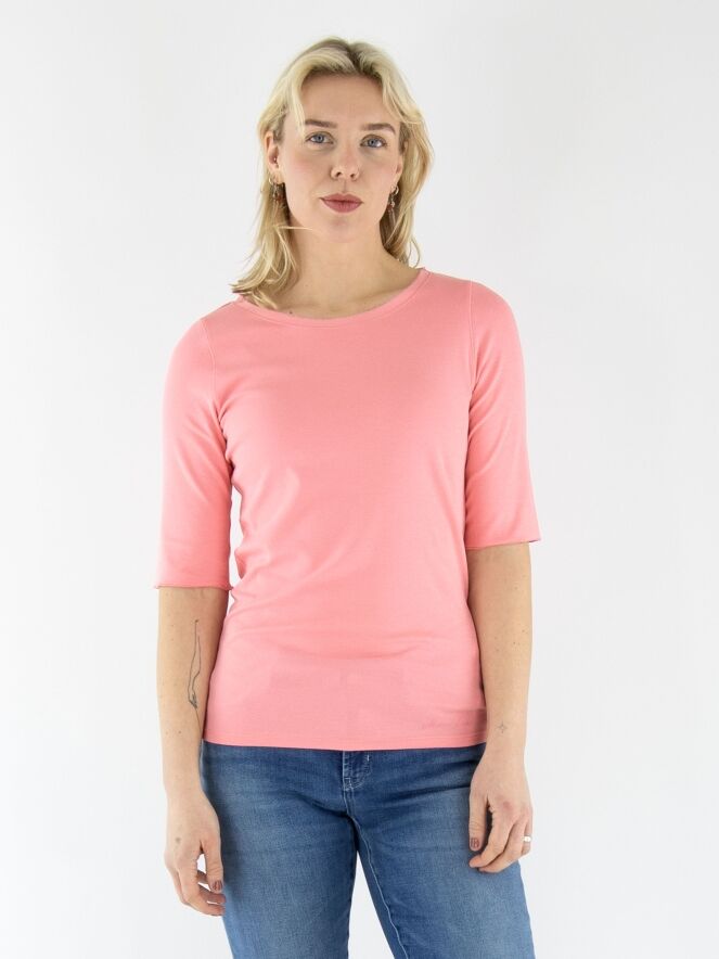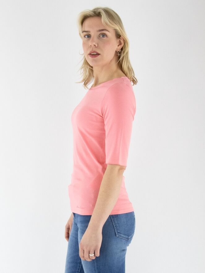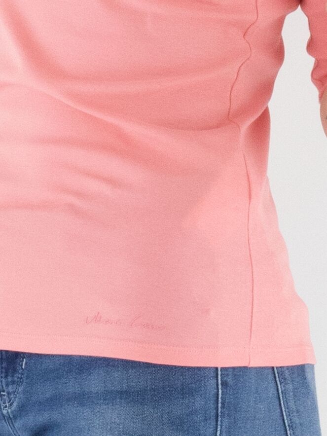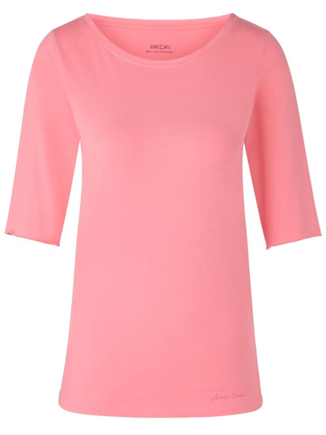 Een shirt van Marc Cain in een zalmroze kleur. Langs de rand van de ronde hals loopt een dubbele matte satijnen bies. Het shirt heeft korte mouwen en dient met de hand te worden gewassen.