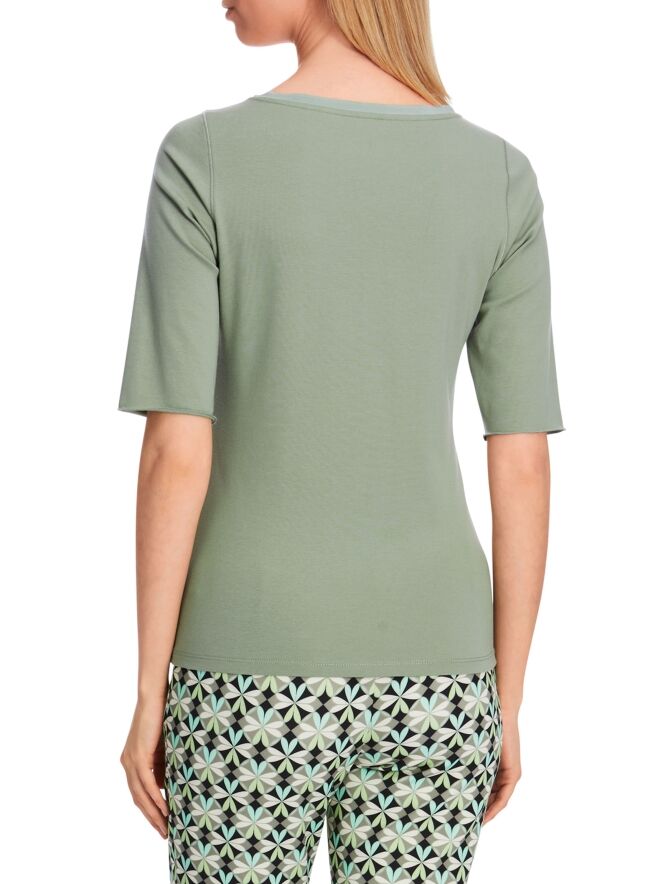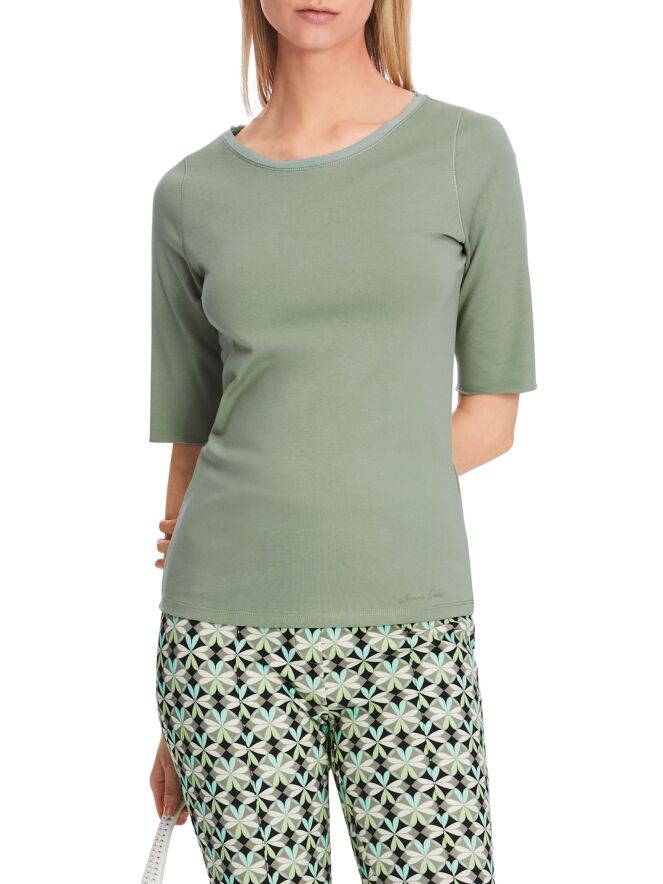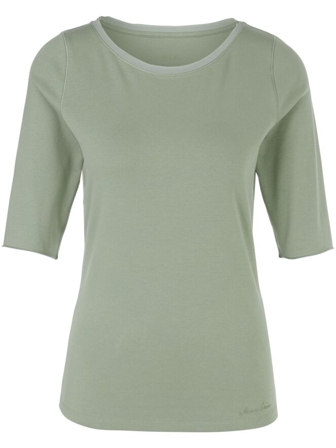 Een shirt van Marc Cain in een pastel olijfgroene kleur. Langs de rand van de ronde hals is een dubbele mat satijnen bies. Het shirt heeft korte mouwen en mag op de hand worden gewassen.
