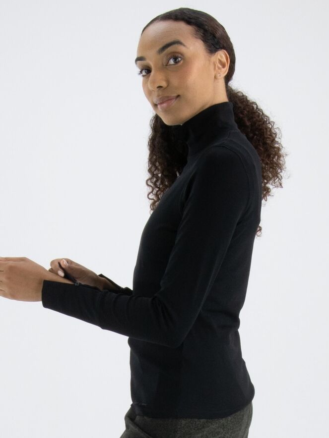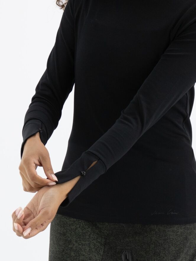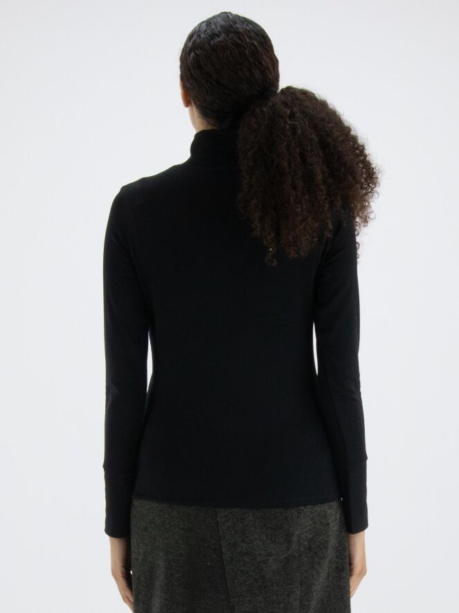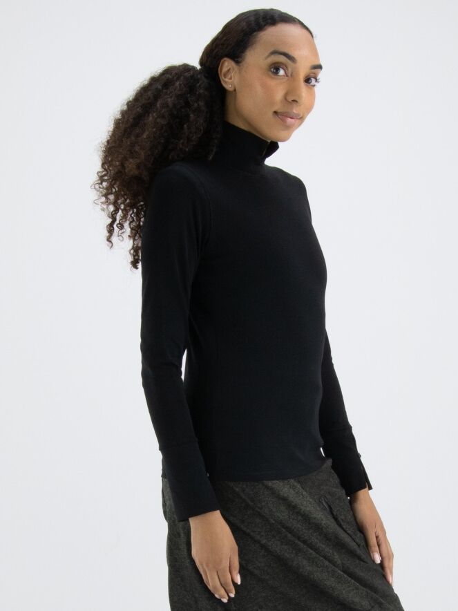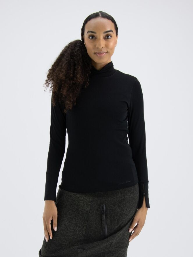 Een shirt van Marc Cain in de kleur zwart. Het shirt heeft lange mouwen en een turtle col met een kort splitje in het midden voor. Dit shirt mag op 30 graden worden gewassen.