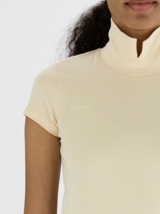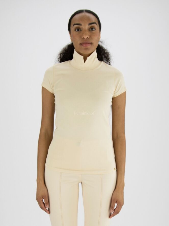 Een shirt van Marc Cain in de kleur zand. Het shirt heeft korte mouwen en een turtle hals. Dit shirt mag op 30 graden worden gewassen.