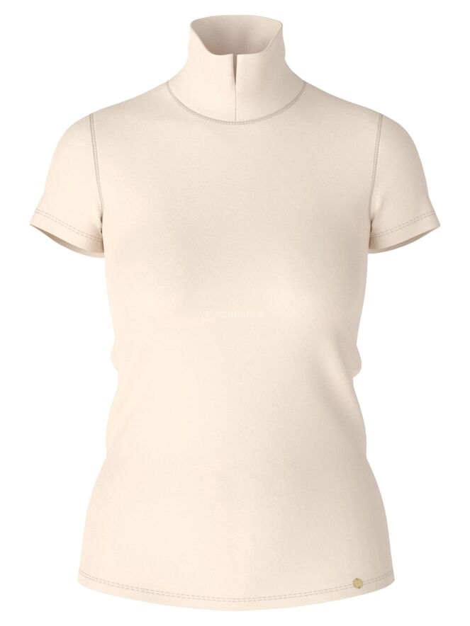 Een shirt van Marc Cain in de kleur zand. Het shirt heeft korte mouwen en een turtle hals. Dit shirt mag op 30 graden worden gewassen.