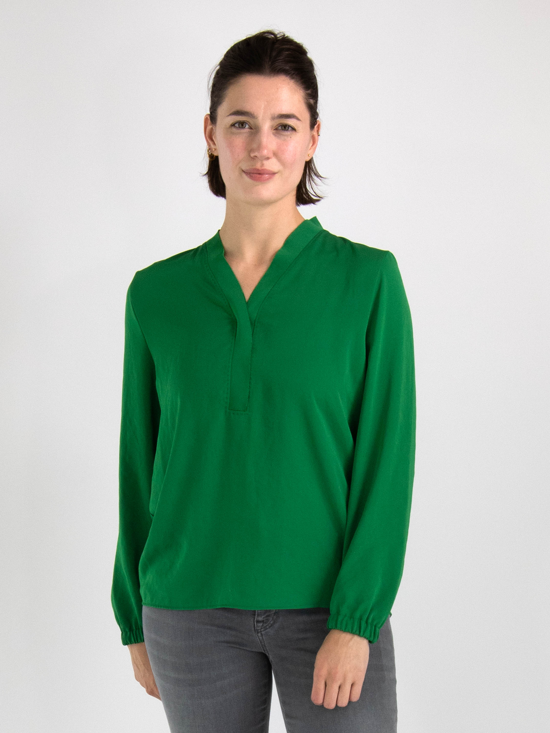 Een blouse van Marc Cain in de kleur groen. Langs de rand van de V - Hals is een bies in een dubbele stof. met een decoratieve doorgestikte naad. Aan het uiteinde van de lange mouwen is een elastische fijn geplooide bies. deze blouse mag op 30 graden worden gewassen.