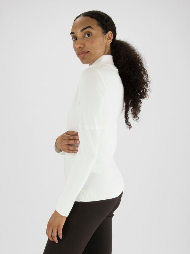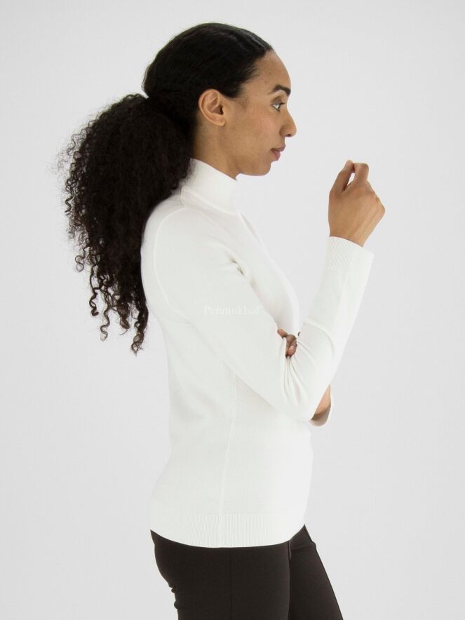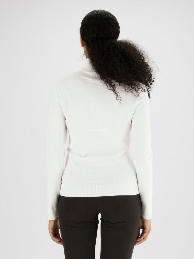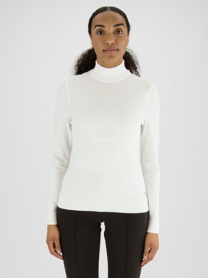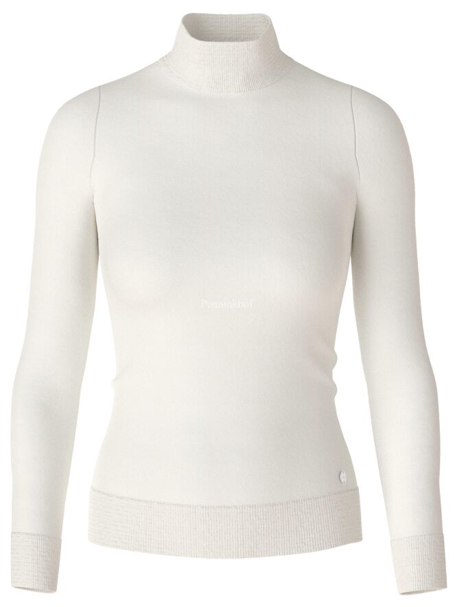 Een pullover van Marc Cain in de kleur roomwit. De pullover heeft lange mouwen en een turtle hals. Aan de onderkant van de pullover en aan het uiteinde van de mouwen is een fijn geribbelde tricot boord. Deze pullover mag op 30 graden worden gewassen.