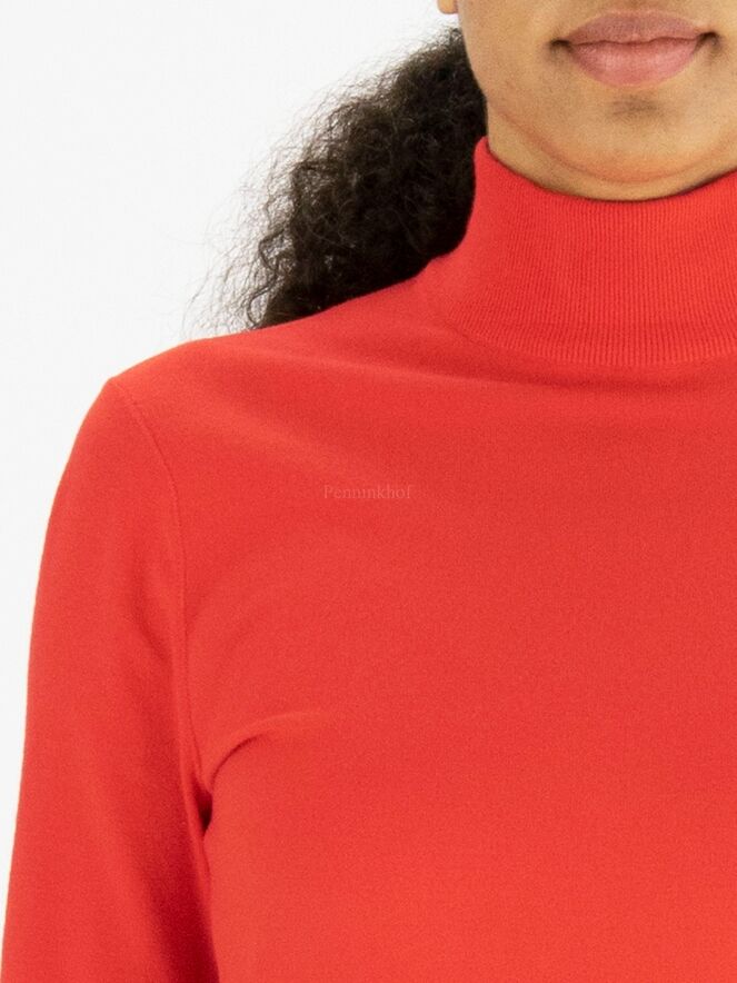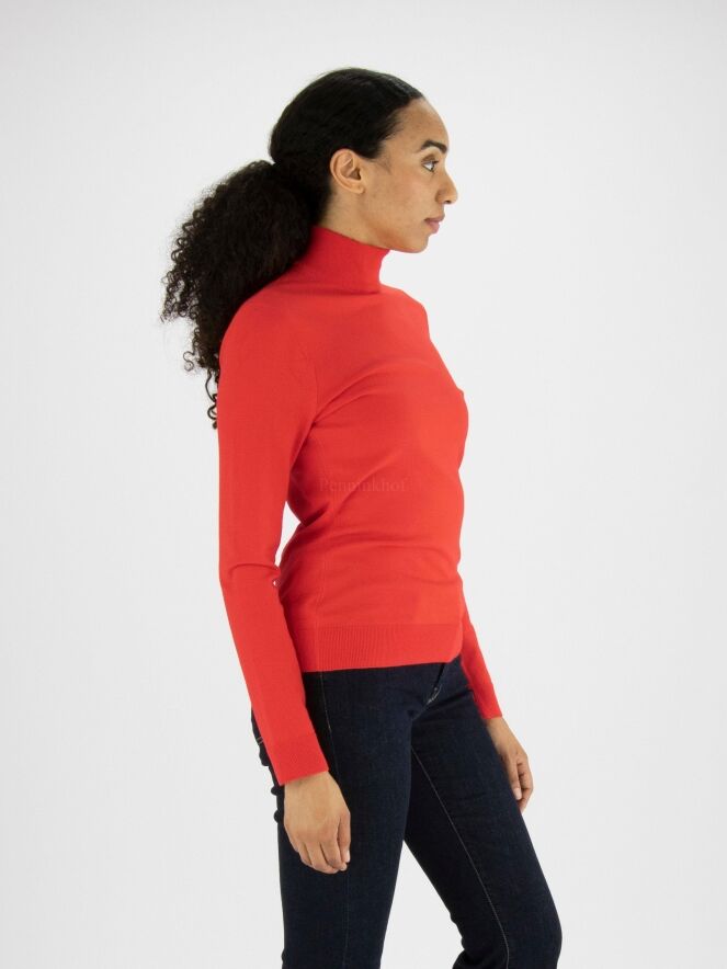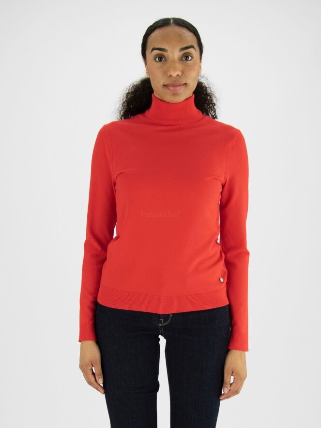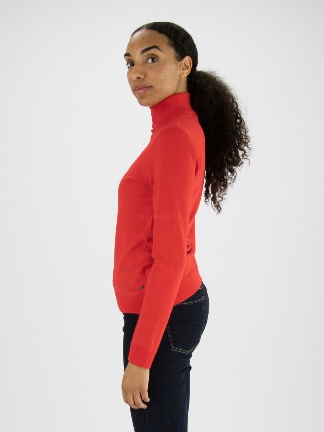 Een pullover van Marc Cain in de kleur rood. De pullover heeft lange mouwen en een turtle hals. Aan de onderkant van de pullover en aan het uiteinde van de mouwen is een fijn geribbelde tricot boord. Deze pullover mag op 30 graden worden gewassen.