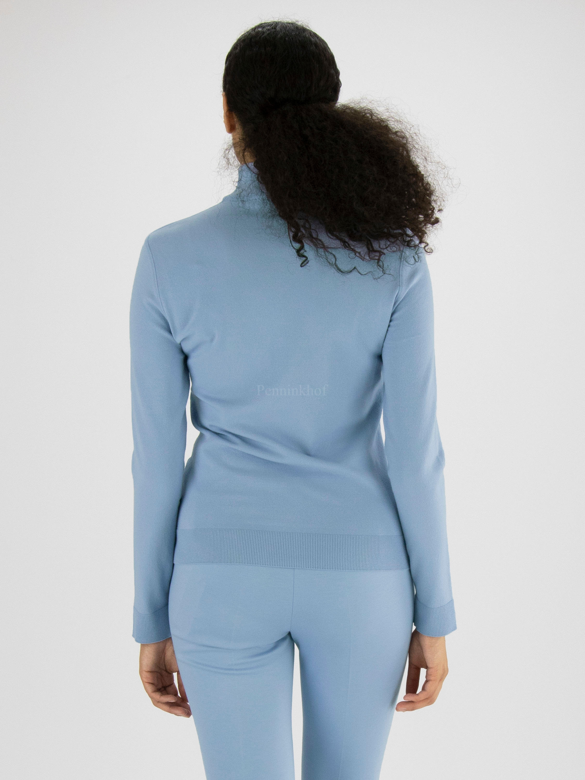 Een pullover van Marc Cain in de kleur lichtblauw. De pullover heeft lange mouwen en een turtle hals. Aan de onderkant van de pullover en aan het uiteinde van de mouwen is een fijn geribbelde tricot boord. Deze pullover mag op 30 graden worden gewassen.