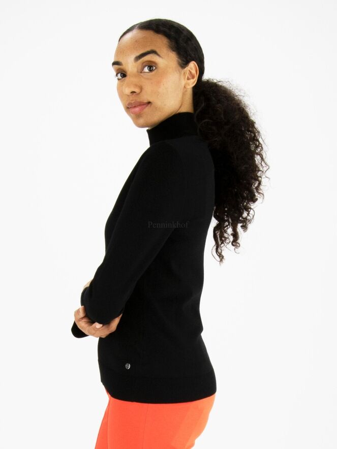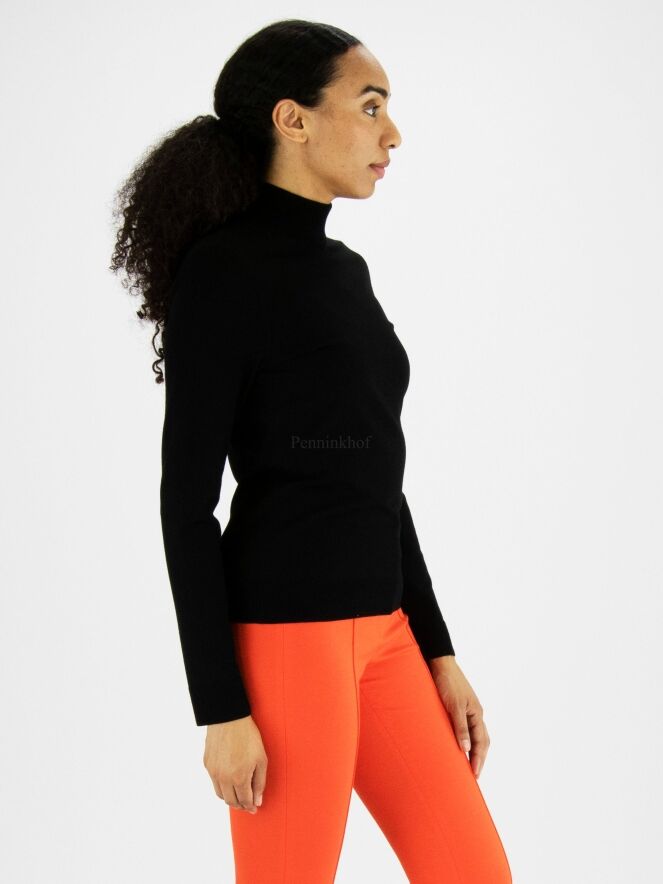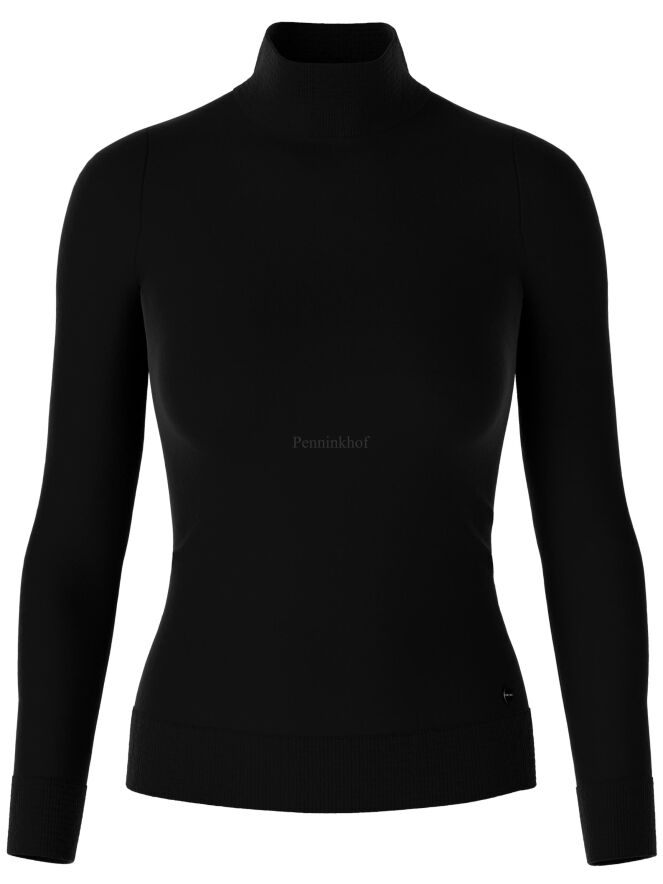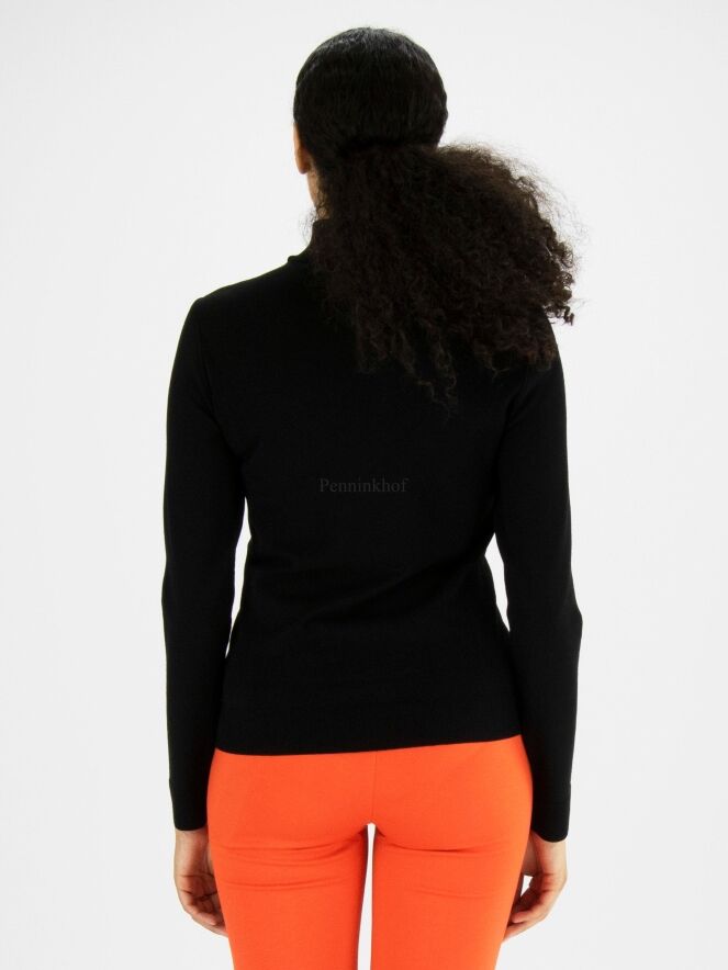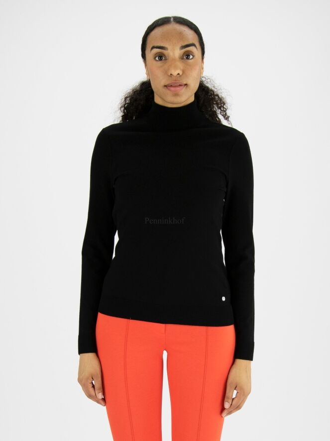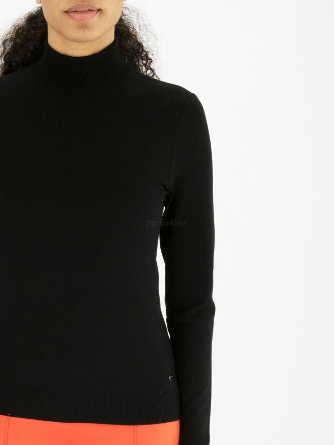 Een pullover van Marc Cain in de kleur zwart. De pullover heeft lange mouwen en een turtle hals. Aan de onderkant van de pullover en aan het uiteinde van de mouwen is een fijn geribbelde tricot boord. Deze pullover mag op 30 graden worden gewassen.