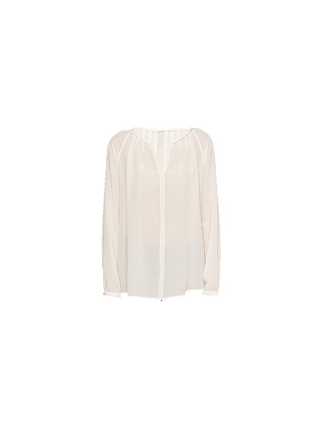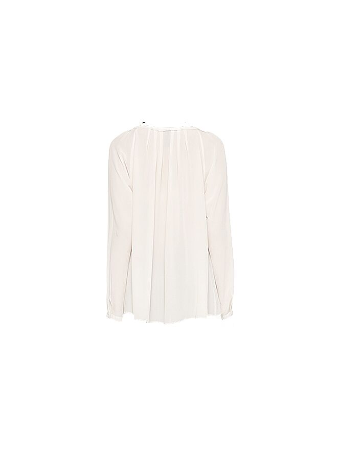 Een blouse van het merk Marc Cain in een uni kleur écru. In de ronde hals is een smal stuk metaal verwerkt in een messing kleur. De blouse loopt naar beneden toe wijd uit en heeft in het midden een band van dubbele stof die fijn is doorgestikt. Deze blouse mag op de hand worden gewassen.