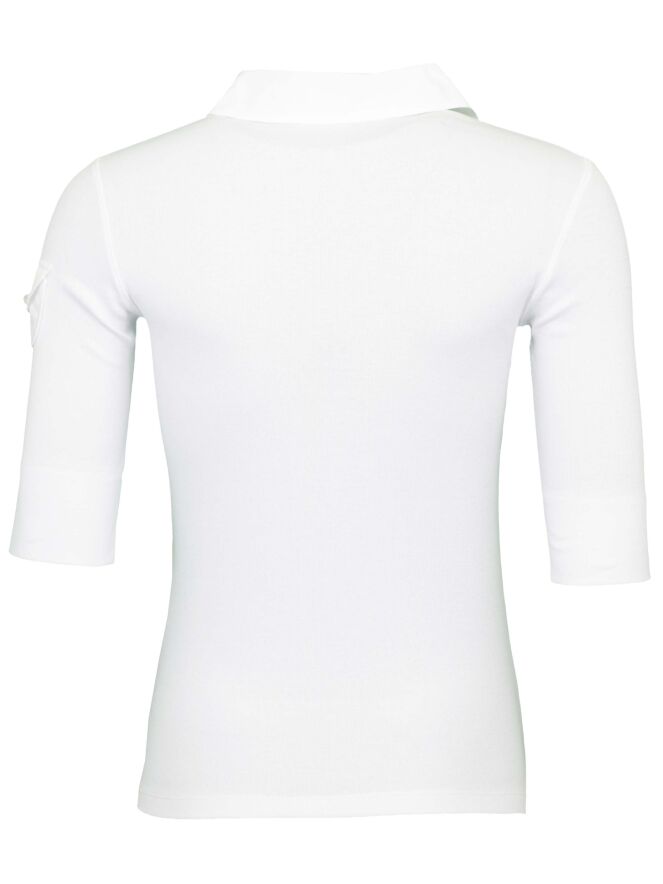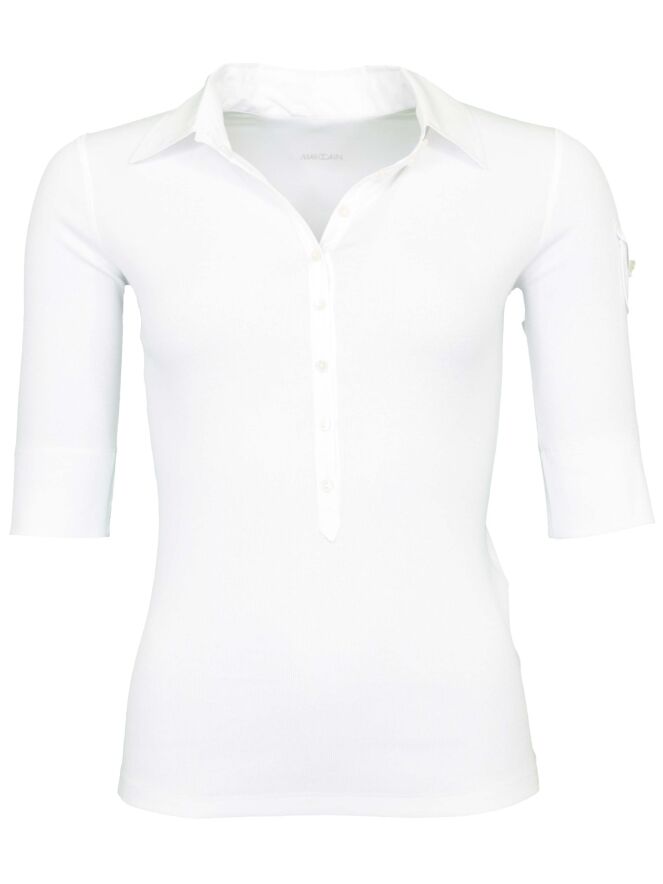 Een polo shirt van het merk Marc Cain in de kleur wit. De stof van het shirt is fijn geribbeld. Op de linker mouw is een klein zakje. De mat glanzende kraag is van 100% polyester. Dit polo shirt mag op 30 graden worden gewassen.