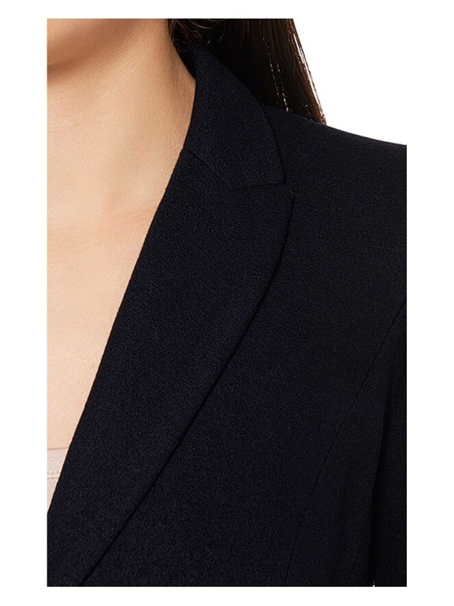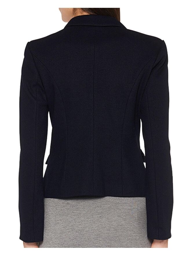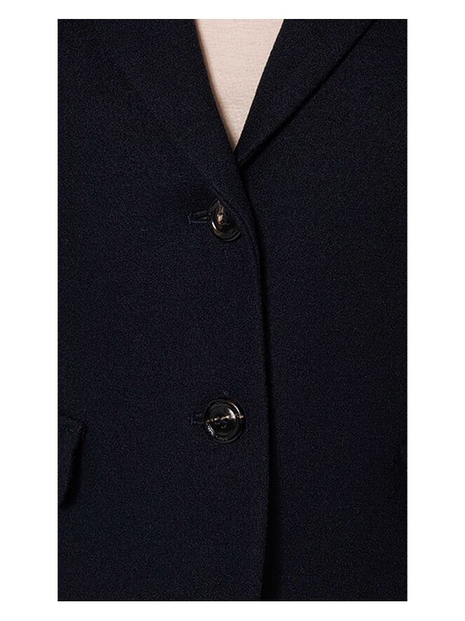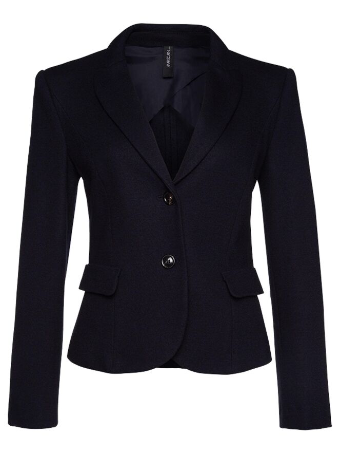 Een blazer van het merk Marc Cain essentiels in de kleur marine blauw. De blazer is licht getailleerd en heeft een 2 knoops sluiting. Aan de voorzijde zitten 2 valse zakjes en de blazer mag niet worden gewassen.
