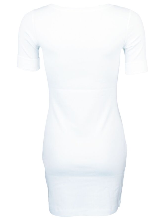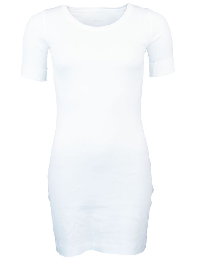 Een lang shirt van het merk Marc Cain in de kleur wit. Het shirt is licht getailleerd en heeft een ronde hals met een bies in het zelfde materiaal. De korte mouwen hebben een omslag van 4 cm. Het shirt mag op 30 graden worden gewassen.