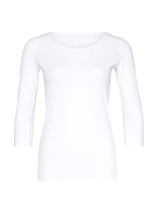 Een panty shirt van het merk Marc Cain essentiels in de kleur wit. Het shirt sluit mooi aan op de huid en is licht getailleerd. De ronde hals belijning heeft een smalle bies en het shirt heeft lange mouwen. Dit shirt mag op 30 graden worden gewassen.