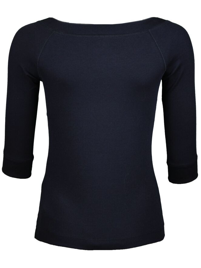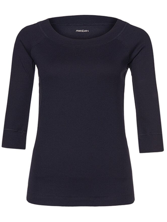 Een shirt van het merk Marc Cain in de kleur marine blauw. Het shirt heeft half lange mouwen en een ronde hals belijning. Dit shirt mag op 30 graden worden gewassen.