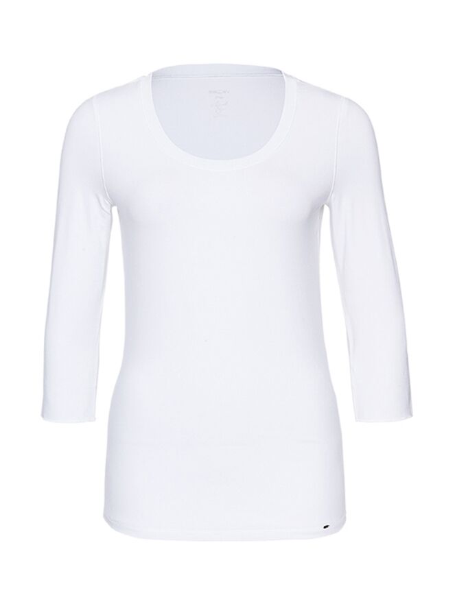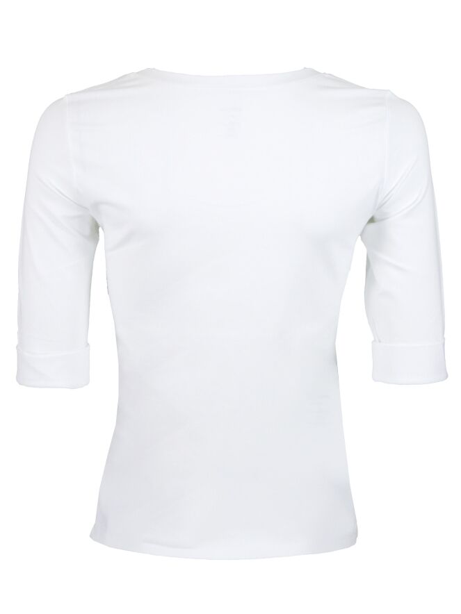 Een shirt van het merk Marc Cain Essentiels in de kleur wit. Het shirt heeft een ronde hals met een bies van 2 cm breed. De korte mouwen hebben een omslag van 3 cm breed. Het shirt mag op 30 graden worden gewassen.