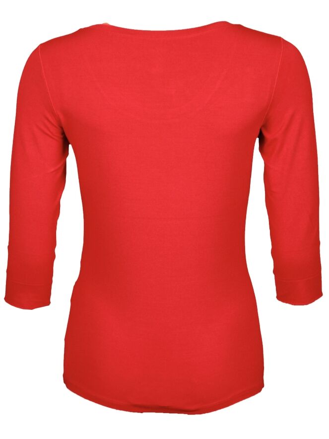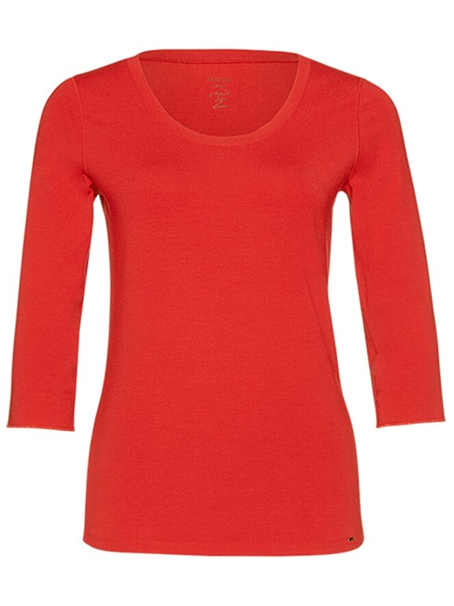 Een shirt van het merk Marc Cain Essentiels in de kleur rood. Het shirt heeft een ronde hals met een bies van 2 cm breed. De korte mouwen hebben een omslag van 3 cm breed. Het shirt mag op 30 graden worden gewassen.