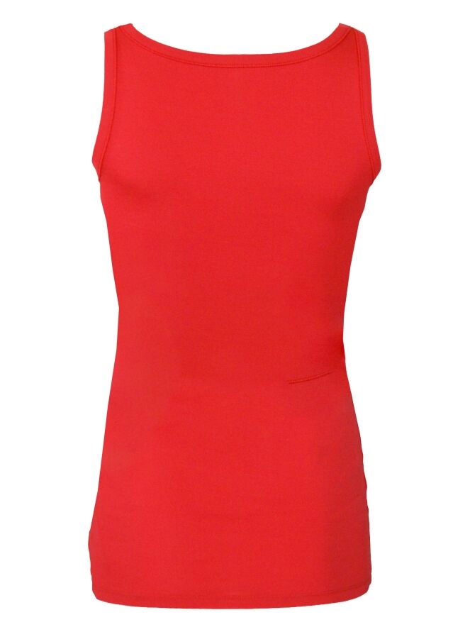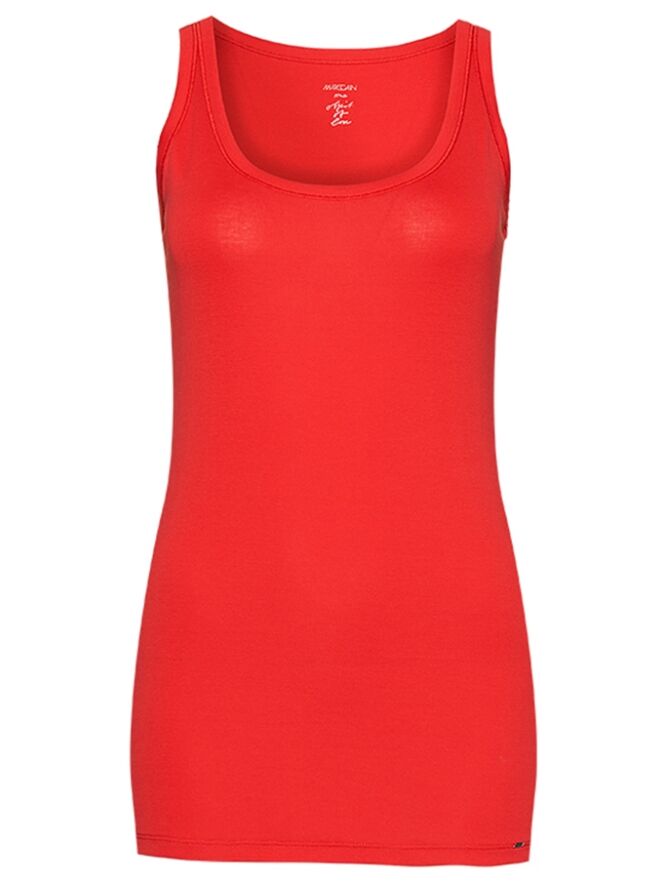 Een top van het merk Marc Cain uit de essentiels collectie in de kleur rood. De top heeft een ronde hals en een schouderband van 3 cm breed. Deze top mag op 30 graden worden gewassen.