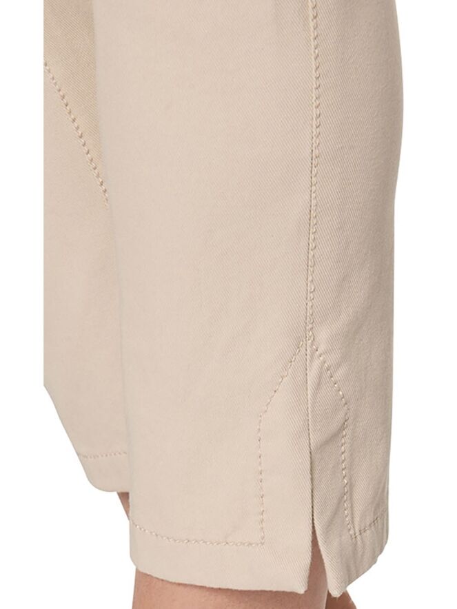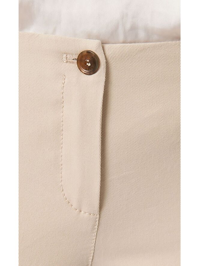 Een basis broek van het merk Marc Cain in de kleur zand. De broek heeft een verborgen ritssluiting met een knoop en de pijpen zijn los van het been. Deze broek mag op 30 graden worden gewassen.