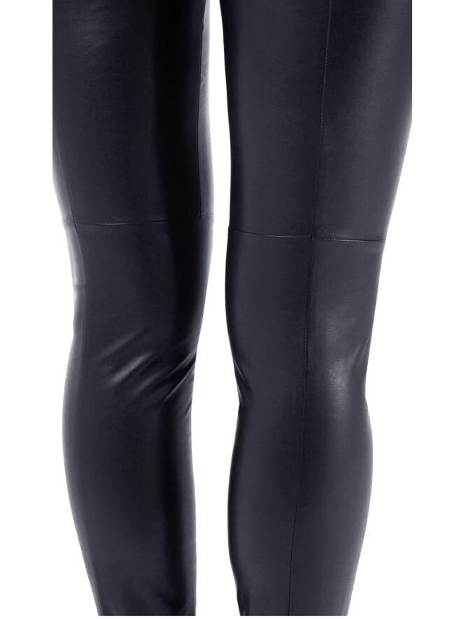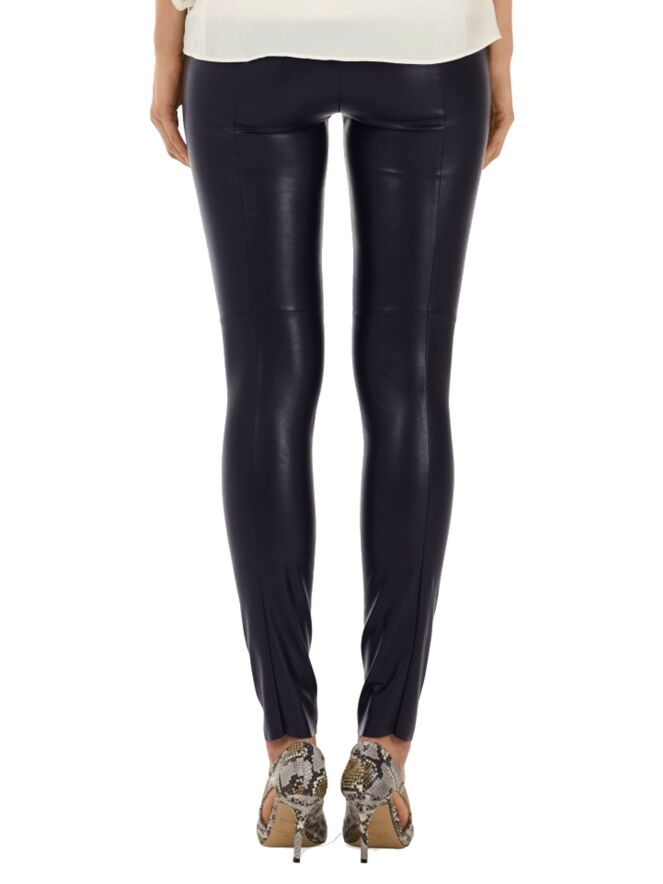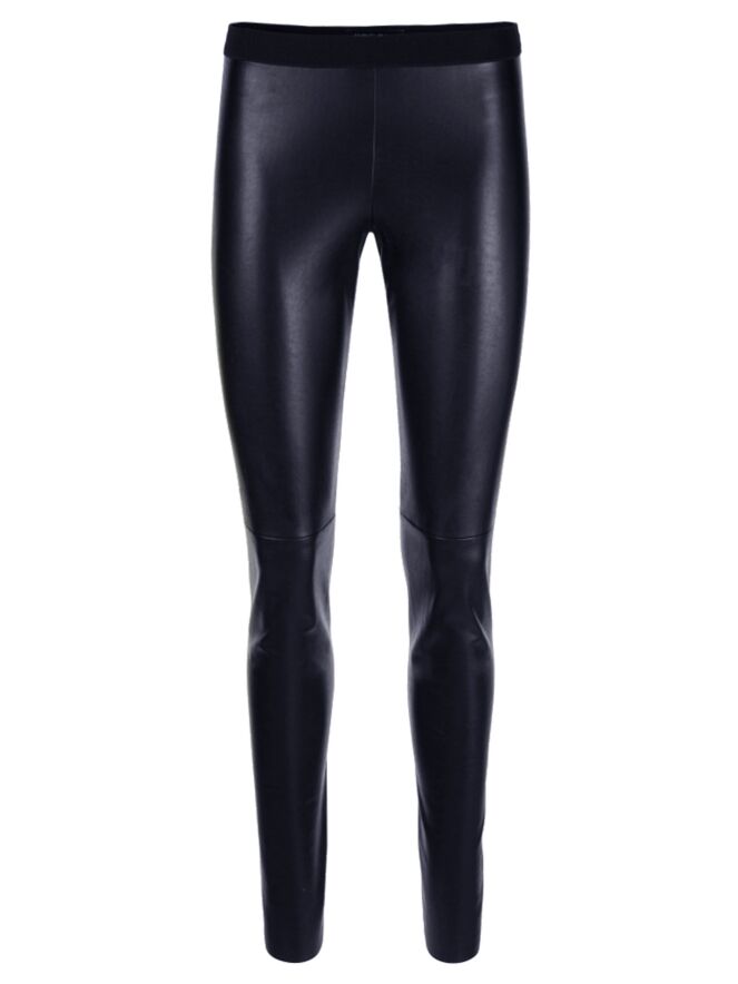 Een broek van het merk Marc Cain essentiels in een imitatie lederen stof in de kleur marine blauw. De stof is elastisch. In de taille is een elastieken band van 3 cm breed. Deze broek mag op 30 graden worden gewassen.