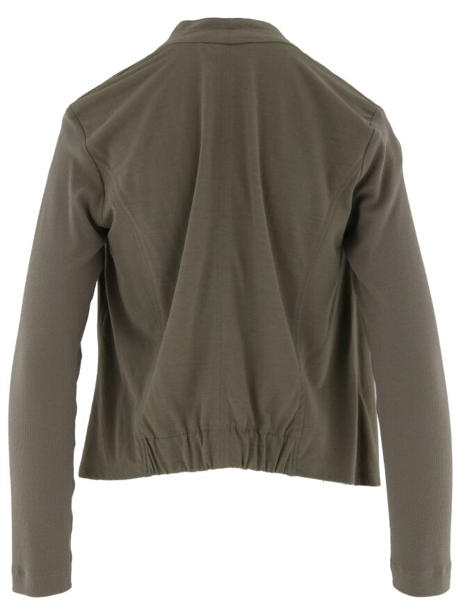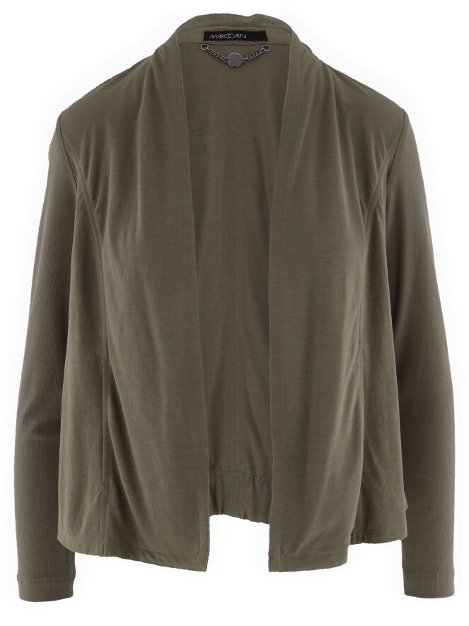 Een kort vest van Marc Cain in de kleur khaki. Het vest heeft geen sluiting. De stof van de mouwen is fijn geribbeld. Aan de achterkant is onder aan het vest een elastieken stuk ingezet. Dit vest mag op 30 graden worden gewassen.