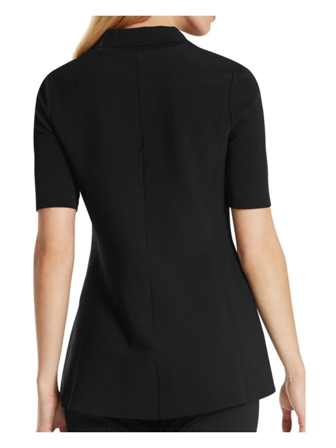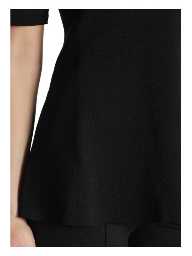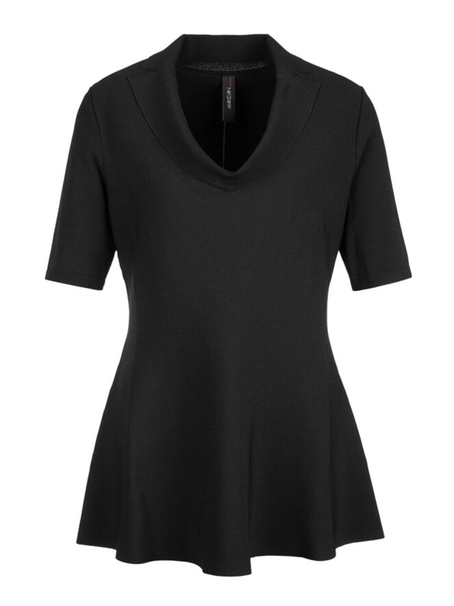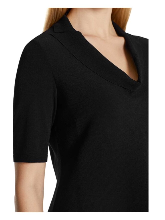 Een shirt van Marc Cain in de kleur zwart. Het shirt heeft een vallende hals met een kraag. Aan de onderkant is het shirt wijder. Dit shirt mag op 30 graden worden gewassen.