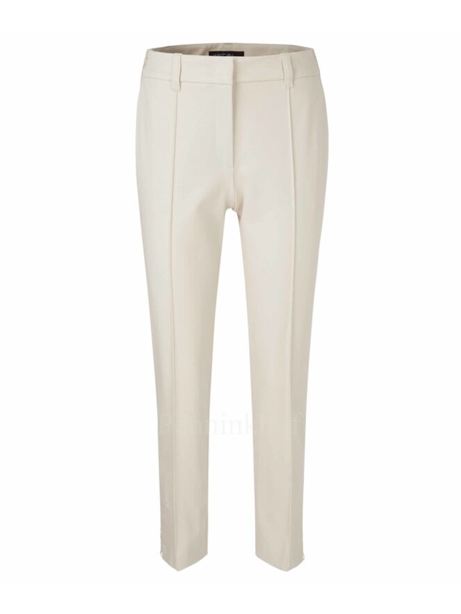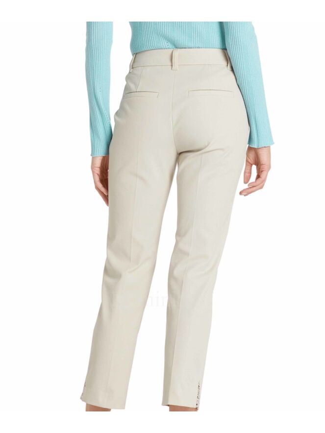 Een broek van Marc Cain in de kleur beige. Langs de rand van de steekzakken is een kanten bies. Dit detail is ook aan de onderkant van de pijpen aan de buitenzijde. Deze broek mag op 30 graden worden gewassen.