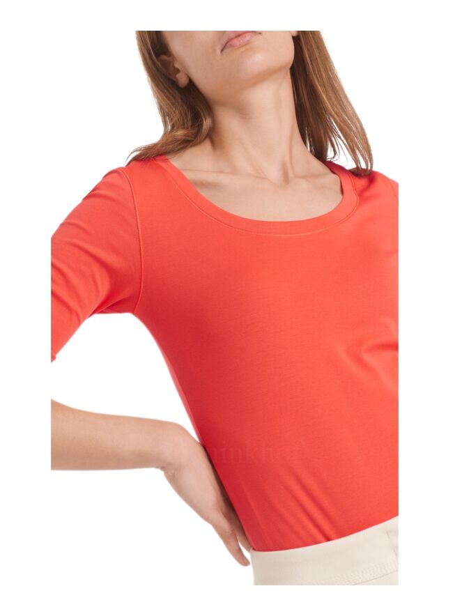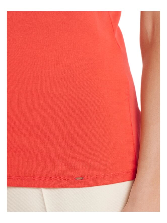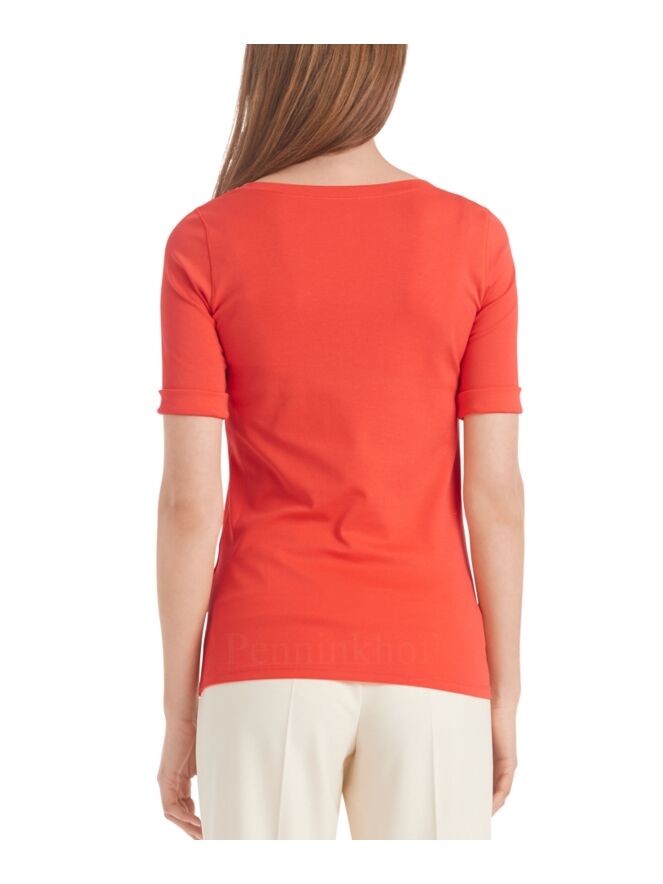 Een shirt van Marc Cain in de kleur koraalrood. De korte mouwen hebben een omslag en het shirt heeft een ronde hals. Dit shirt mag op 30 graden worden gewassen.