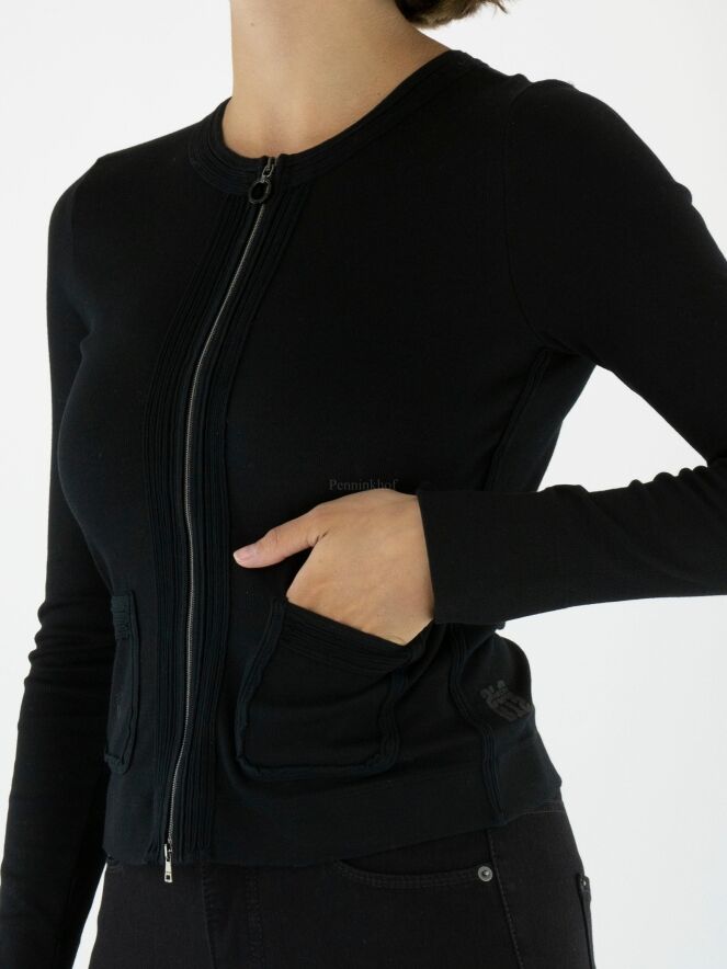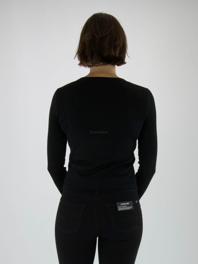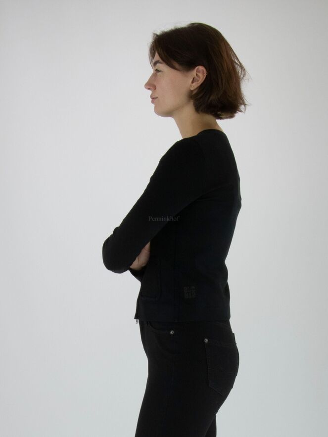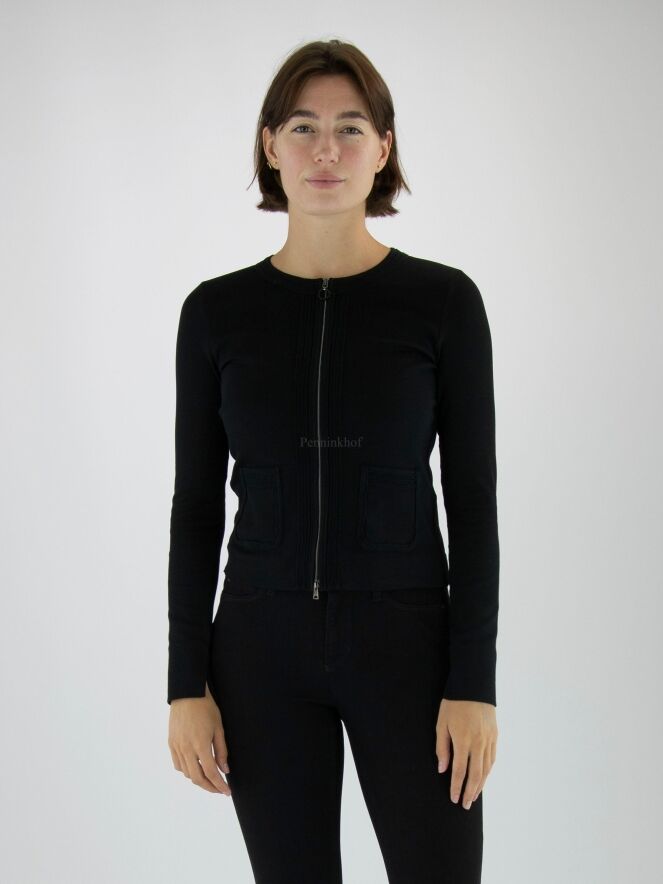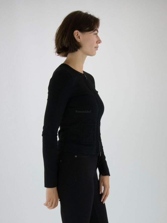 Een vest van het merk Marc Cain in de kleur zwart. Het vest heeft lange mouwen en een ronde hals. Langs de hals en de rits sluiting loopt een geribbelde band. Aan het uiteinde van de mouwen is een kort splitje. Dit vest mag op 30 graden worden gewassen.