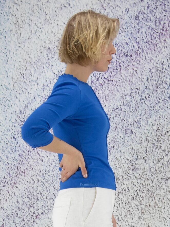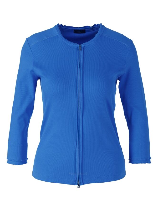 Een vest van het merk Marc Cain in de kleur blauw. Het vest heeft half lange mouwen en een ronde hals. Langs de hals en de rits sluiting loopt een geribbelde band. Dit vest mag op 30 graden worden gewassen.