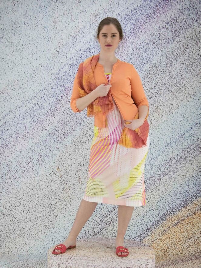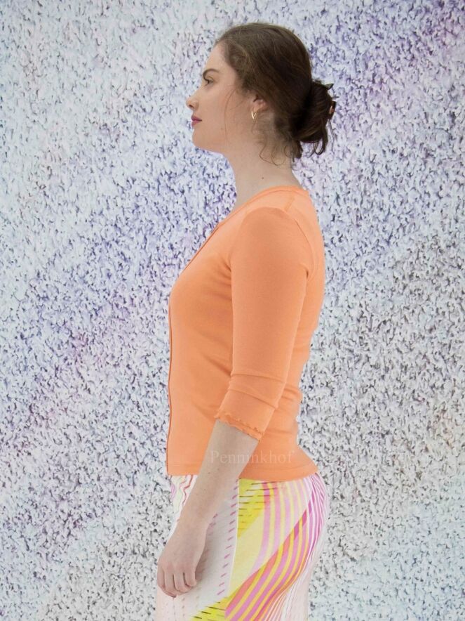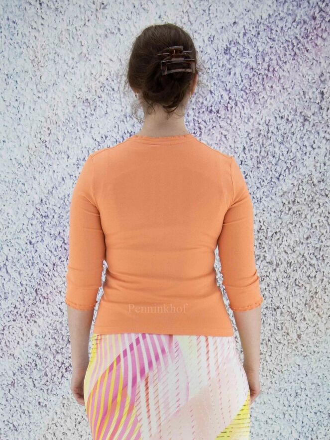 Een vest van het merk Marc Cain in de kleur oranje. Het vest heeft half lange mouwen en een ronde hals. Langs de hals en de rits sluiting loopt een geribbelde band. Dit vest mag op 30 graden worden gewassen.