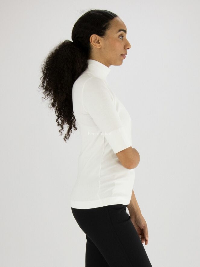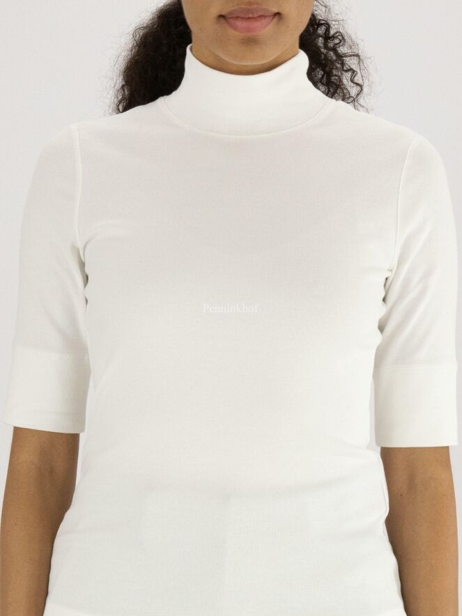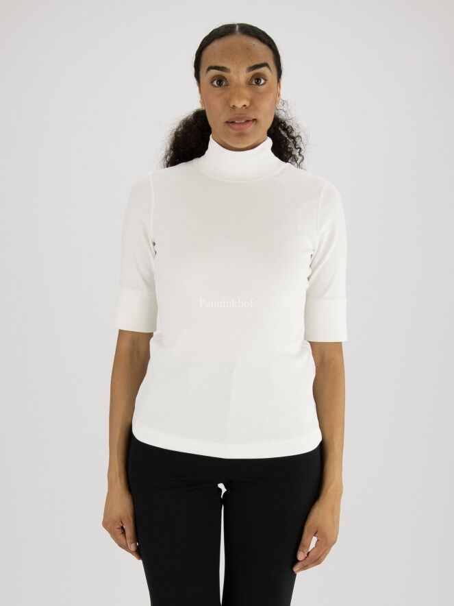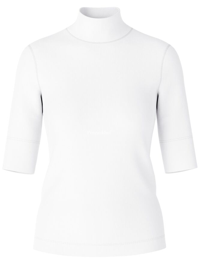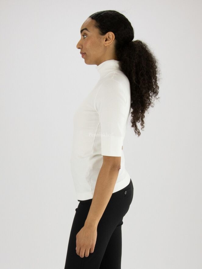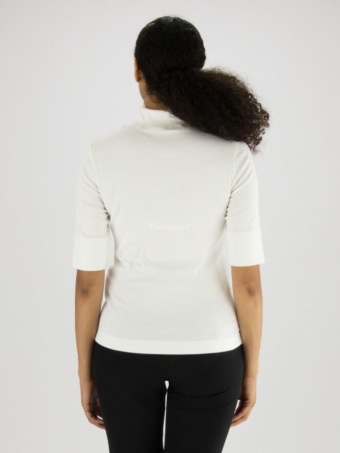 Een shirt van het merk Marc Cain in de kleur roomwit. Het shirt heeft korte mouwen en een turtlehals. Dit shirt mag op 30 graden worden gewassen.