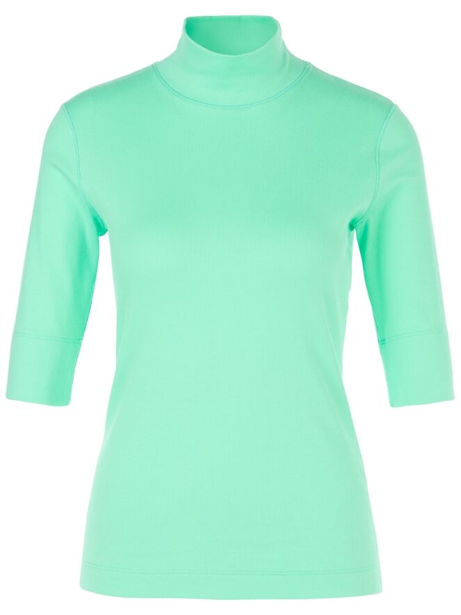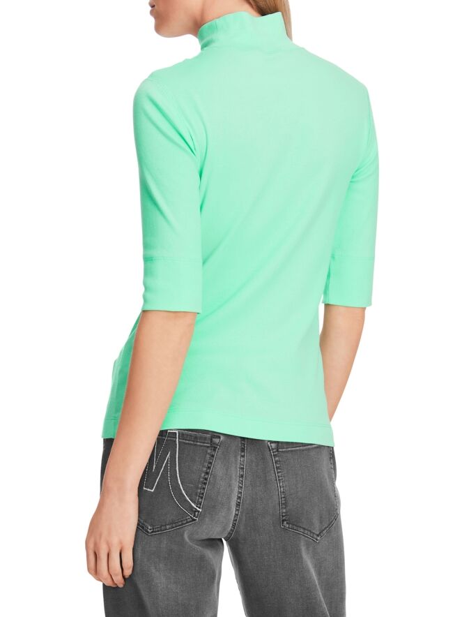 Een shirt van het merk Marc Cain in een heldere pastelgroene kleur. Het shirt heeft korte mouwen en een turtlehals. Dit shirt mag op 30 graden worden gewassen.