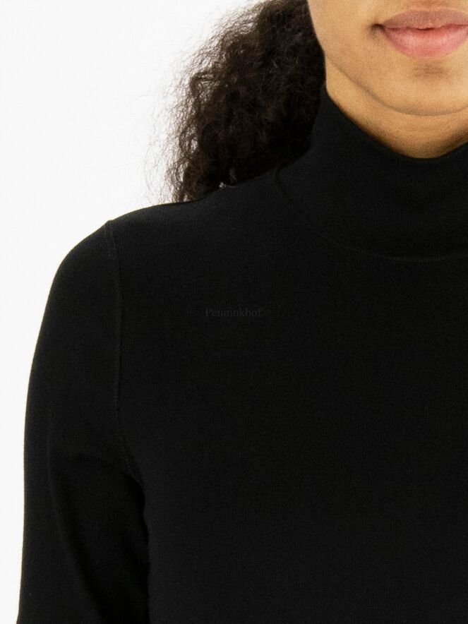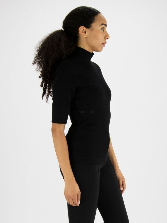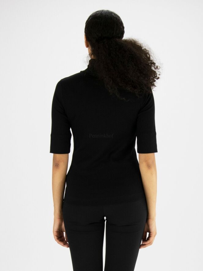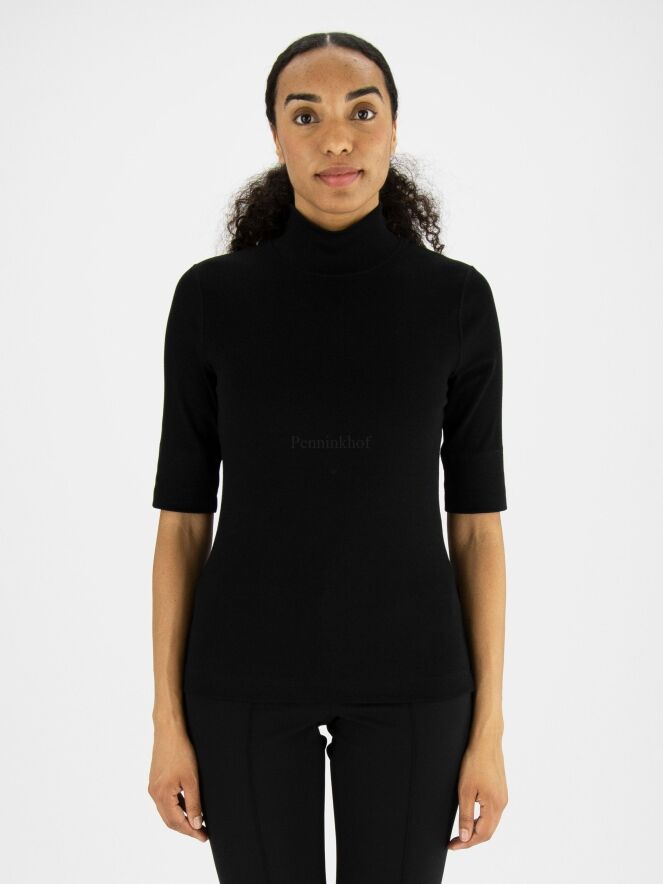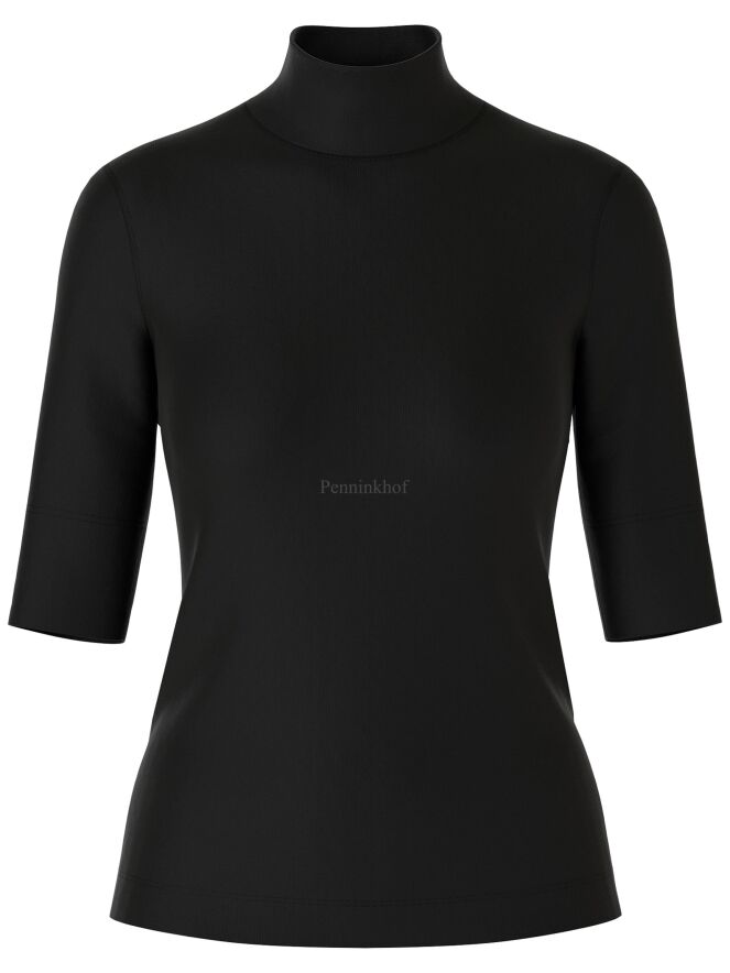 Een shirt van het merk Marc Cain in de kleur zwart. Het shirt heeft korte mouwen en een turtlehals. Dit shirt mag op 30 graden worden gewassen.