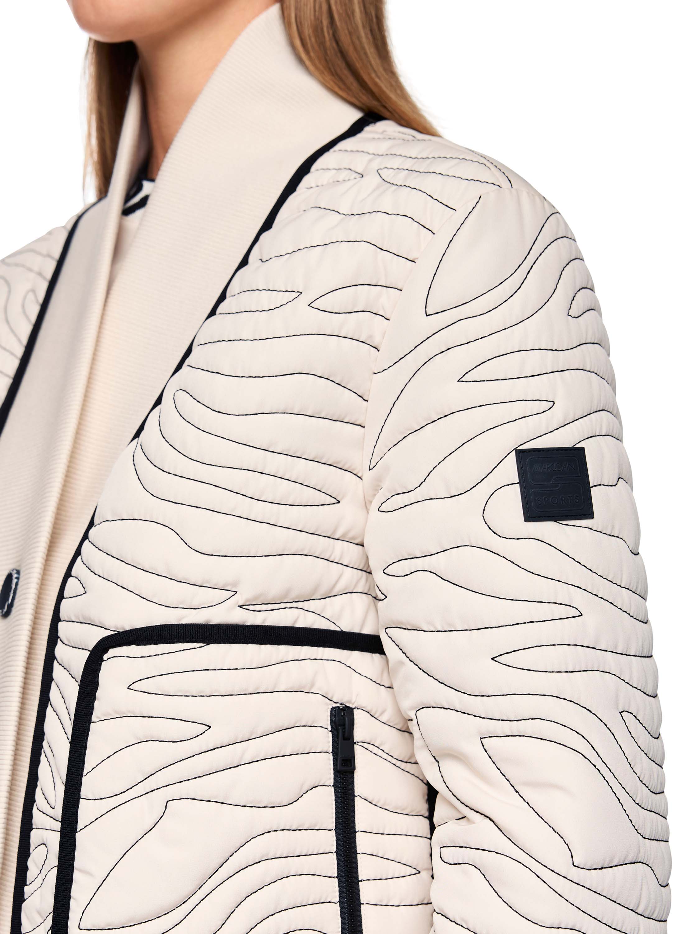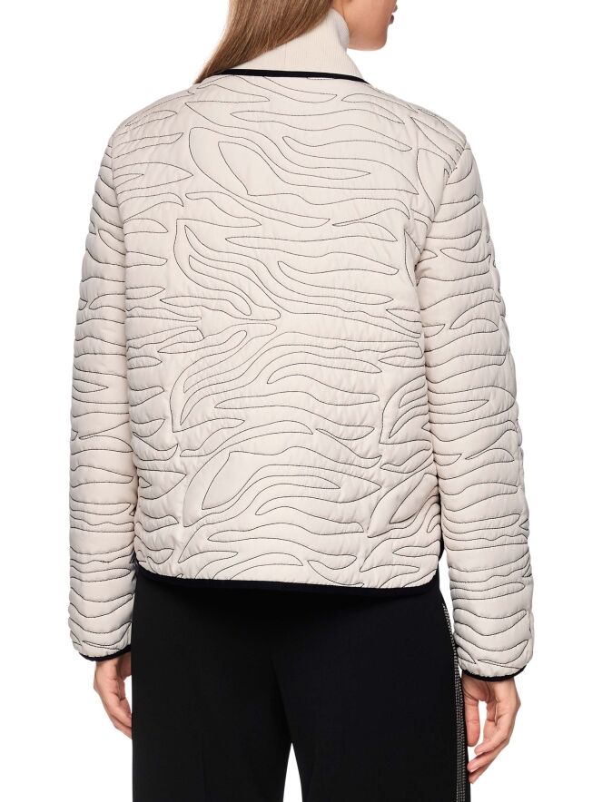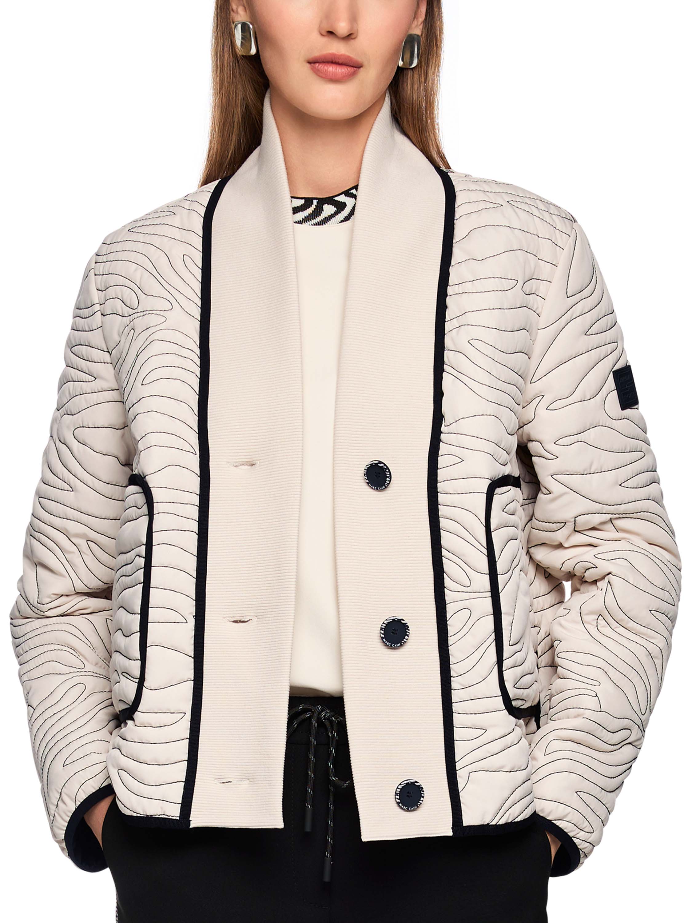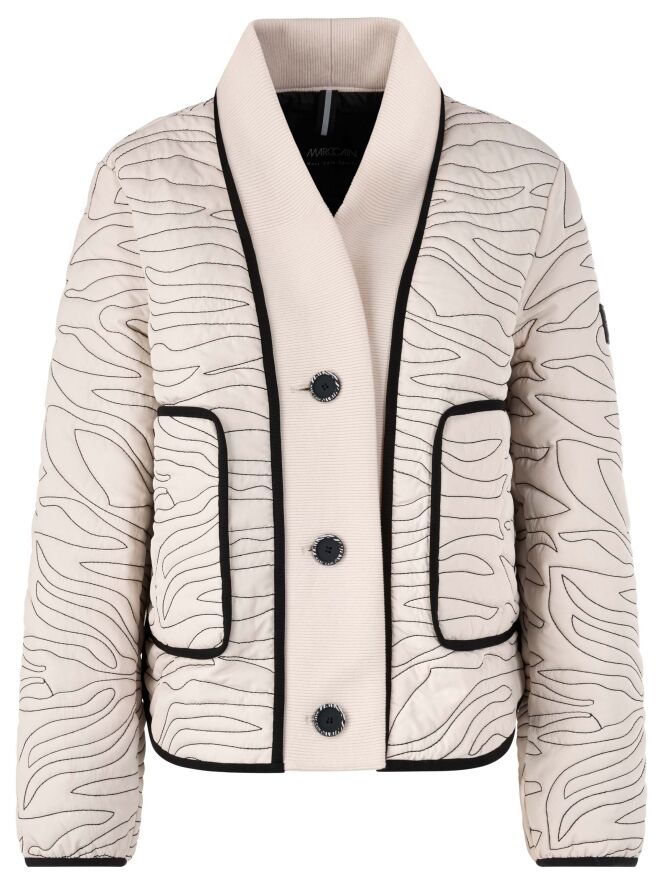 Een coat van Marc Cain in een beige kleur met decoratieve golvende stiknaden. Aan de voor- en achterkant zijn zwarte verticale biezen. Dit detail is ook langs de randen van de zakken. De kraag, die doorloopt naar de onderkant, is in een fijn geribbelde tricot boord. De coat heeft een sluiting met 3 knopen. Deze coat mag op 30 graden worden gewassen.