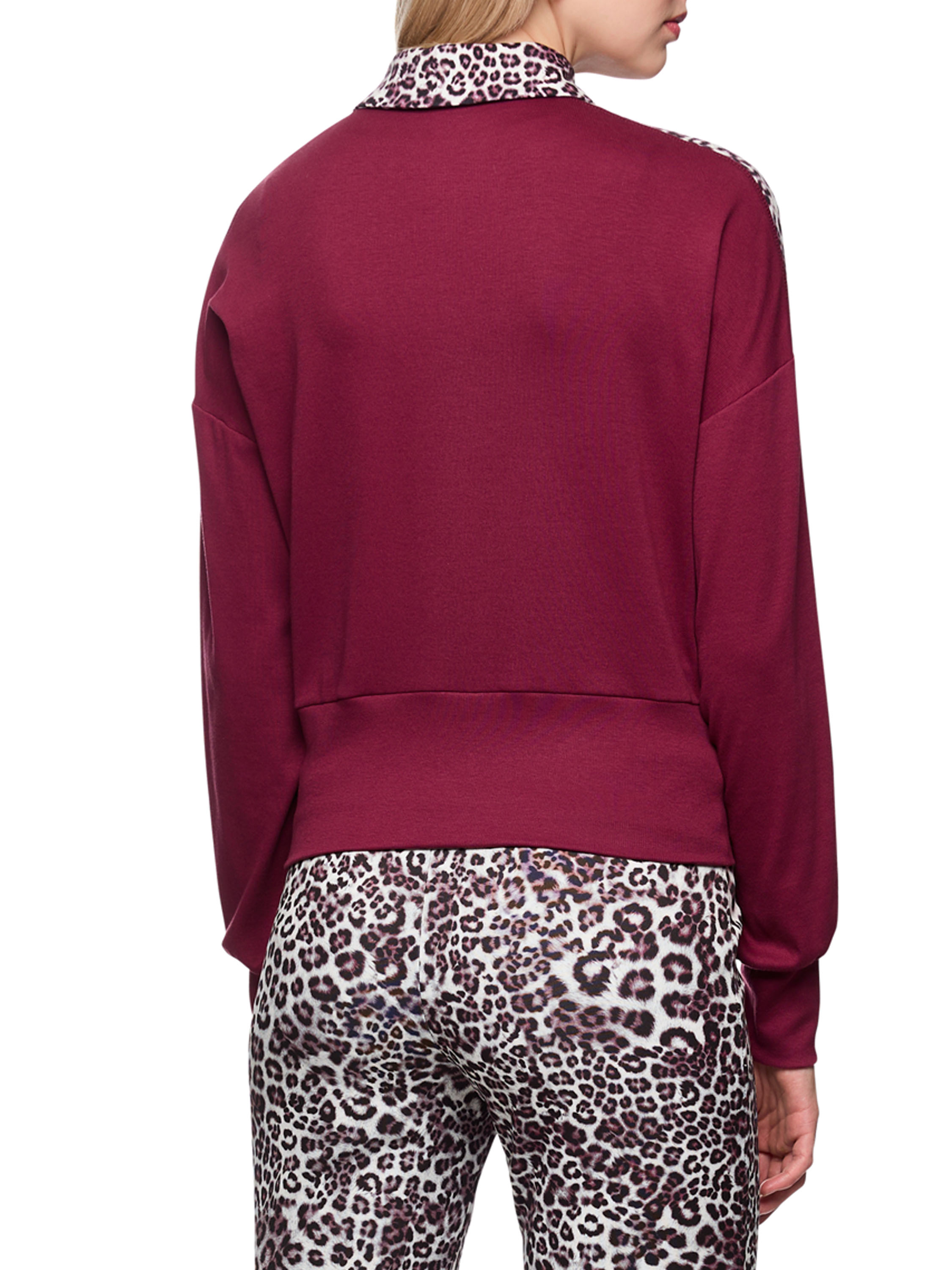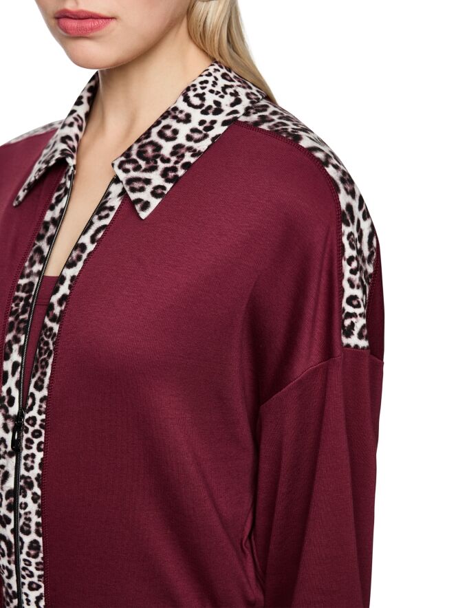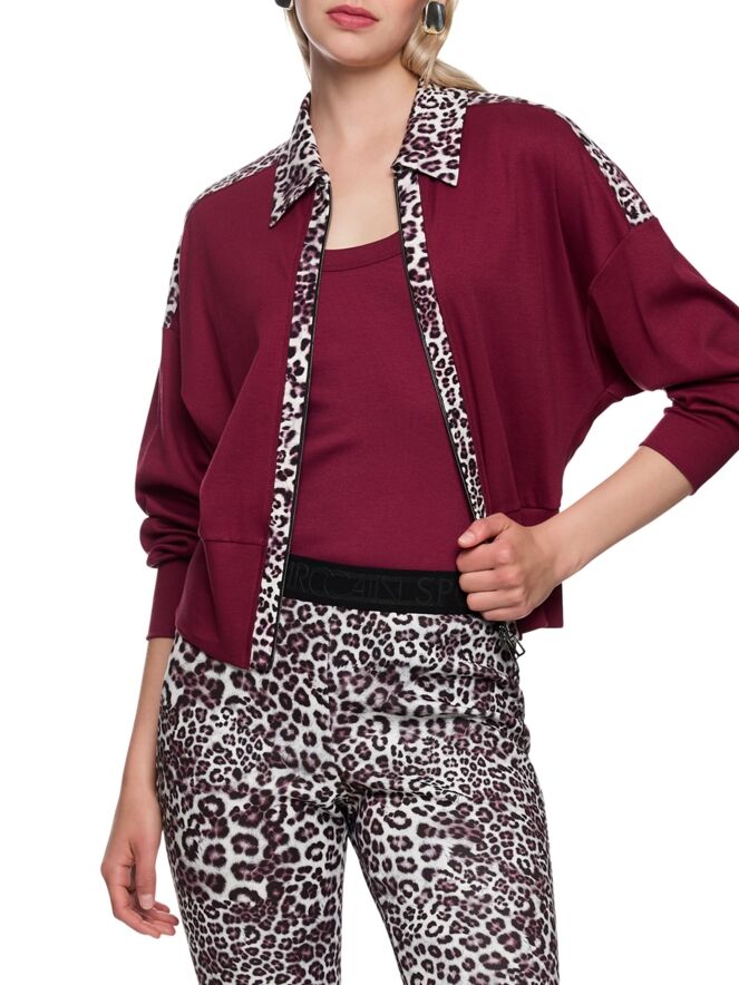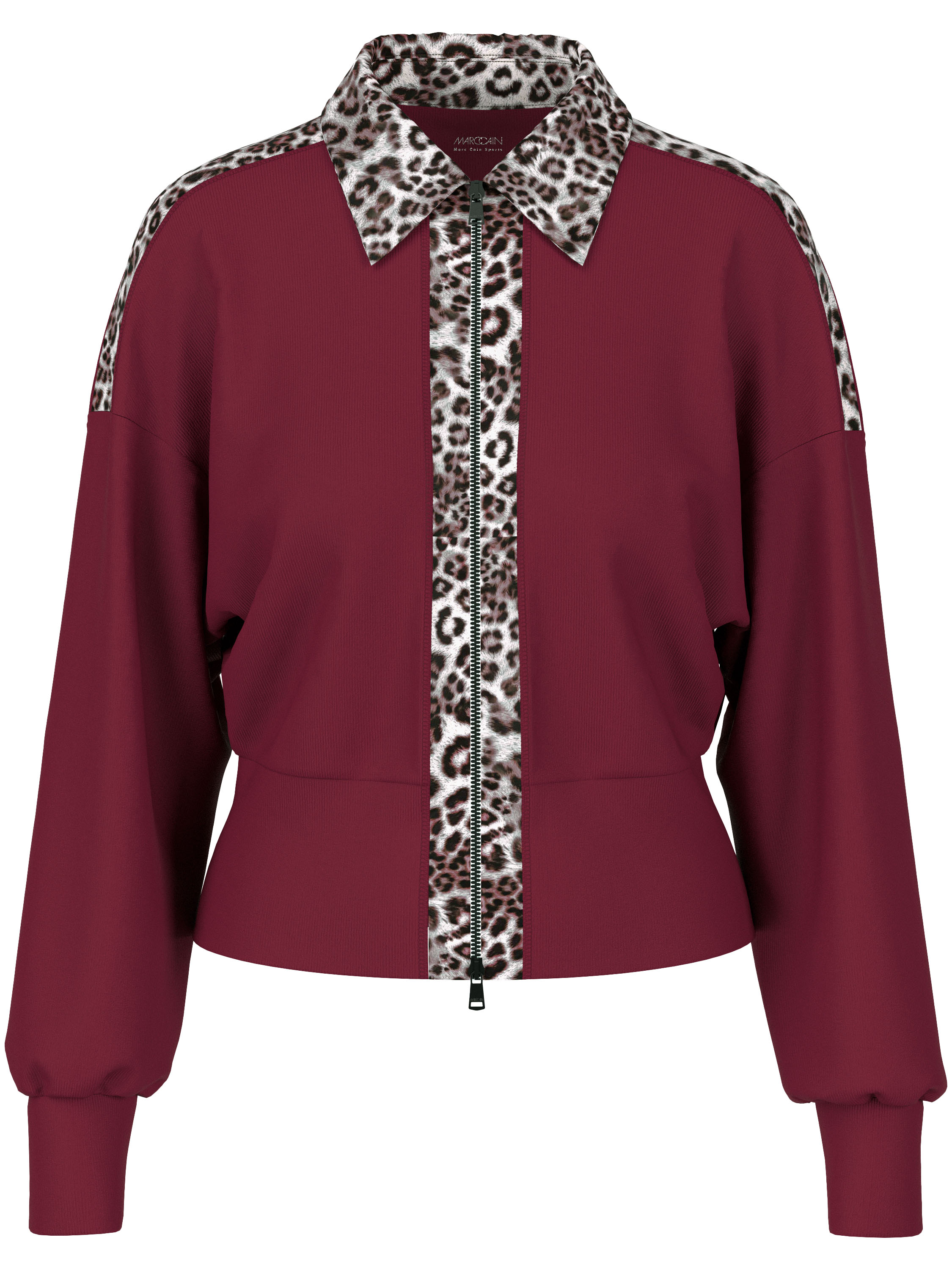 Een kort vest van Marc Cain in een fijn geribbelde stof in een bordeauxrode kleur. Aan beide kanten van de ritssluiting is een bies in een panterprint met meerdere tinten grijs, bordeauxrood en roomwit. Deze print is ook terug te vinden in de kraag en op de schouders. Aan de onderkant is een brede band met een stiknaad die een blousend effect geeft. Het vest heeft vleermuismouwen en mag op 30 graden worden gewassen.