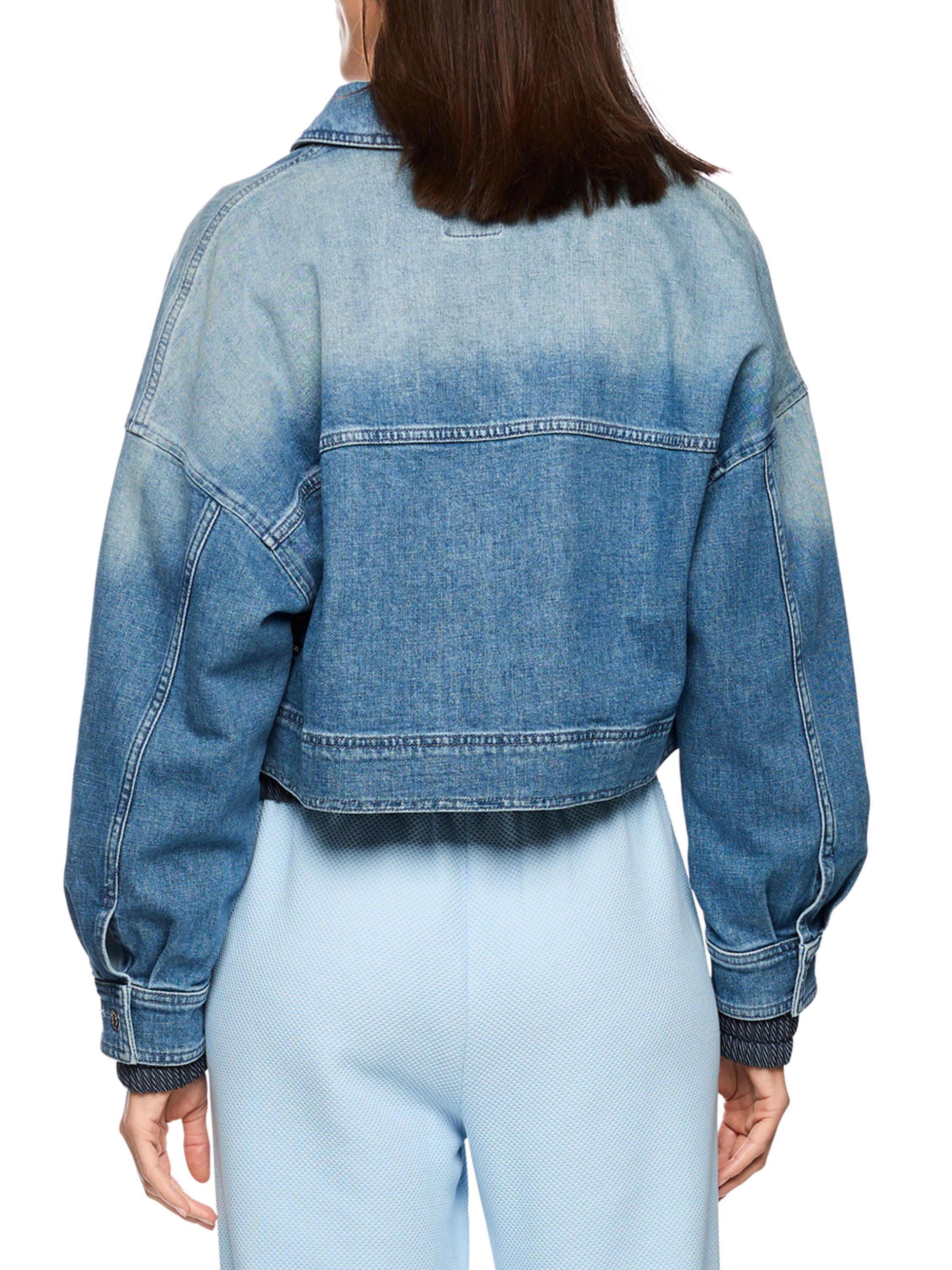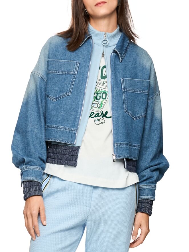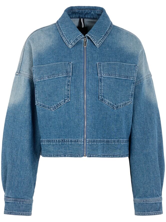 Een korte jeansblazer van Marc Cain in een basic jeansblauwe kleur. De blazer heeft een ritssluiting en twee grote borstzakken. Deze jeansblazer kan op 30 graden worden gewassen.