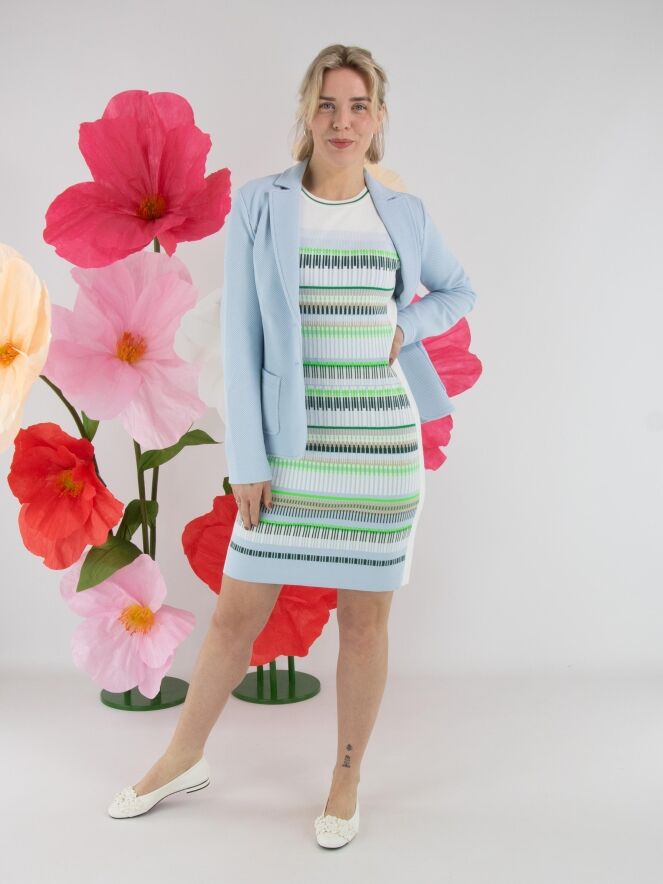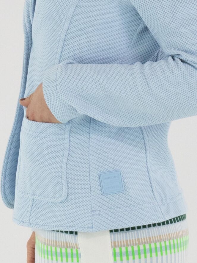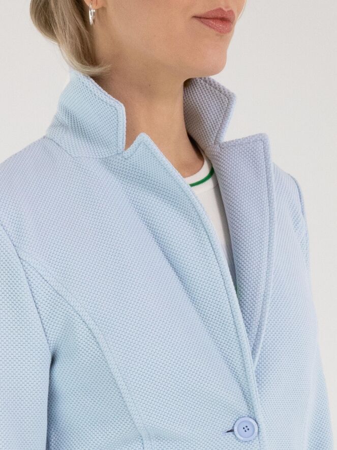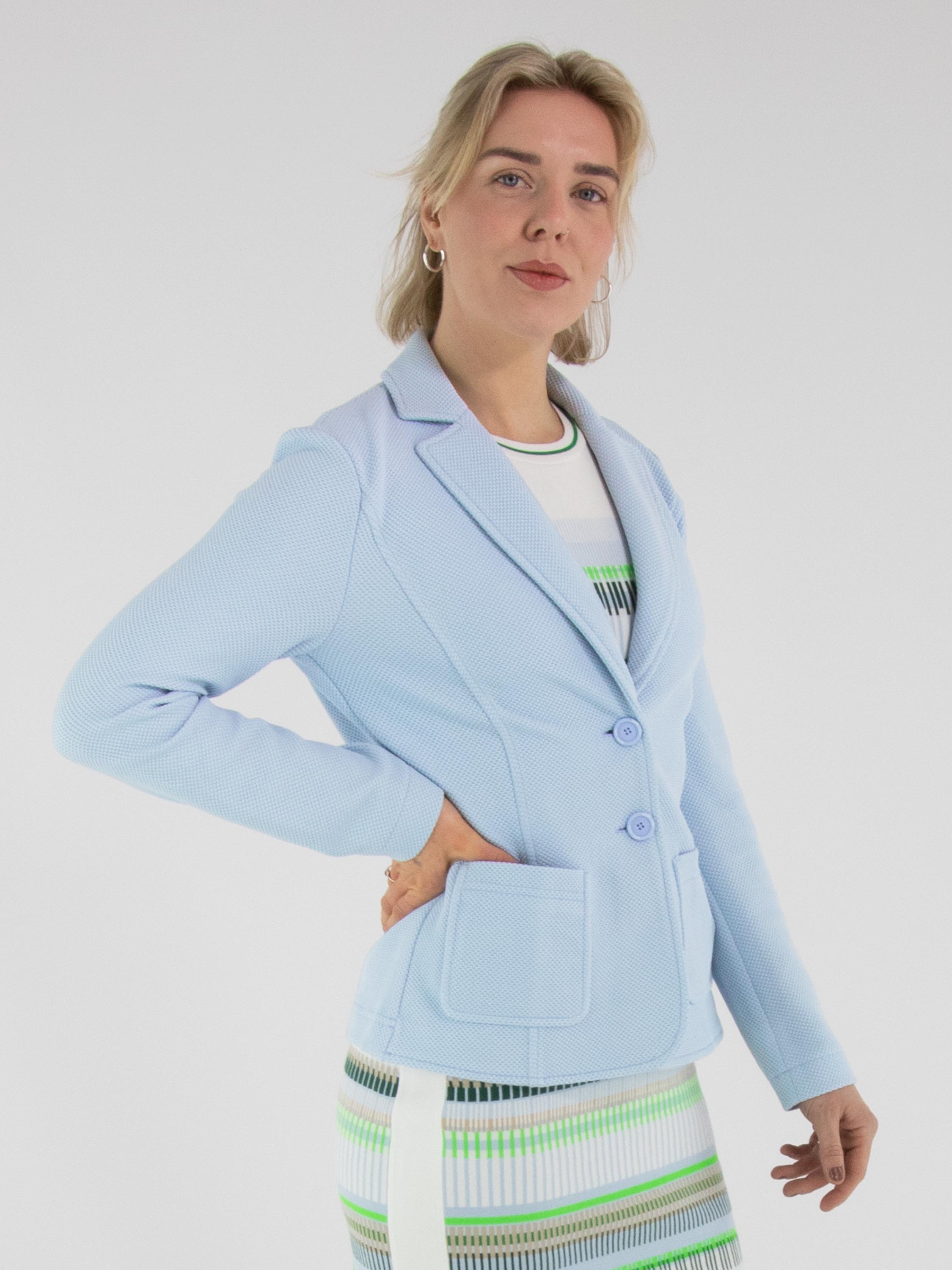 Een blazer van Marc Cain in een korrelstructuur in de kleur bleu. De blazer is licht getailleerd en heeft een sluiting met twee knopen. Deze blazer kan op 30 graden worden gewassen.