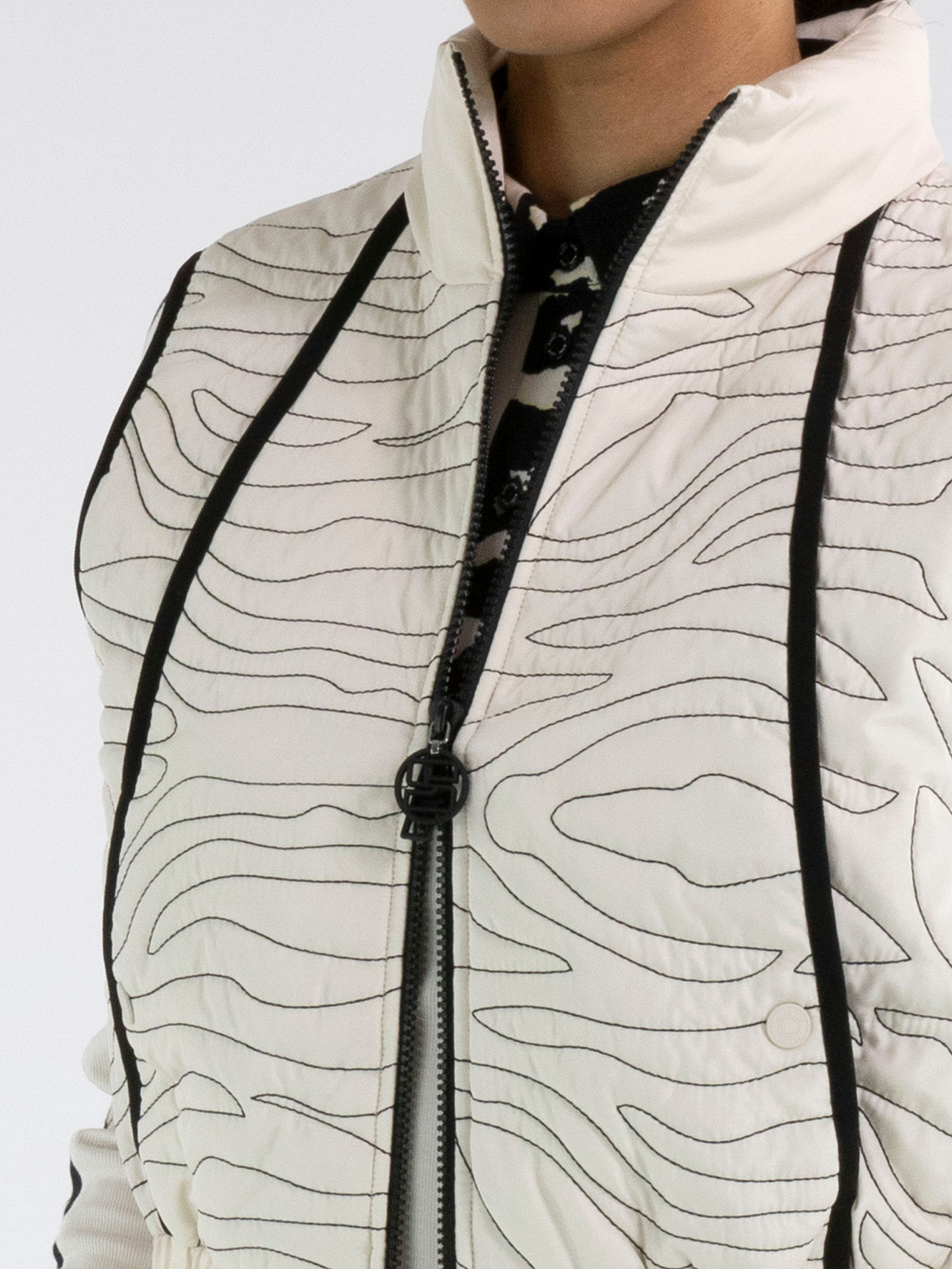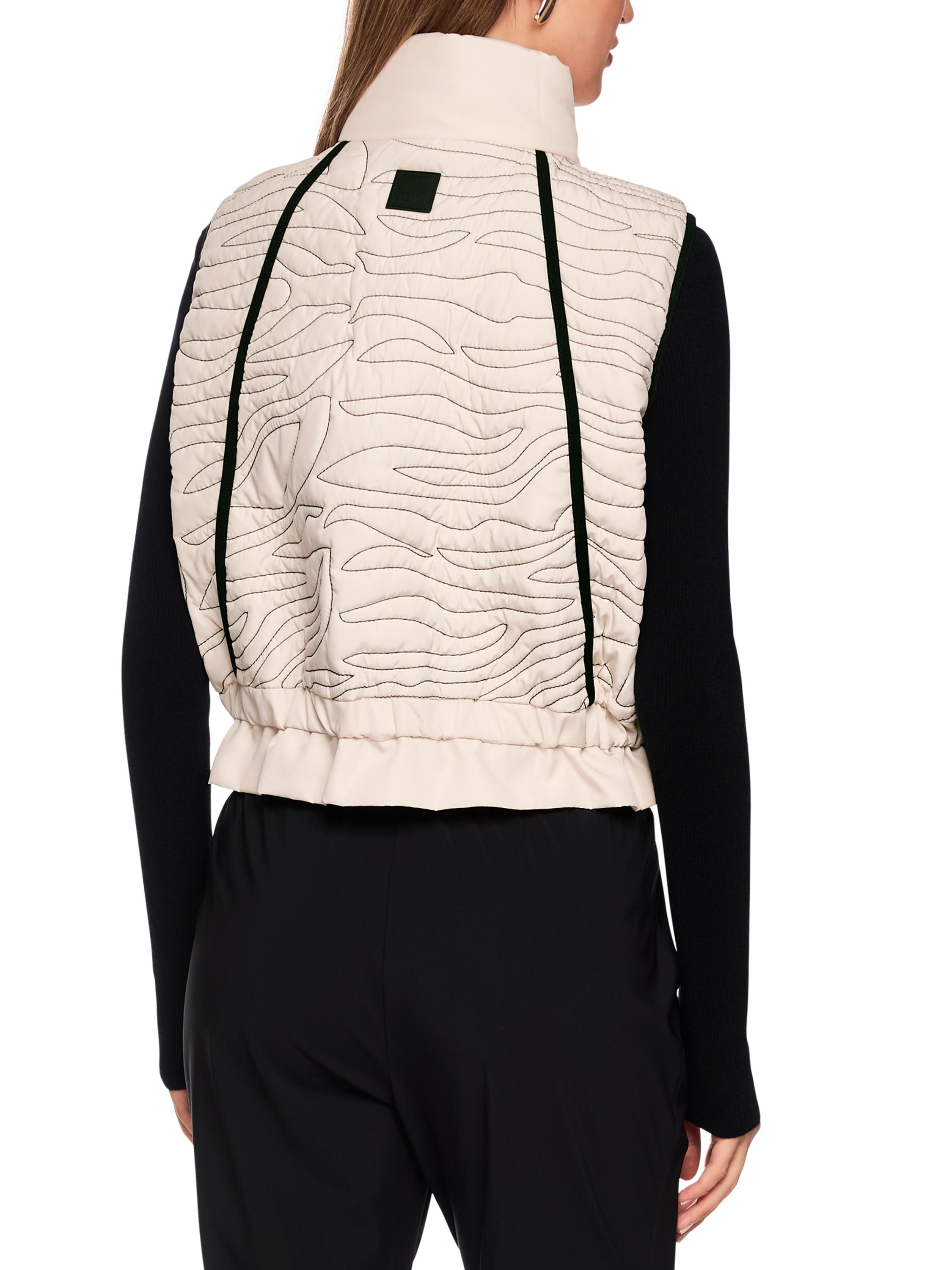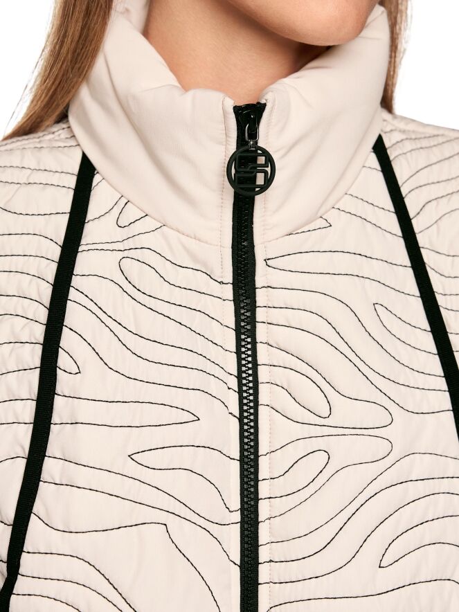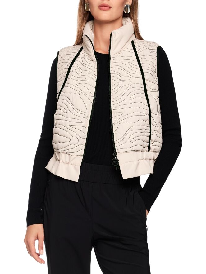 Een bodywarmer van Marc Cain in een beige kleur met decoratieve golvende stiknaden. Aan de voor- en achterkant zijn zwarte verticale biezen. De kraag en de boord aan de onderkant zijn in een mat satijnen stof, waarbij aan de onderkant de stof langs de stiknaad fijn geplooid is. Boven deze stiknaad is een elastische geplooide bies. Deze bodywarmer mag op 30 graden worden gewassen.