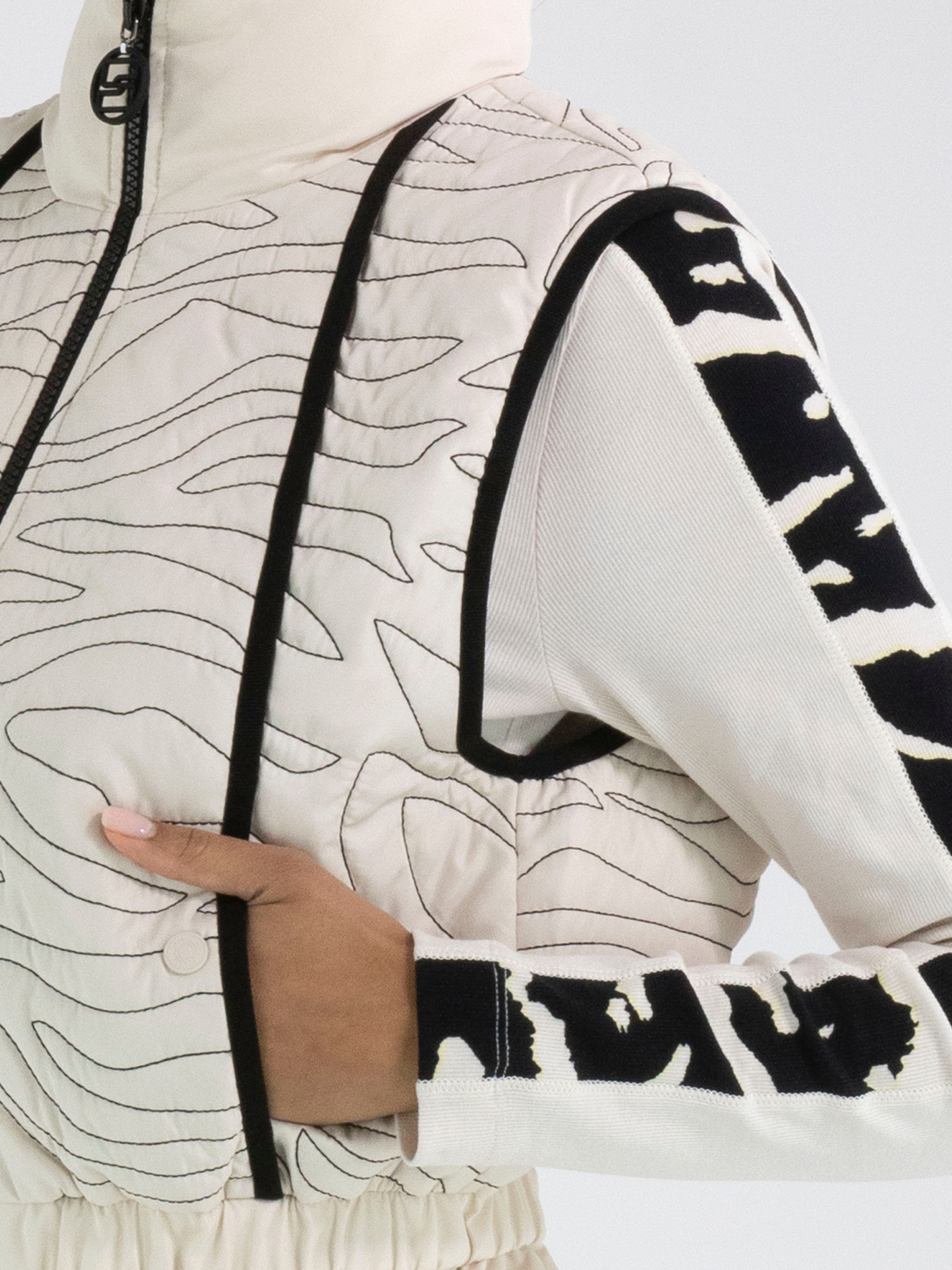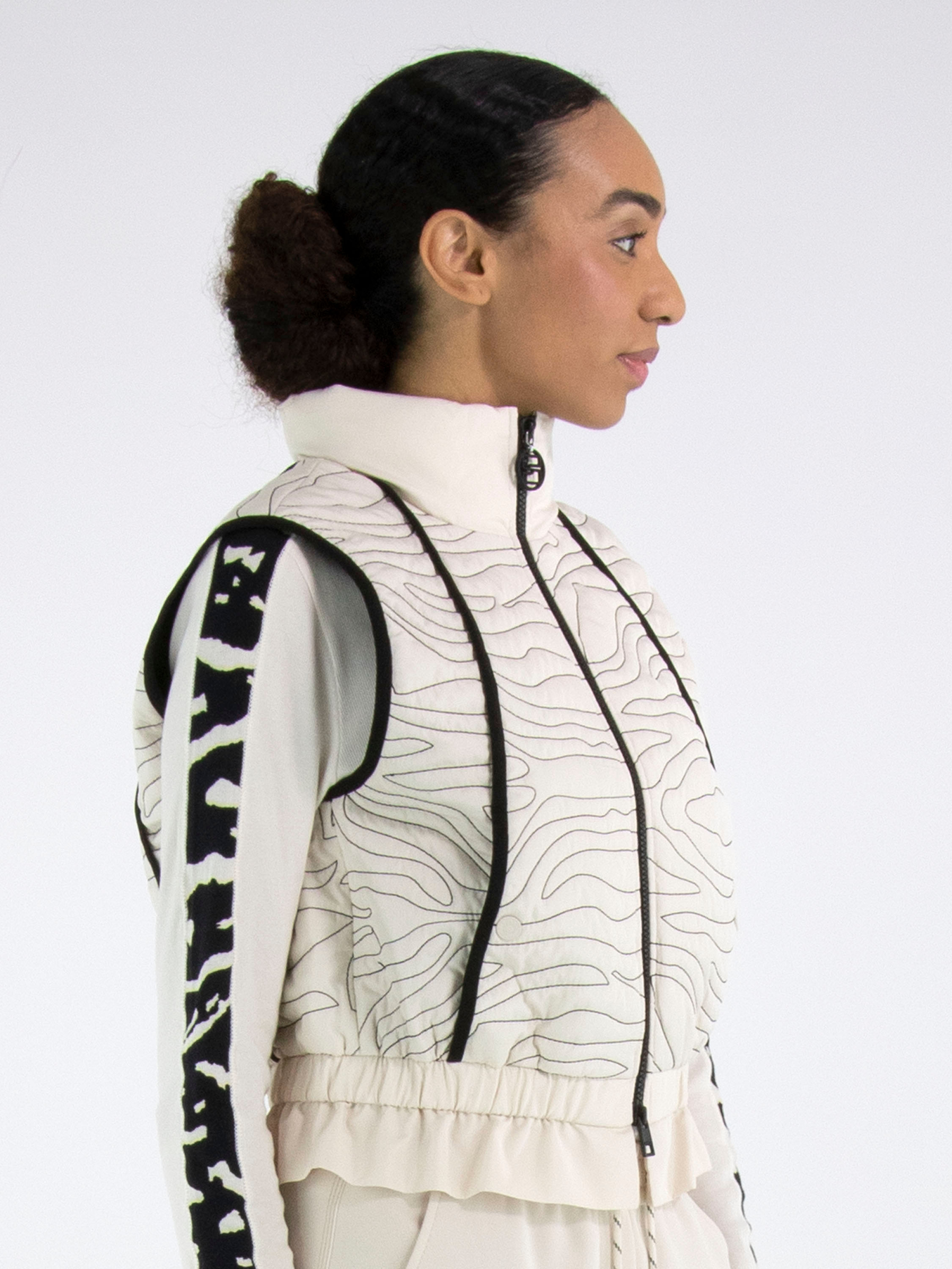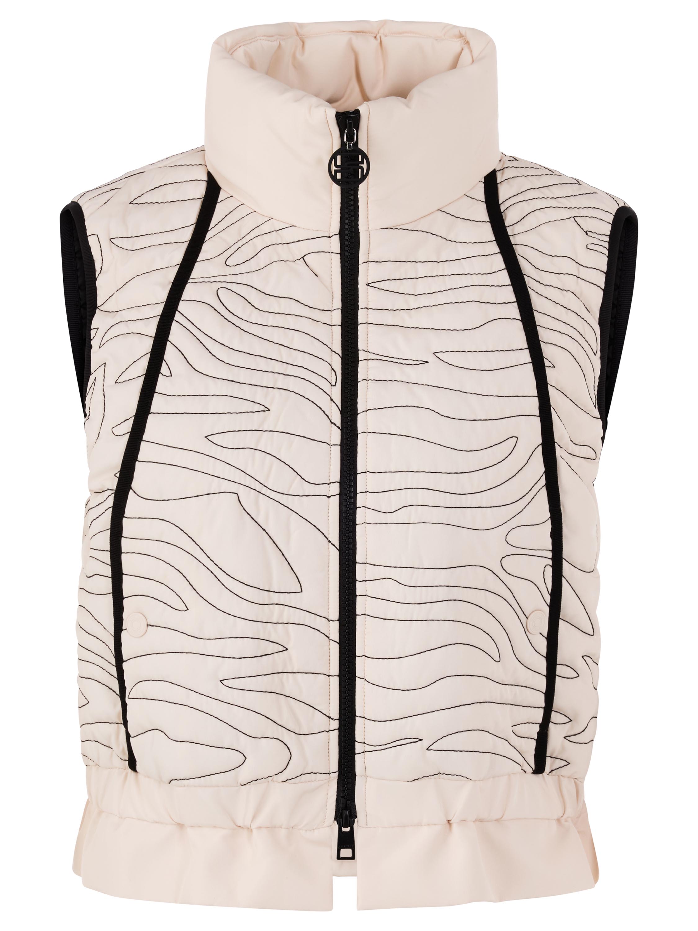 Een bodywarmer van Marc Cain in een beige kleur met decoratieve golvende stiknaden. Aan de voor- en achterkant zijn zwarte verticale biezen. De kraag en de boord aan de onderkant zijn in een mat satijnen stof, waarbij aan de onderkant de stof langs de stiknaad fijn geplooid is. Boven deze stiknaad is een elastische geplooide bies. Deze bodywarmer mag op 30 graden worden gewassen.
