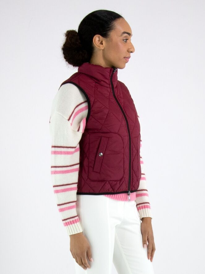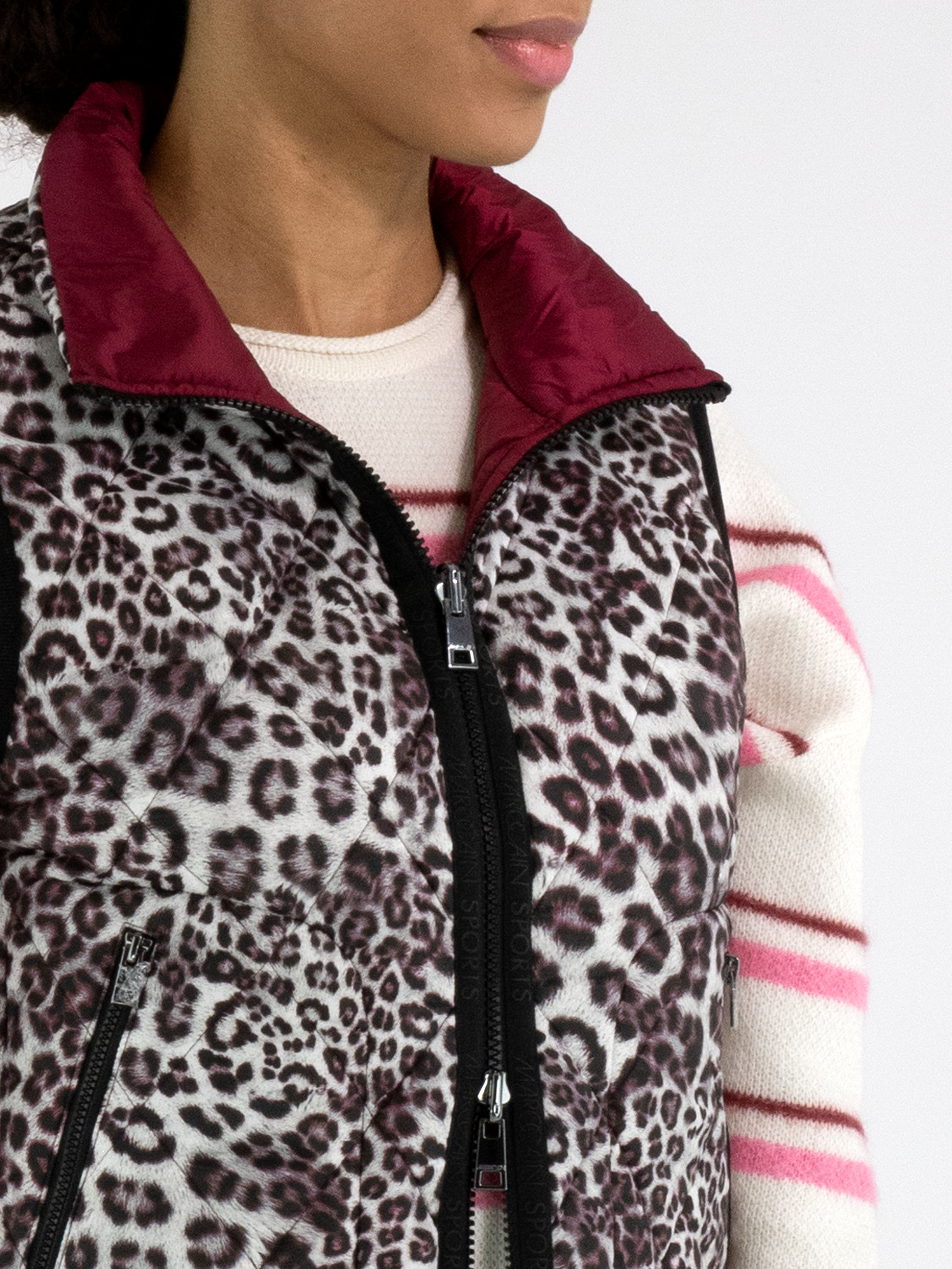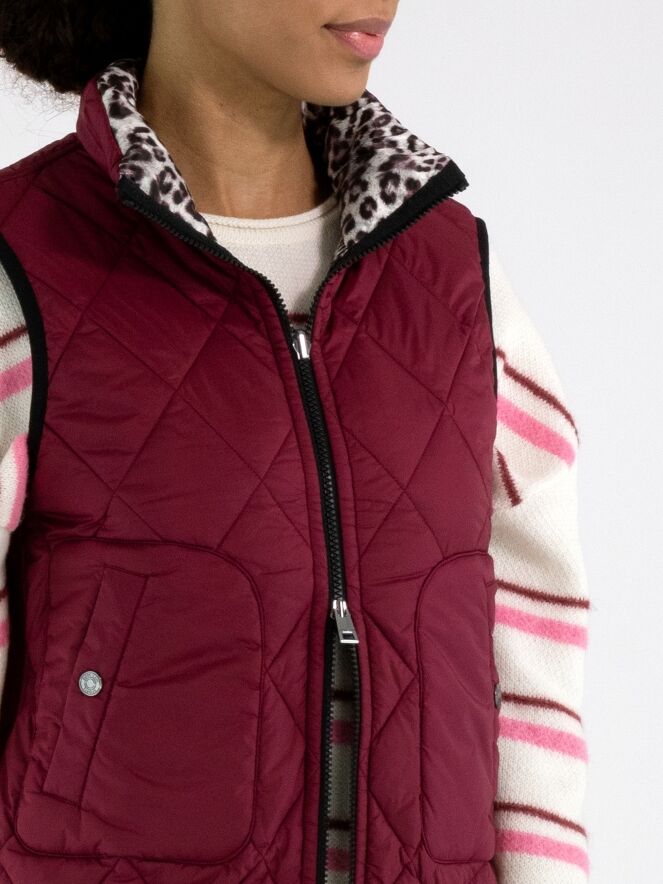 Een reversible gestepte bodywarmer met aan één zijde een uni bordeauxrode kleur en aan de andere zijde een panterprint met meerdere tinten grijs, bordeauxrood en roomwit. Langs beide kanten van de ritssluiting is een zwarte bies. De randen langs de mouwinzet en aan de onderkant hebben een zwarte bies. De zakken ter hoogte van de taille hebben een ritssluiting. Deze bodywarmer mag op 30 graden worden gewassen.