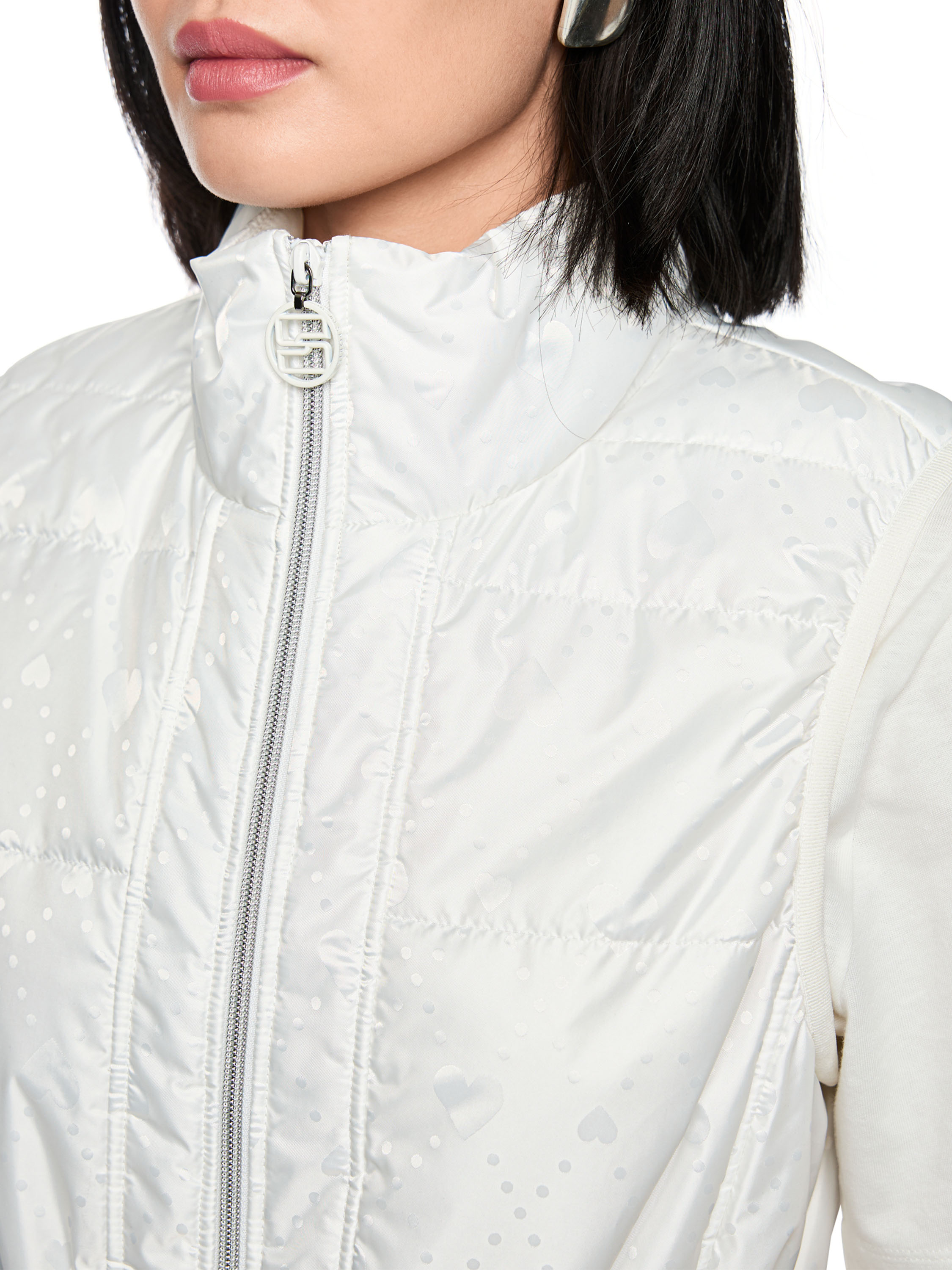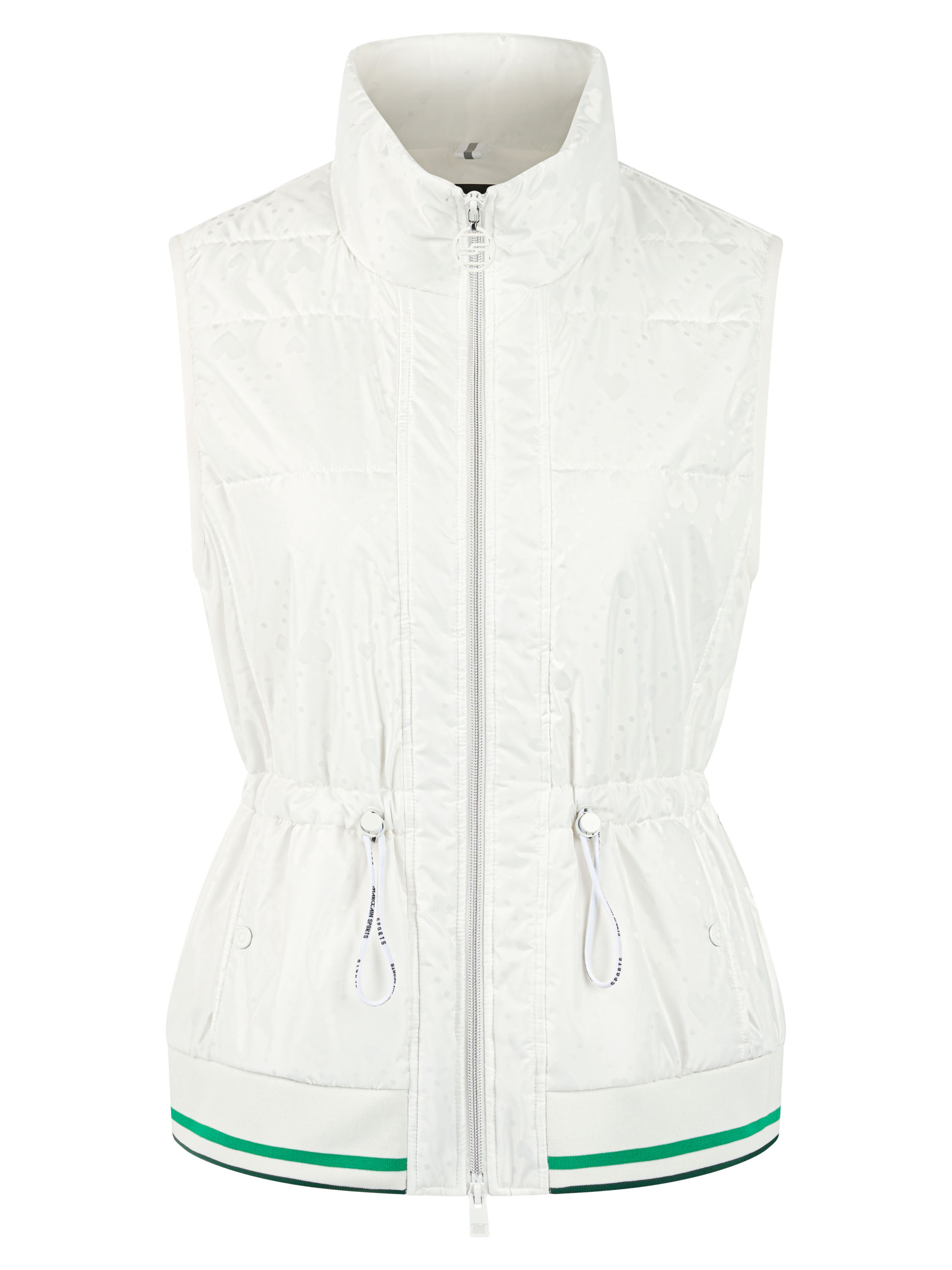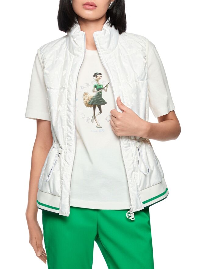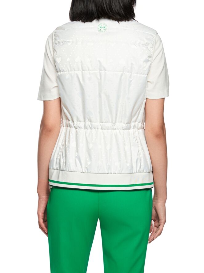 Een bodywarmer van Marc Cain in een roomwitte kleur. In de stof zijn ton-sur-ton hartjes gelaserd. Ter hoogte van de taille is een koord in tunnelverwerking aangebracht, waarmee een plooieffect kan worden gecreëerd. De steekzakken zijn voorzien van een drukknoopsluiting. Aan de onderkant bevindt zich een fijn geribbelde tricot boord met een streeppatroon in de kleuren heldergroen, wit en donkergroen. De bodywarmer heeft een ritssluiting en kan op 30 graden worden gewassen.
