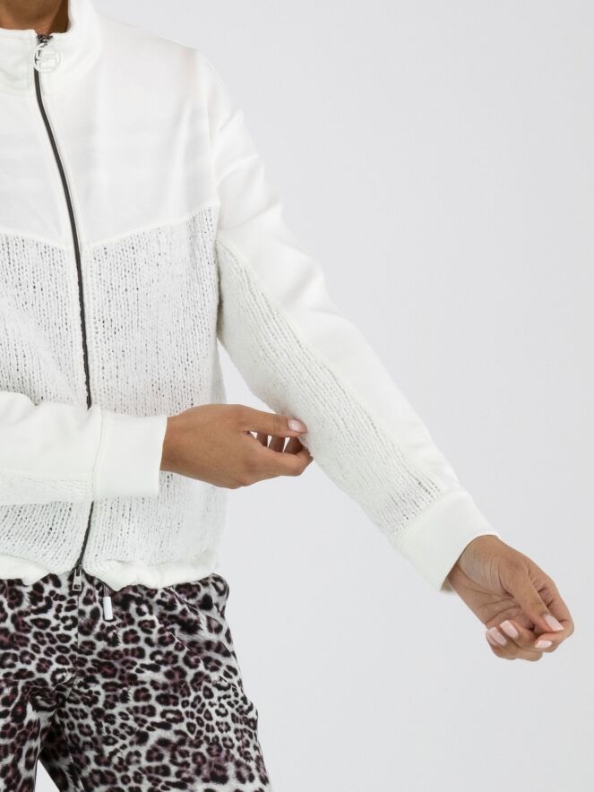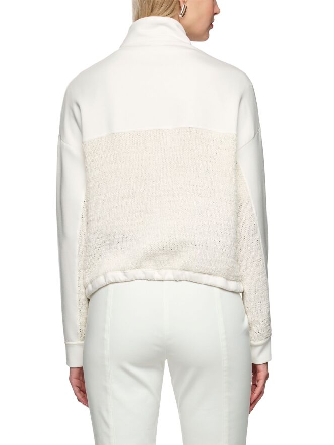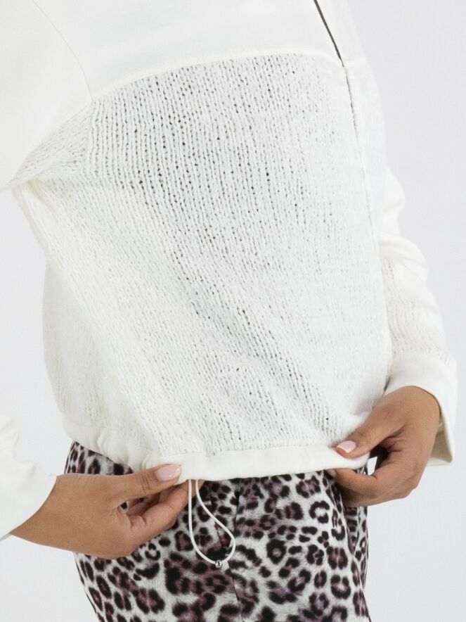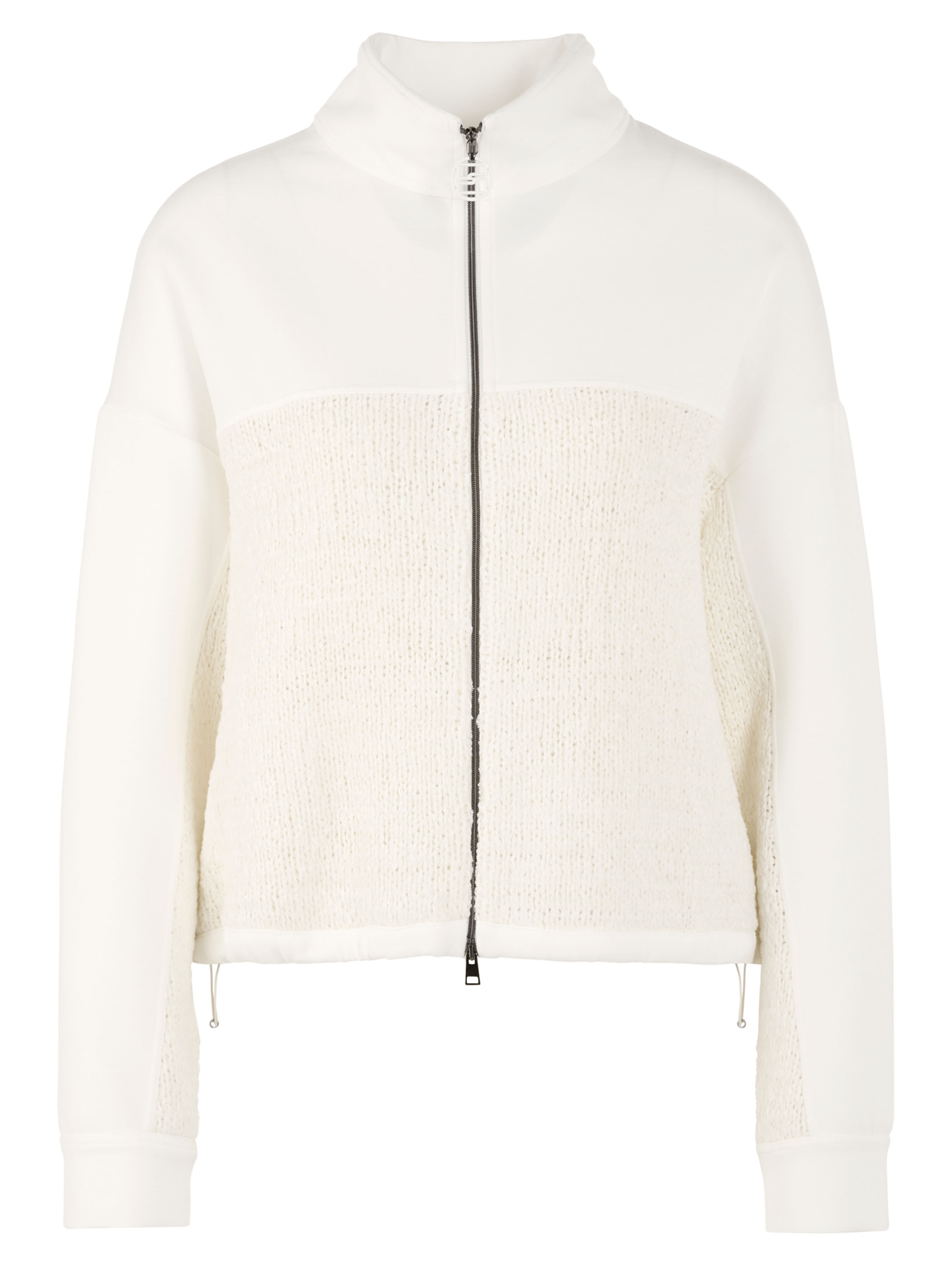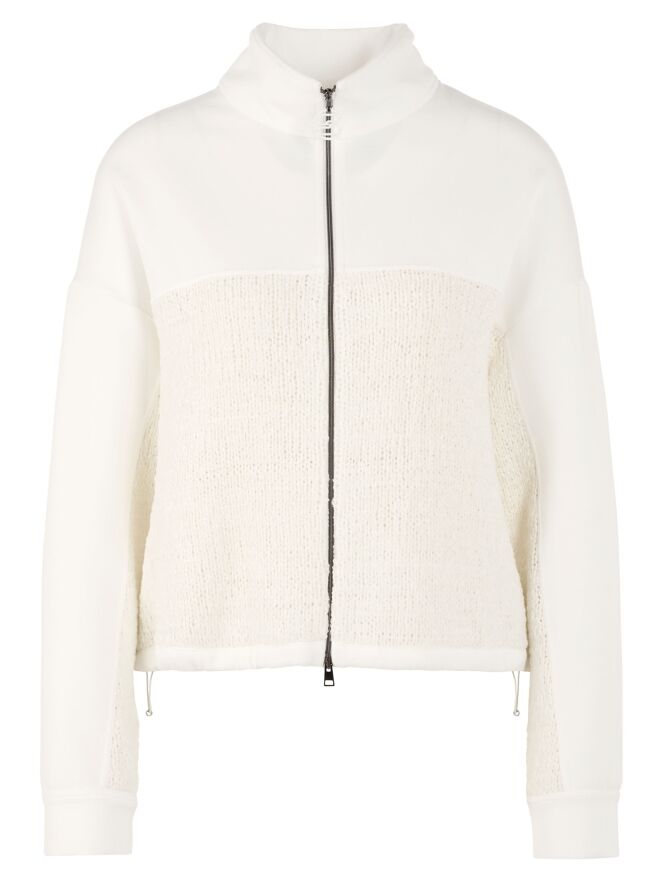 Een vest van Marc Cain in de kleur roomwit. Het bovenste deel tot de buste en de lange mouwen zijn in een scuba kwaliteit. Vanaf de buste is het vest gebreid. Aan de onderkant is een bies met een verstelbaar koord in een tunnelverwerking waarmee een plooi-effect kan worden gecreëerd. Het vest heeft een ritssluiting en mag op 30 graden worden gewassen.