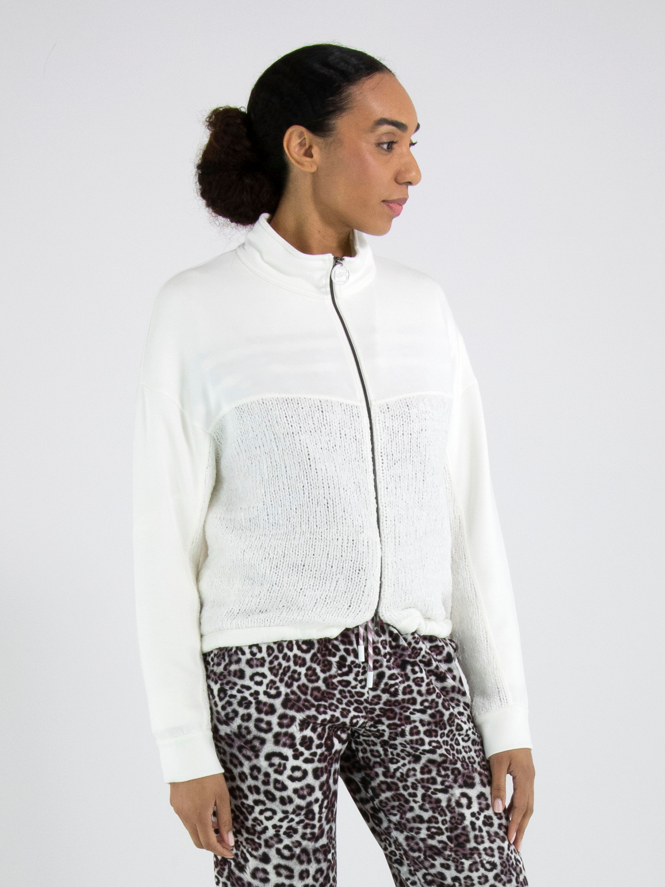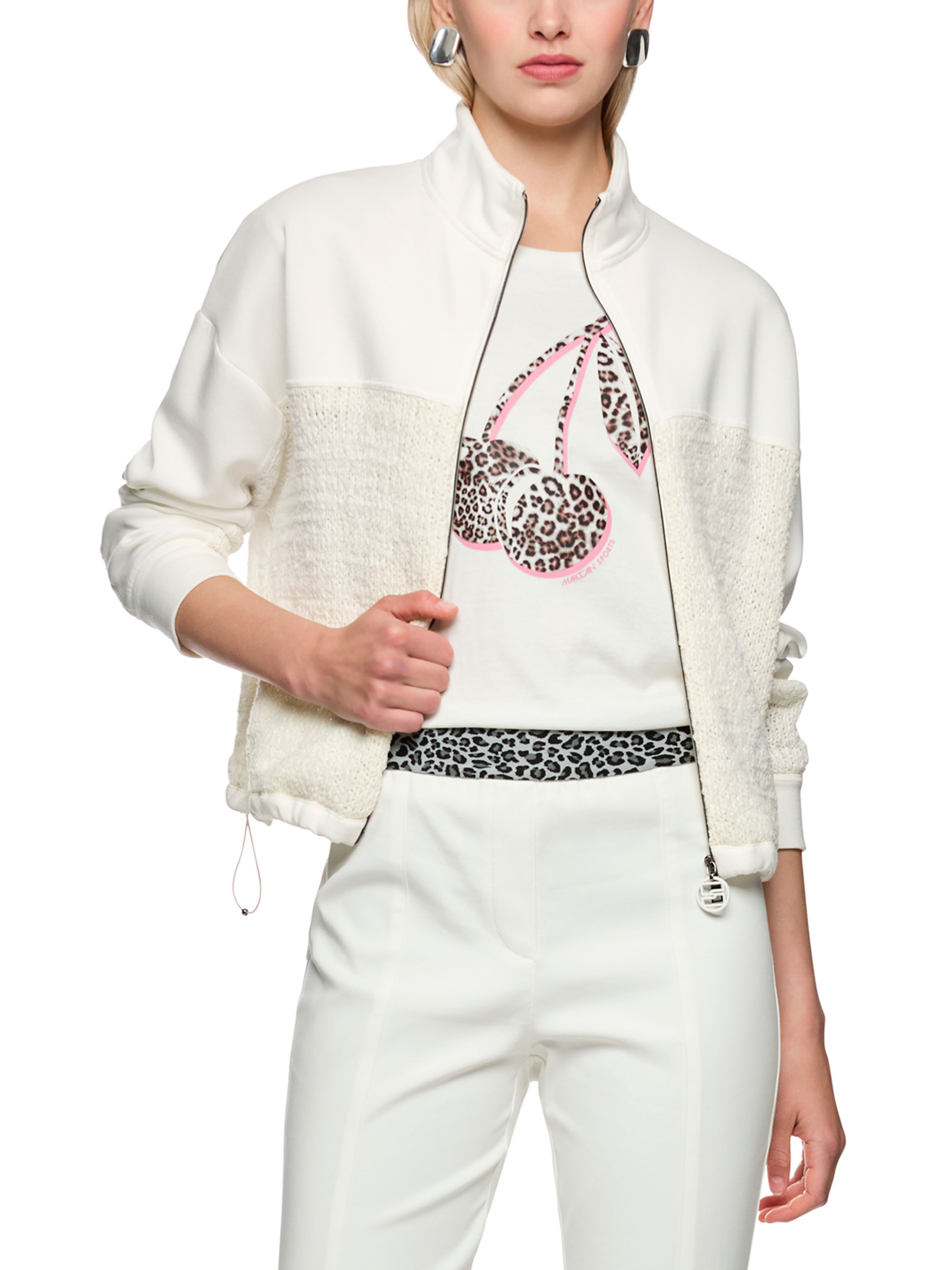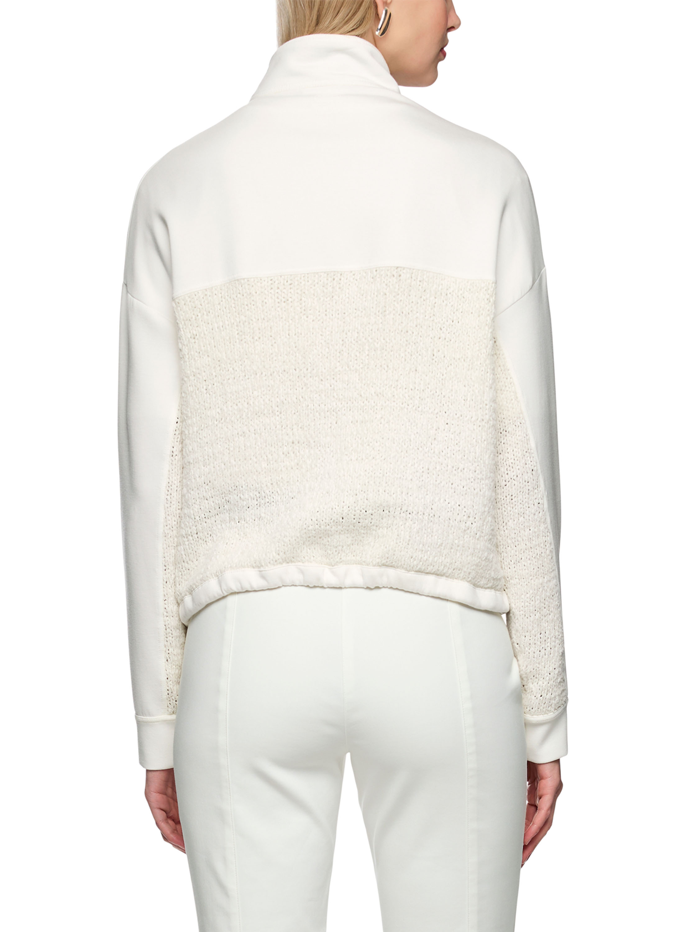 Een vest van Marc Cain in de kleur roomwit. Het bovenste deel tot de buste en de lange mouwen zijn in een scuba kwaliteit. Vanaf de buste is het vest gebreid. Aan de onderkant is een bies met een verstelbaar koord in een tunnelverwerking waarmee een plooi-effect kan worden gecreëerd. Het vest heeft een ritssluiting en mag op 30 graden worden gewassen.
