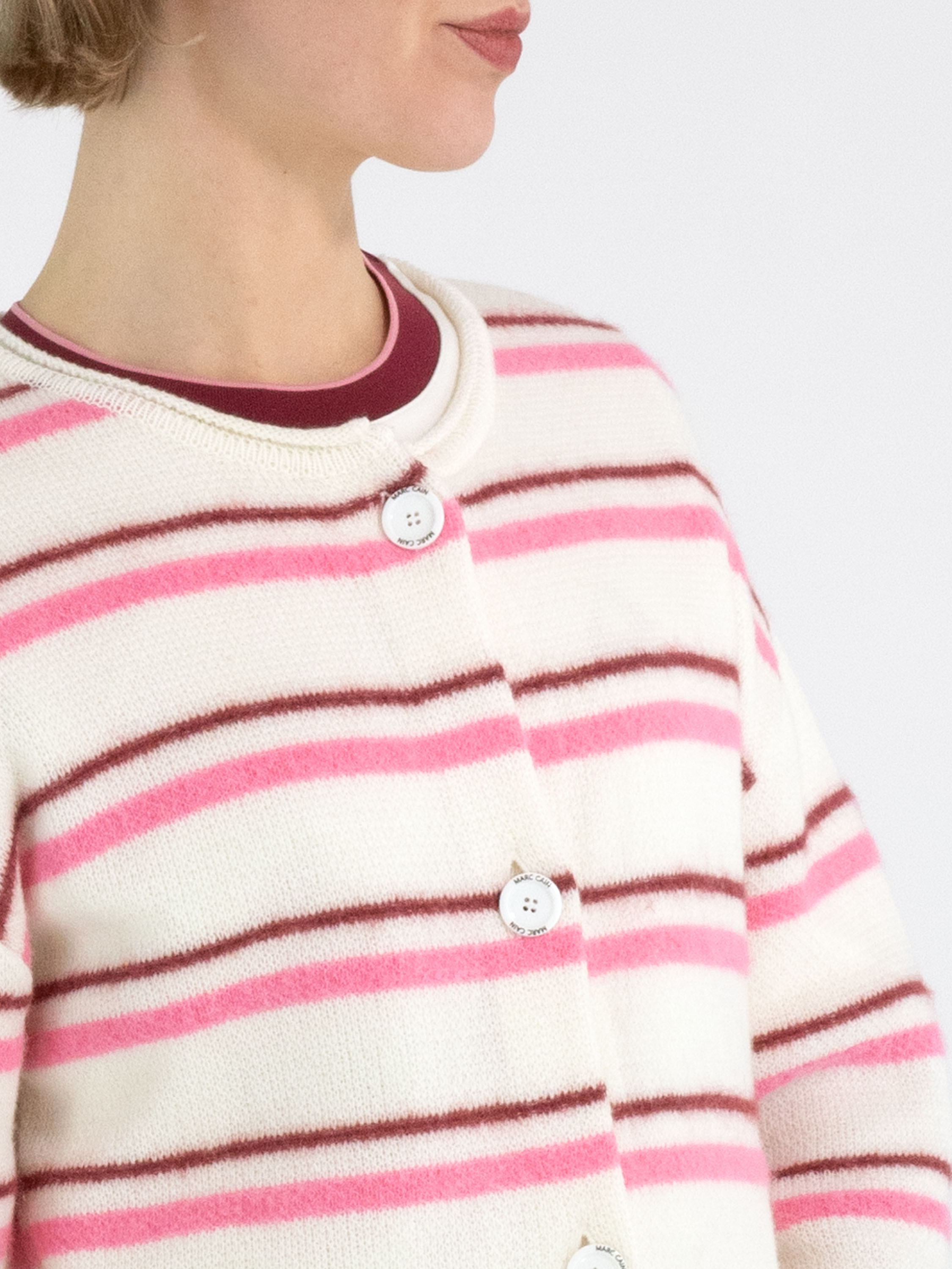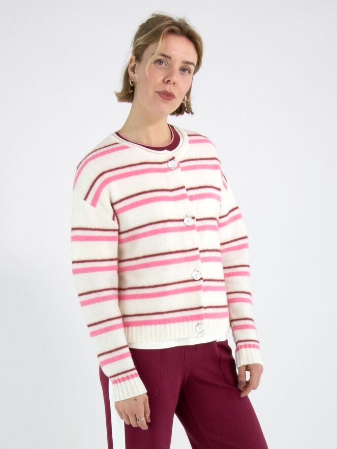Een vest van Marc Cain in een horizontaal strepenpatroon met de kleuren zalmroze en bordeauxrood op een roomwitte achtergrond. Het vest heeft een ronde hals en een sluiting met 4 witte knopen. Aan de onderkant is een geribbelde boord in roomwit. De uiteinden van de lange mouwen hebben een geribbelde boord in roomwit. Dit vest mag op de hand worden gewassen.