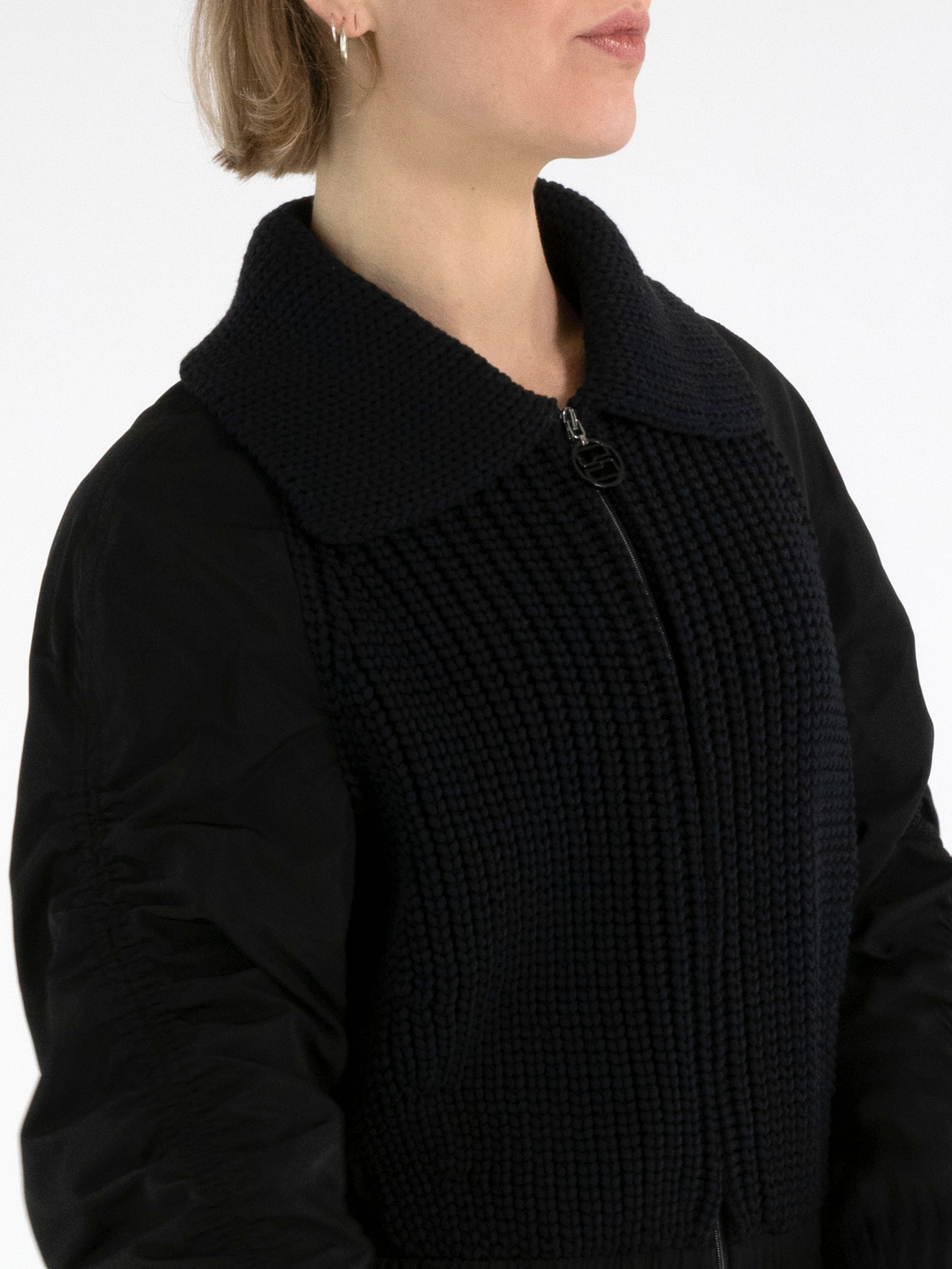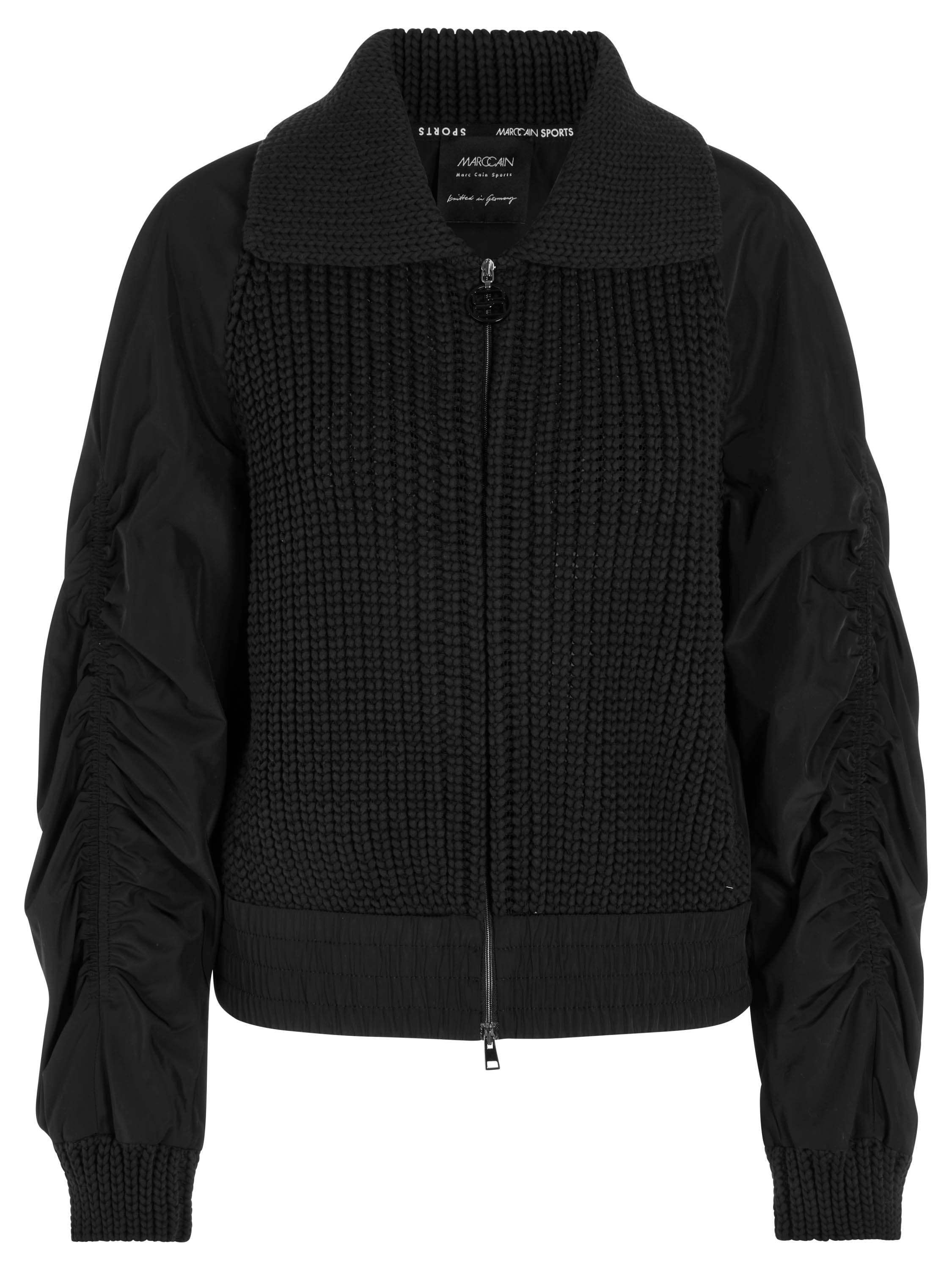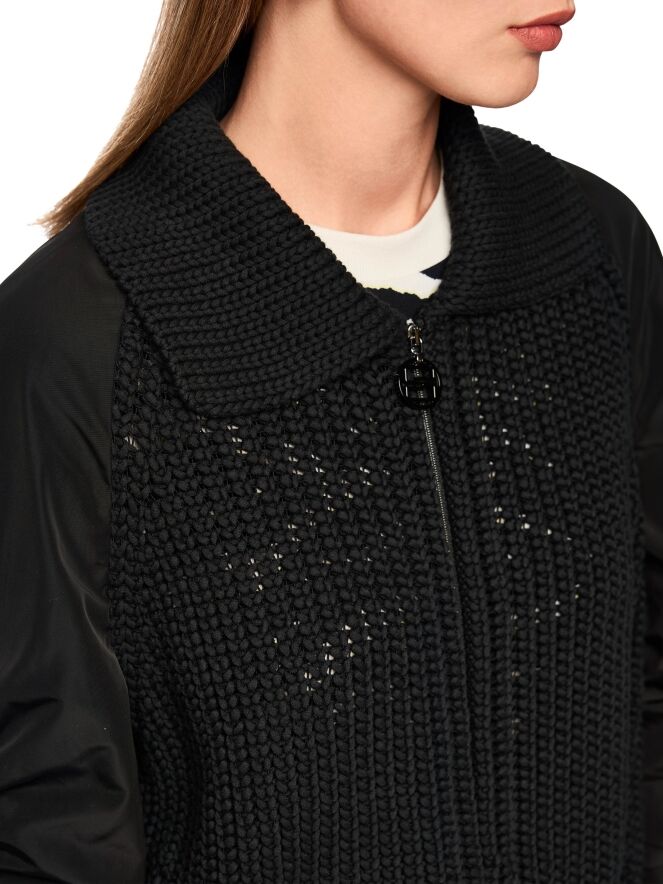 Een vest van Marc Cain in de kleur zwart. De voorzijde van het vest, de manchetten en de kraag zijn gebreid in een patentsteek en de achterkant met de mouwen is in een parachute stof. De stiknaad over de bovenkant van de lange mouwen is aan beide kanten fijn geplooid. Aan de onderkant is een brede, fijn geplooide band. Het vest heeft een ritssluiting en mag op 30 graden worden gewassen.