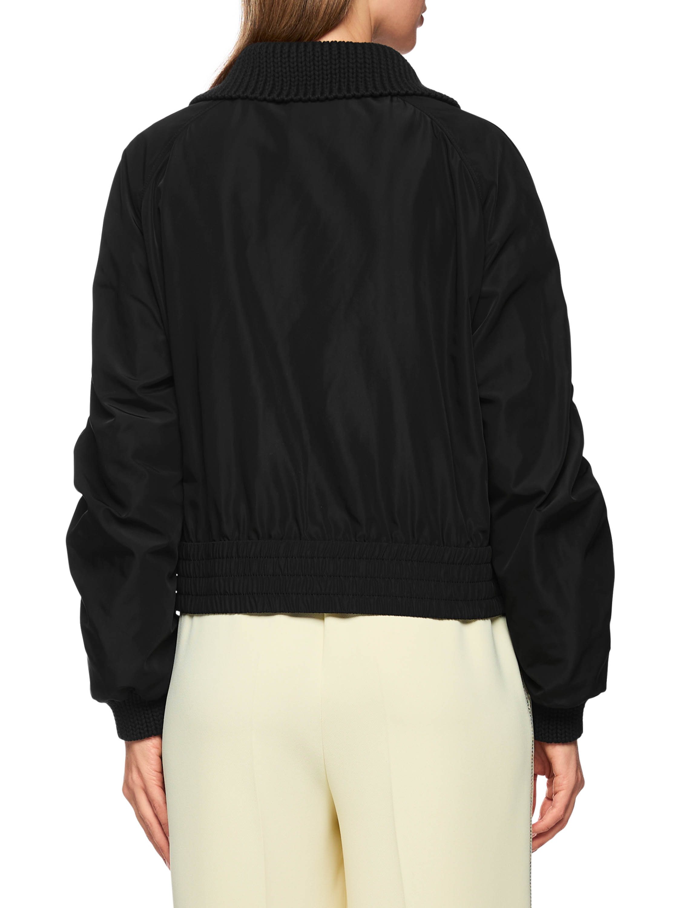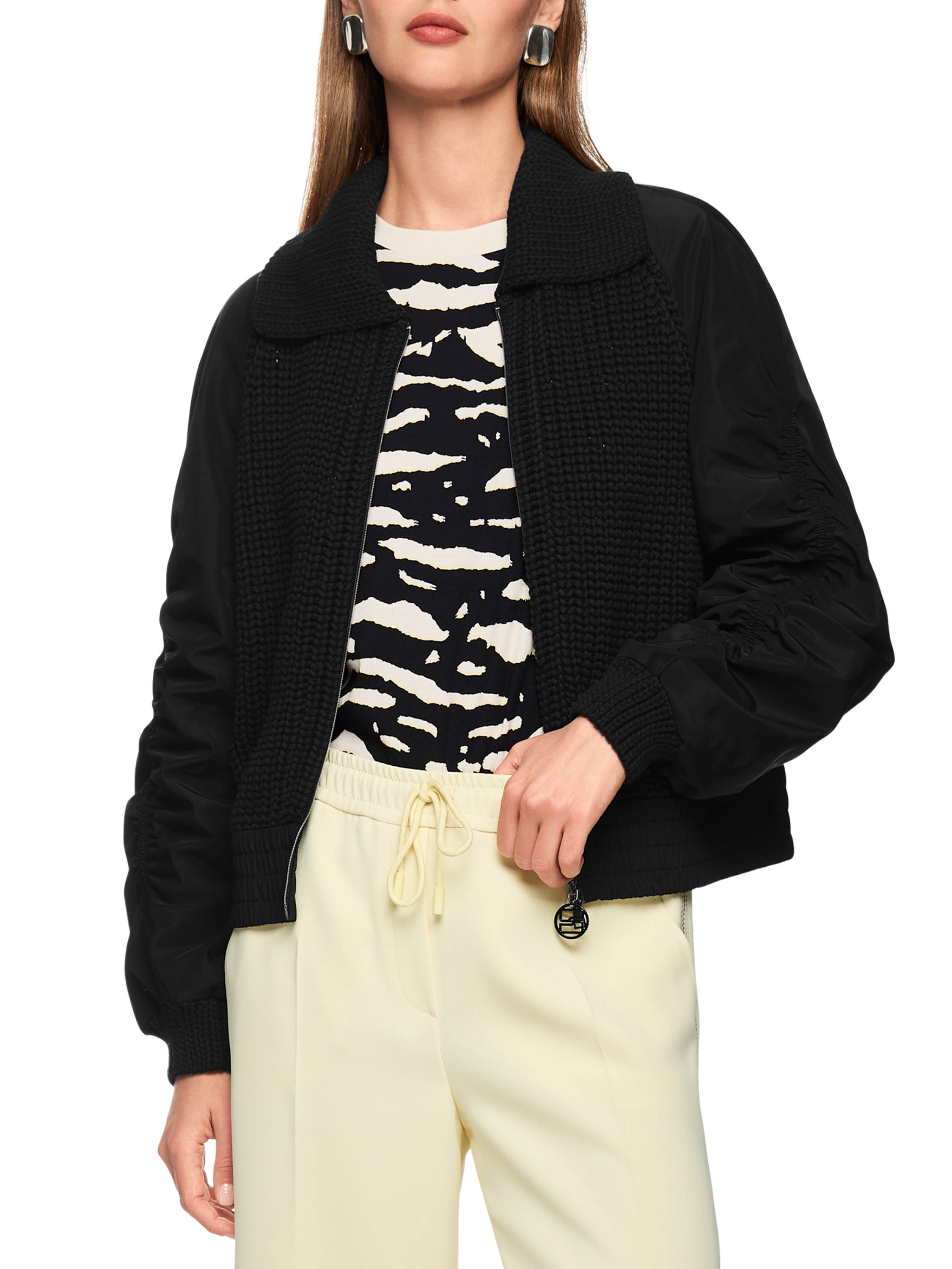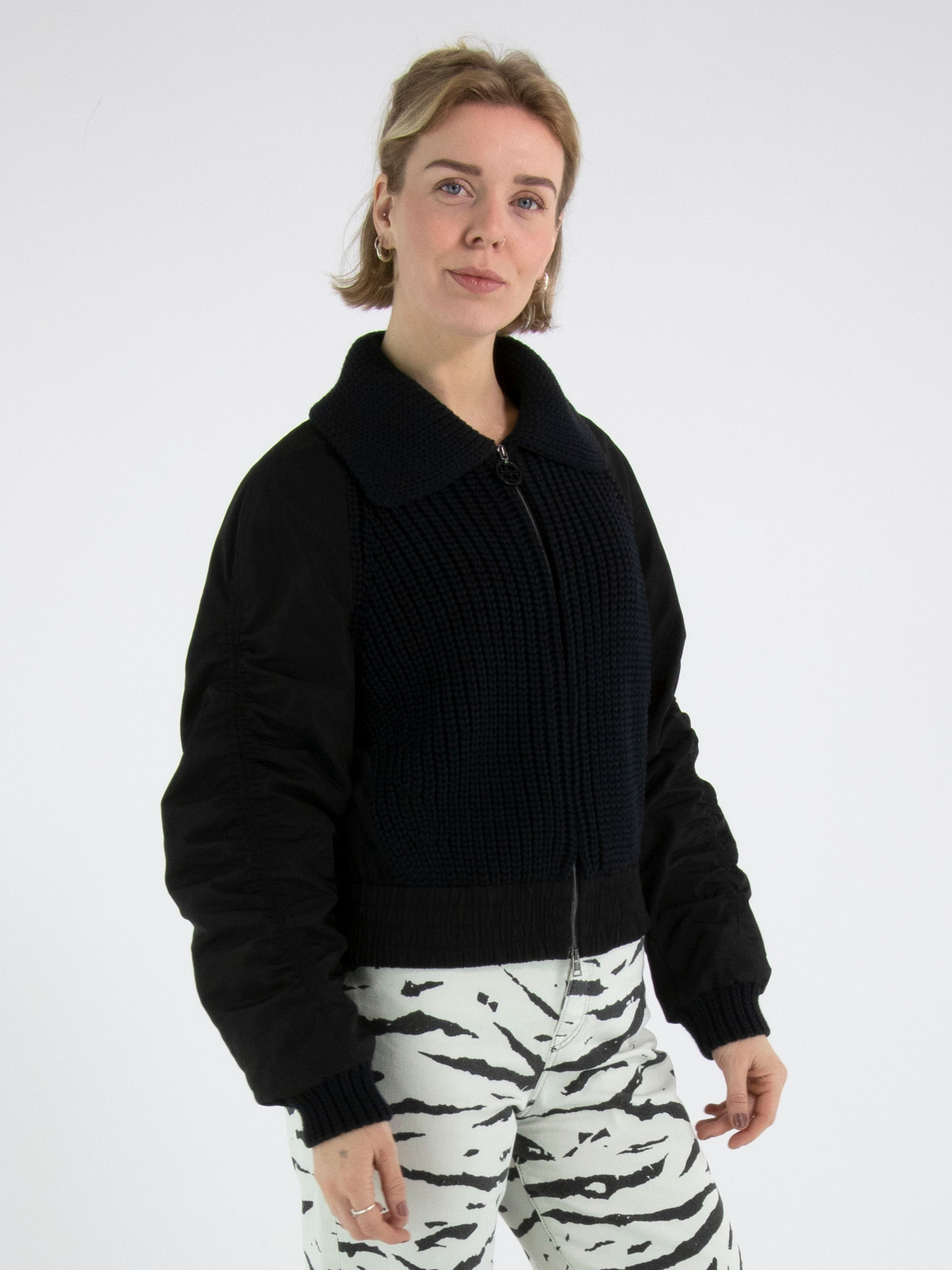 Een vest van Marc Cain in de kleur zwart. De voorzijde van het vest, de manchetten en de kraag zijn gebreid in een patentsteek en de achterkant met de mouwen is in een parachute stof. De stiknaad over de bovenkant van de lange mouwen is aan beide kanten fijn geplooid. Aan de onderkant is een brede, fijn geplooide band. Het vest heeft een ritssluiting en mag op 30 graden worden gewassen.