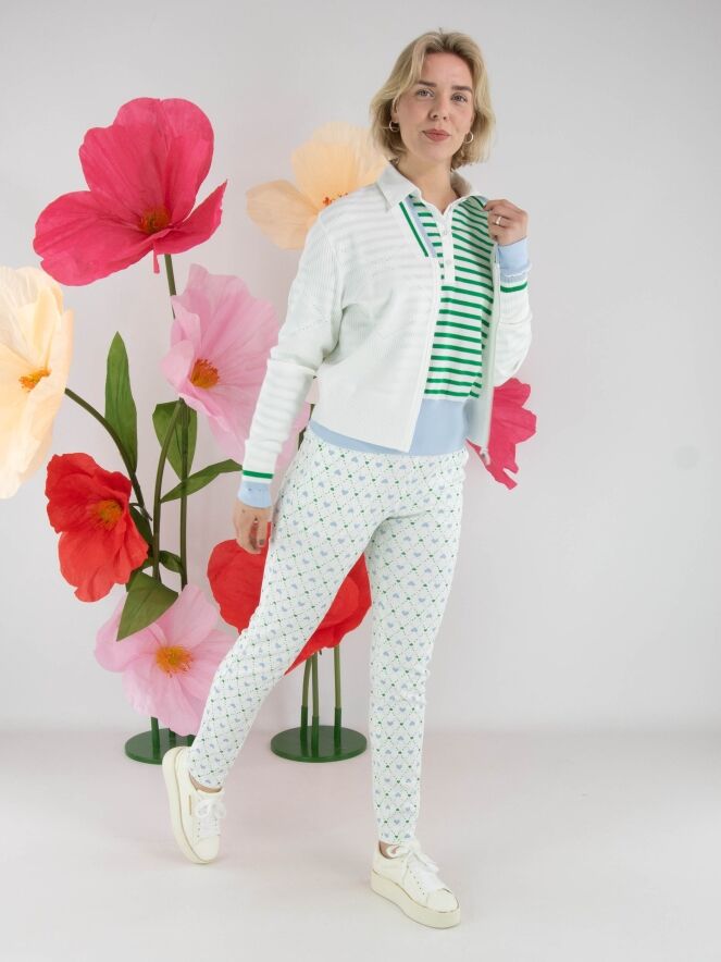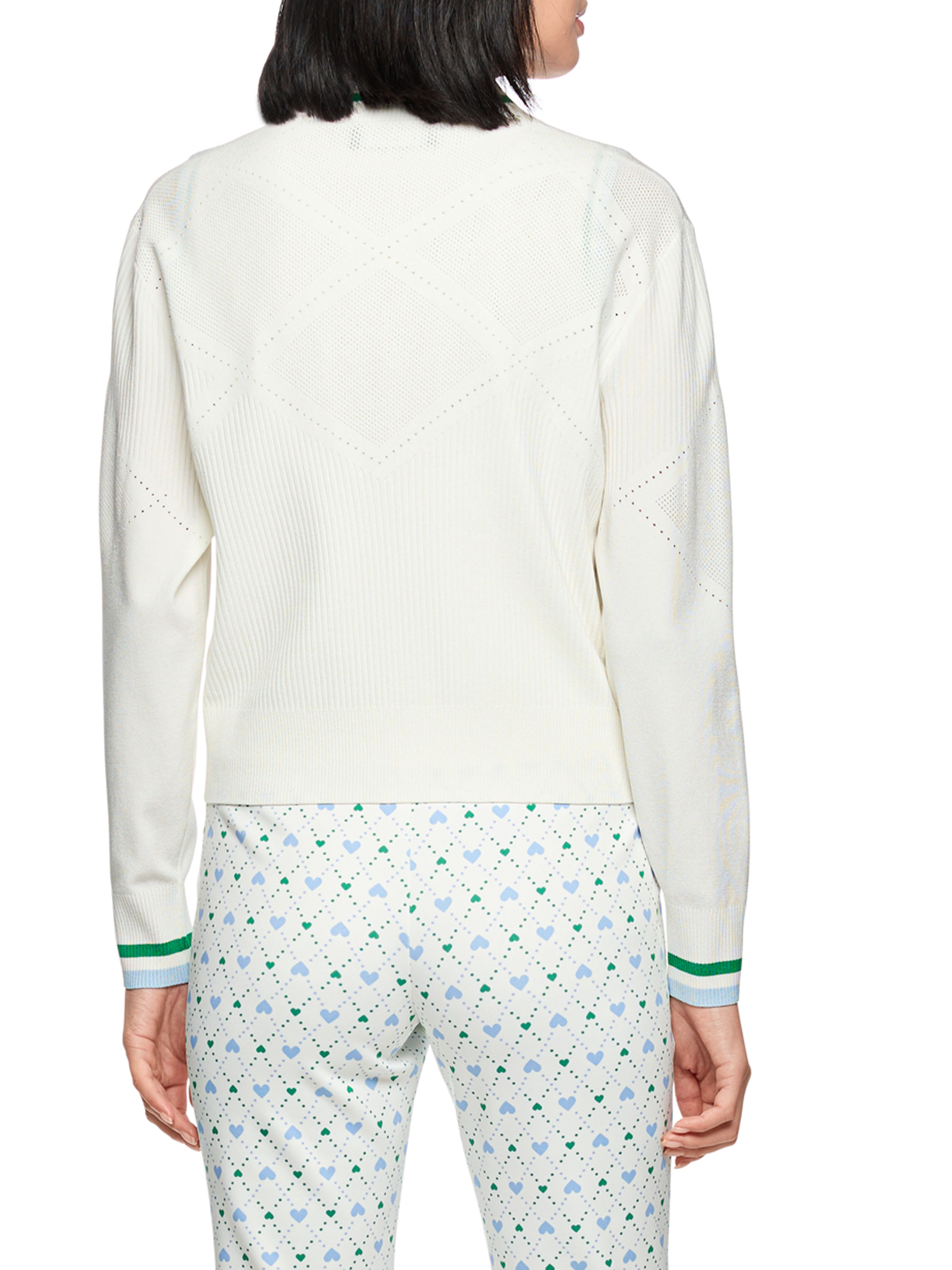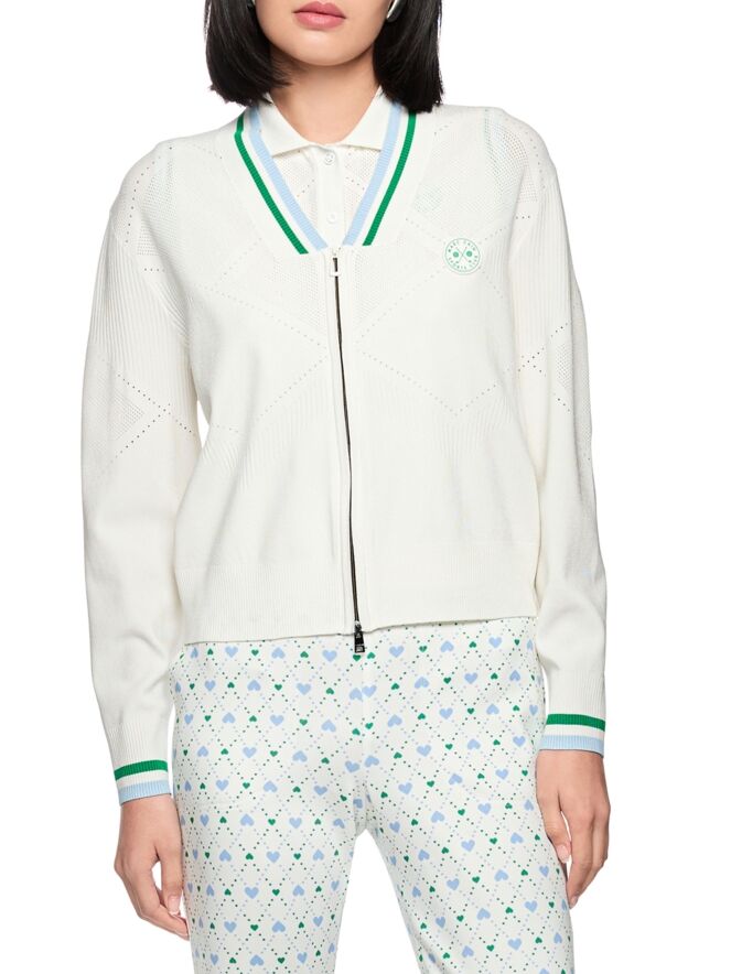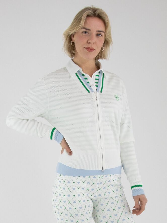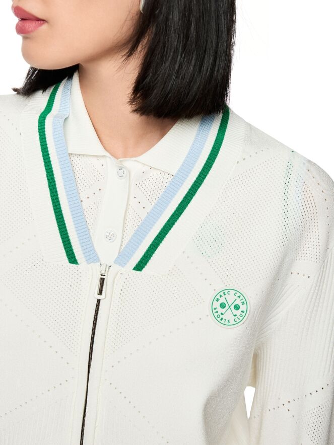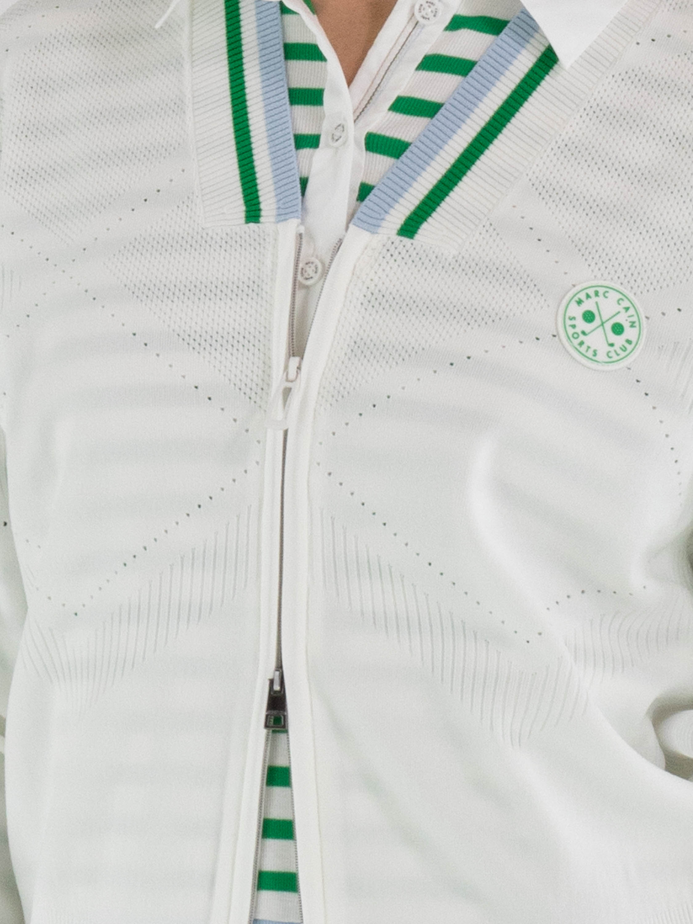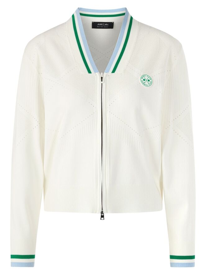 Een vest van Marc Cain in de kleur roomwit. De rand van de V-hals en de uiteinden van de lange mouwen zijn afgewerkt met een fijn geribbelde tricot boord met een streeppatroon in de kleuren groen, bleu en wit. In de stof is een geruit ajourpatroon verwerkt met fijn geperforeerde delen. Het vest heeft een zilverkleurige ritssluiting en kan met de hand worden gewassen.