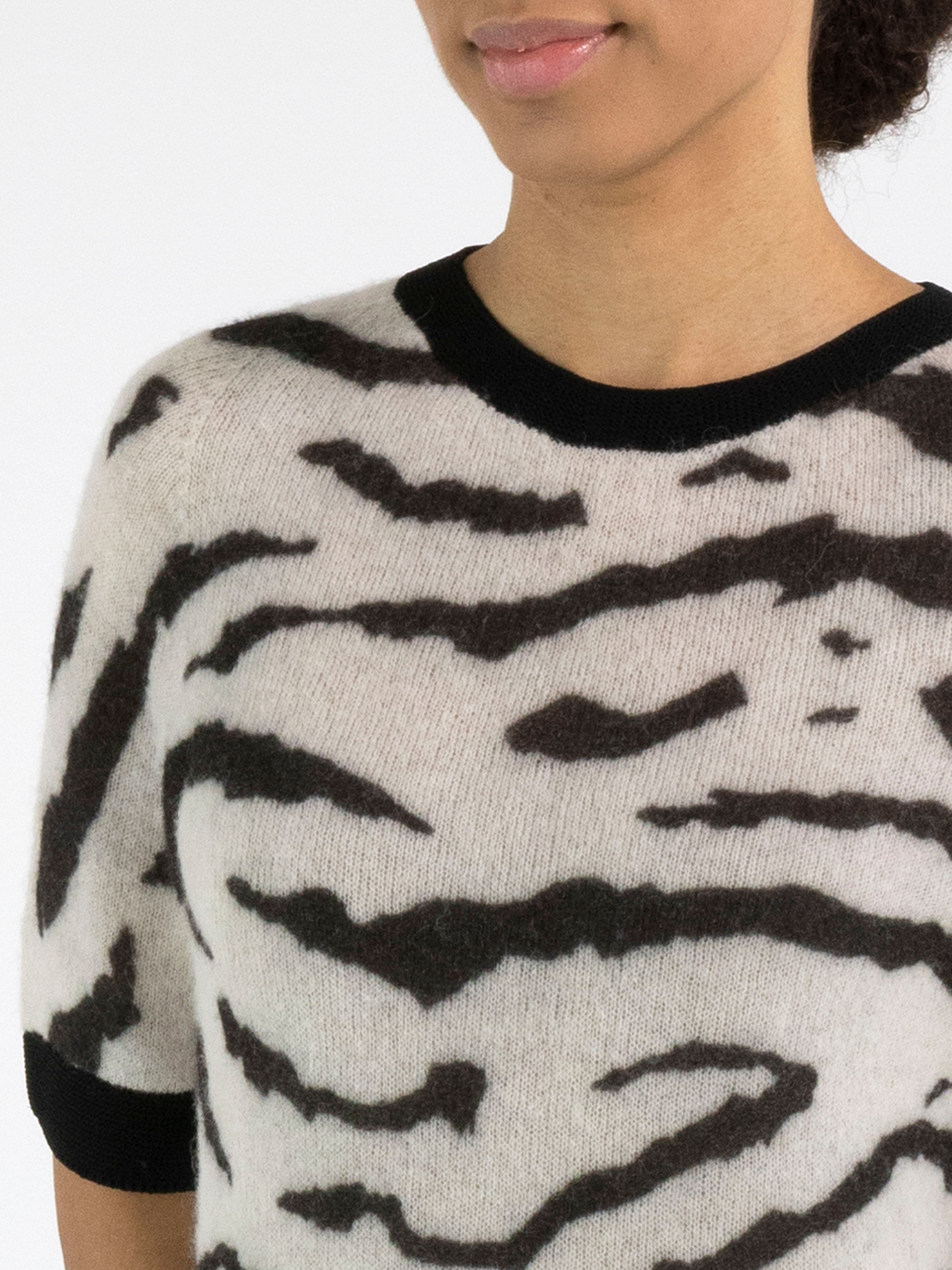 Een pullover van Marc Cain in een zebraprint met de kleuren roomwit en zwart. De korte mouwen hebben een fijn geribbelde tricot boord, die ook is terug te vinden langs de ronde hals en aan de onderkant. Deze pullover mag op de hand worden gewassen.