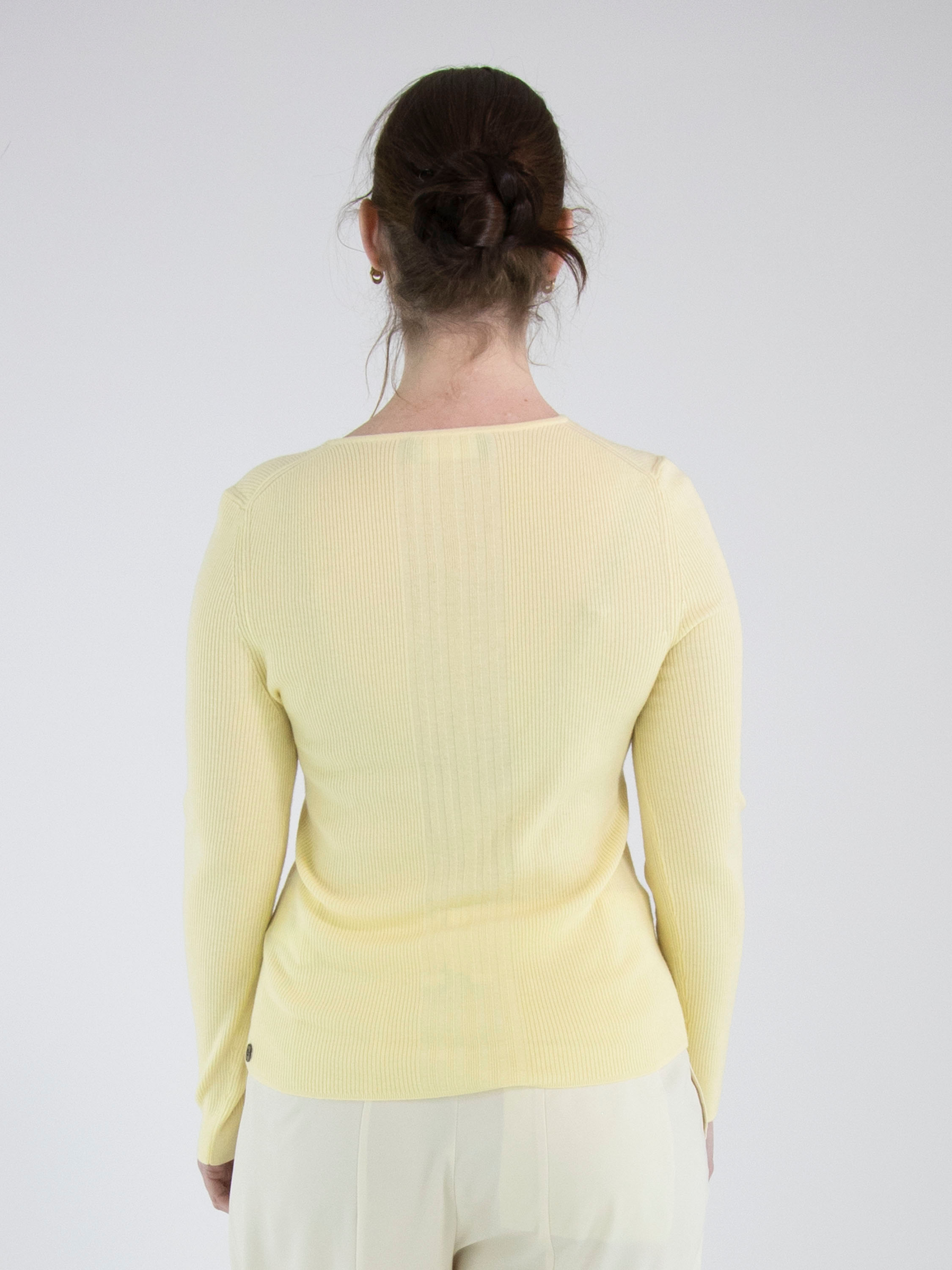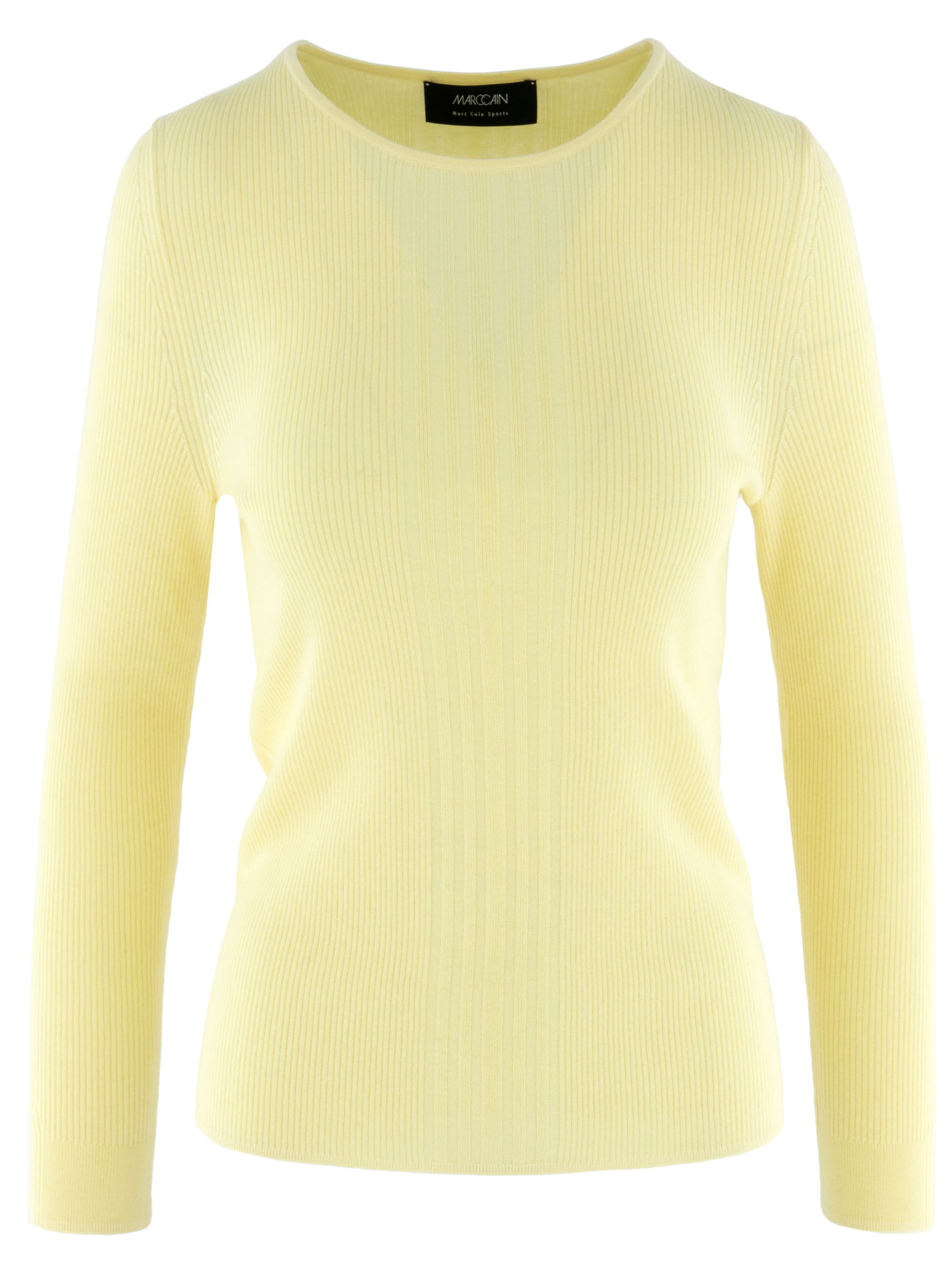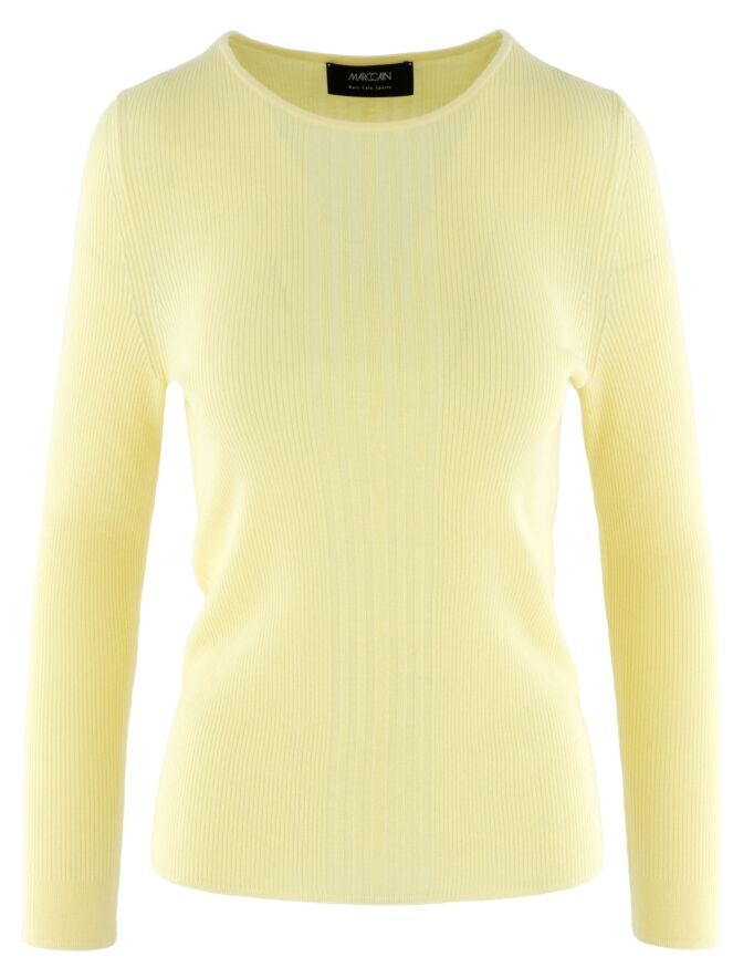 Een pullover van Marc Cain in de kleur geel. De stof is fijn geribbeld met in het midden aan de voorzijde een brede band waar de stof breed geribbeld is. De pullover heeft een ronde hals en lange mouwen. Deze pullover mag op de hand worden gewassen.
