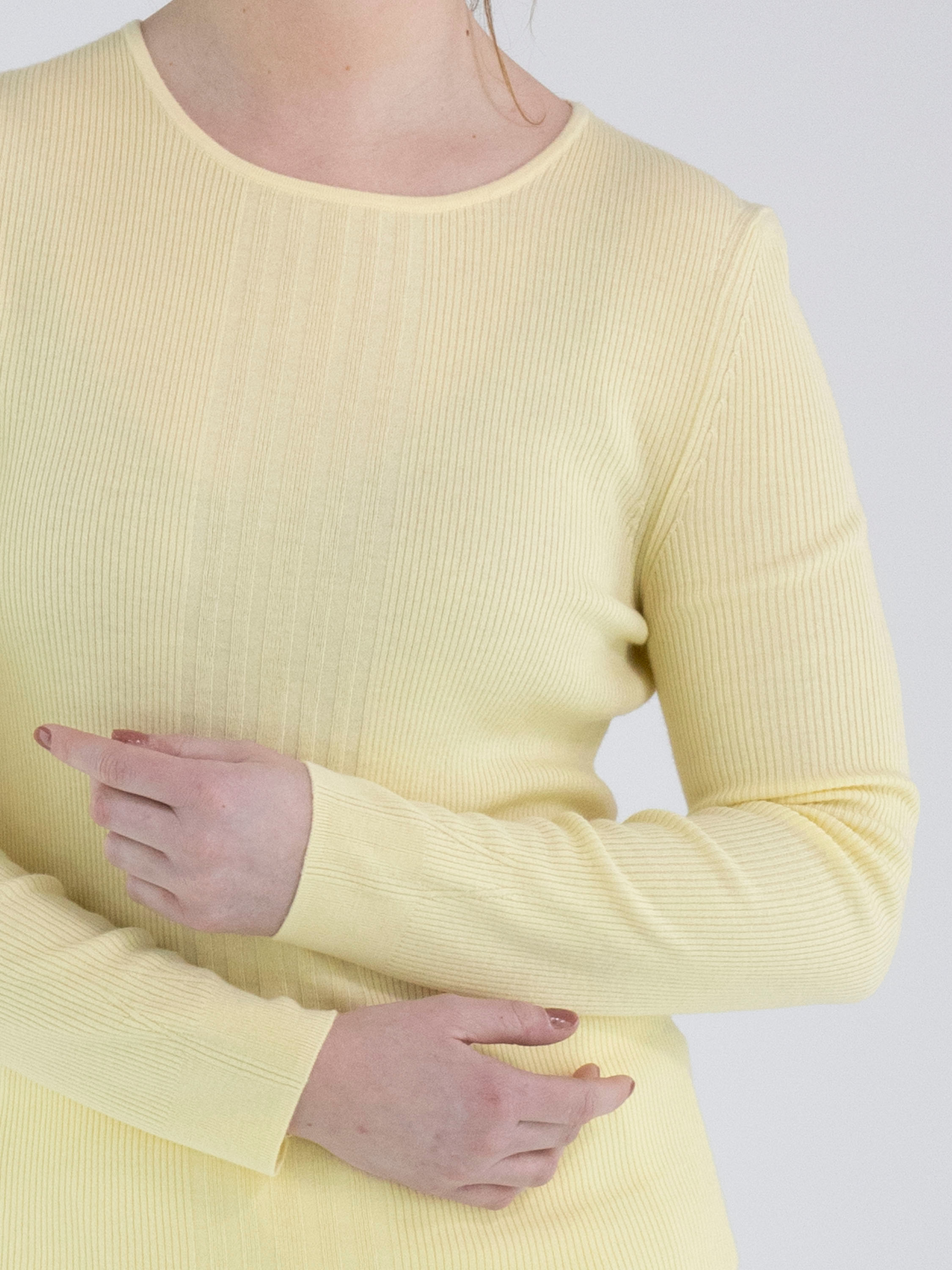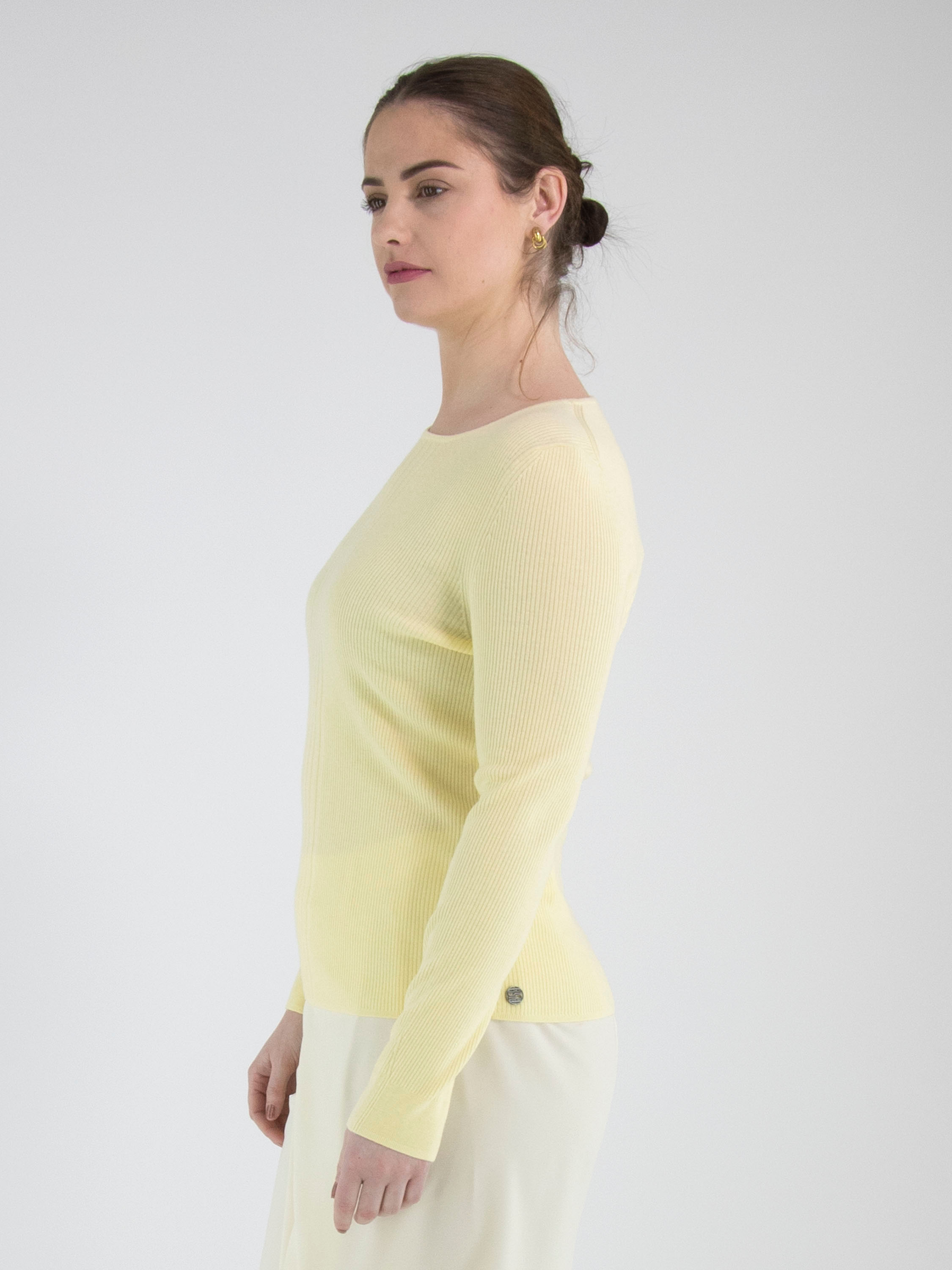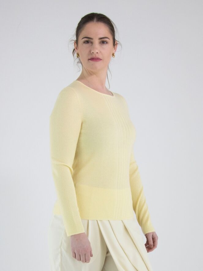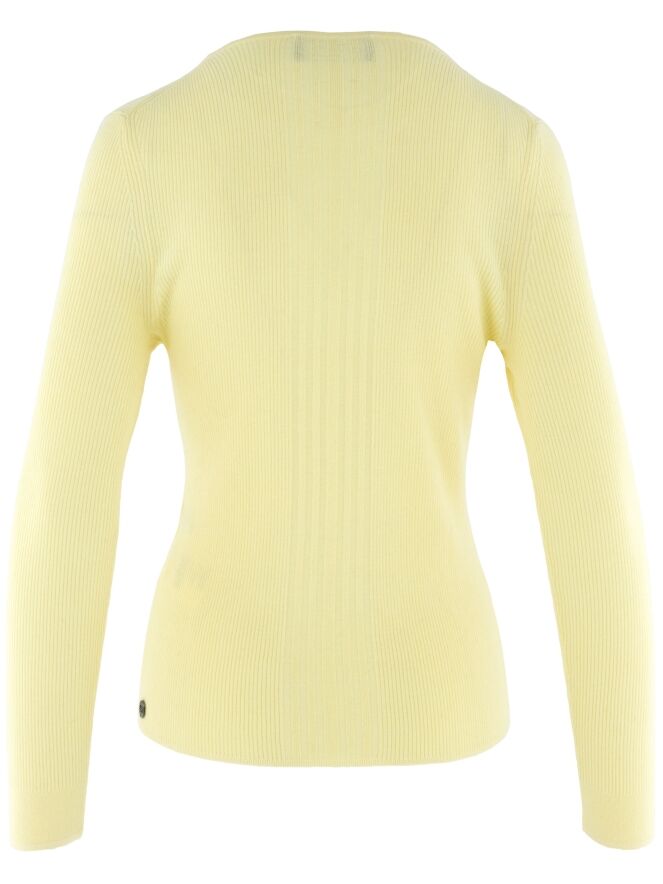 Een pullover van Marc Cain in de kleur geel. De stof is fijn geribbeld met in het midden aan de voorzijde een brede band waar de stof breed geribbeld is. De pullover heeft een ronde hals en lange mouwen. Deze pullover mag op de hand worden gewassen.