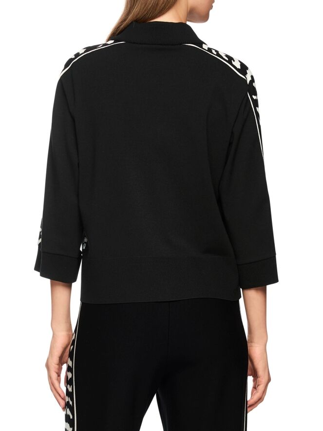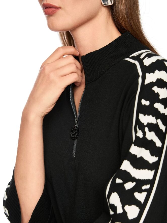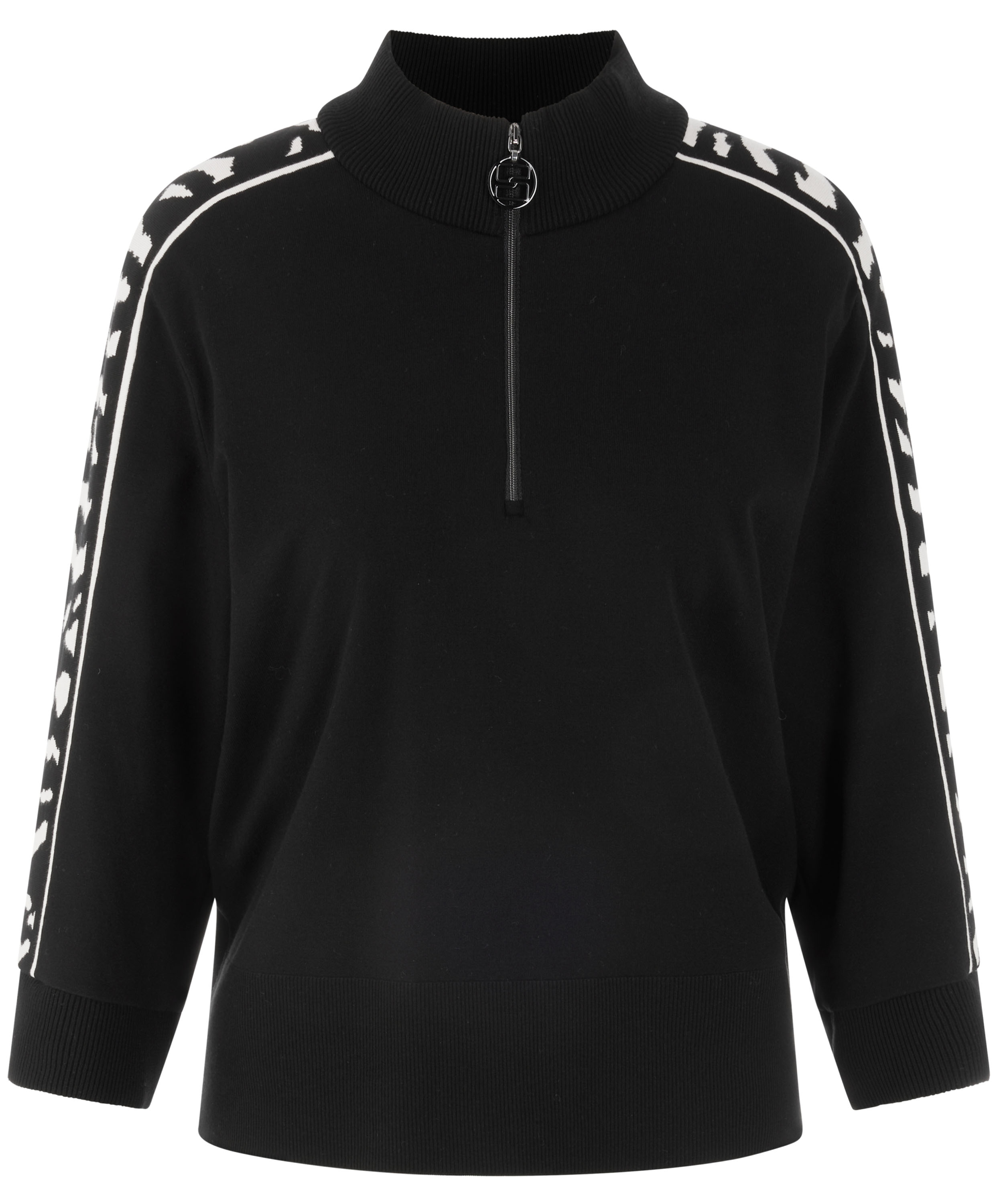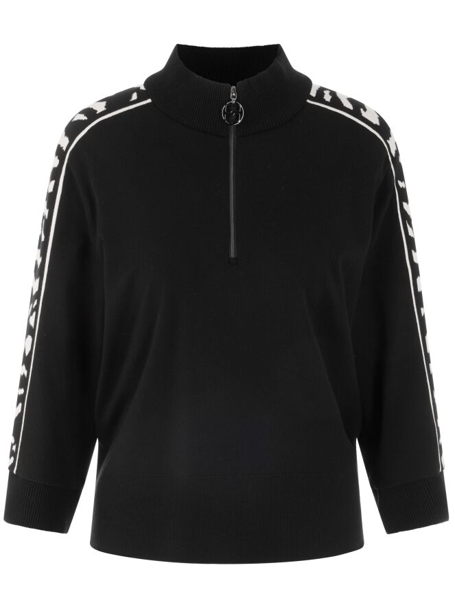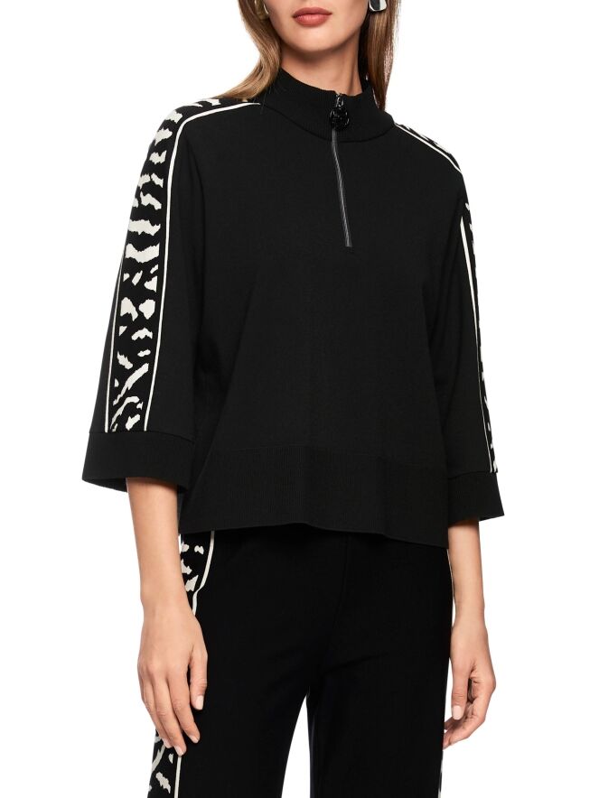 Een sweater van Marc Cain in de kleur zwart. Langs de rand van de ronde hals, de uiteinden van de halflange mouwen en de onderkant is een fijn geribbelde tricot boord in de kleur zwart. Vanaf de rand van de hals tot boven de buste is een ritssluiting. Vanuit de schouders loopt over de bovenkant van de mouwen een zebraprint in de kleuren beige met zwart. Deze sweater mag op 30 graden worden gewassen.