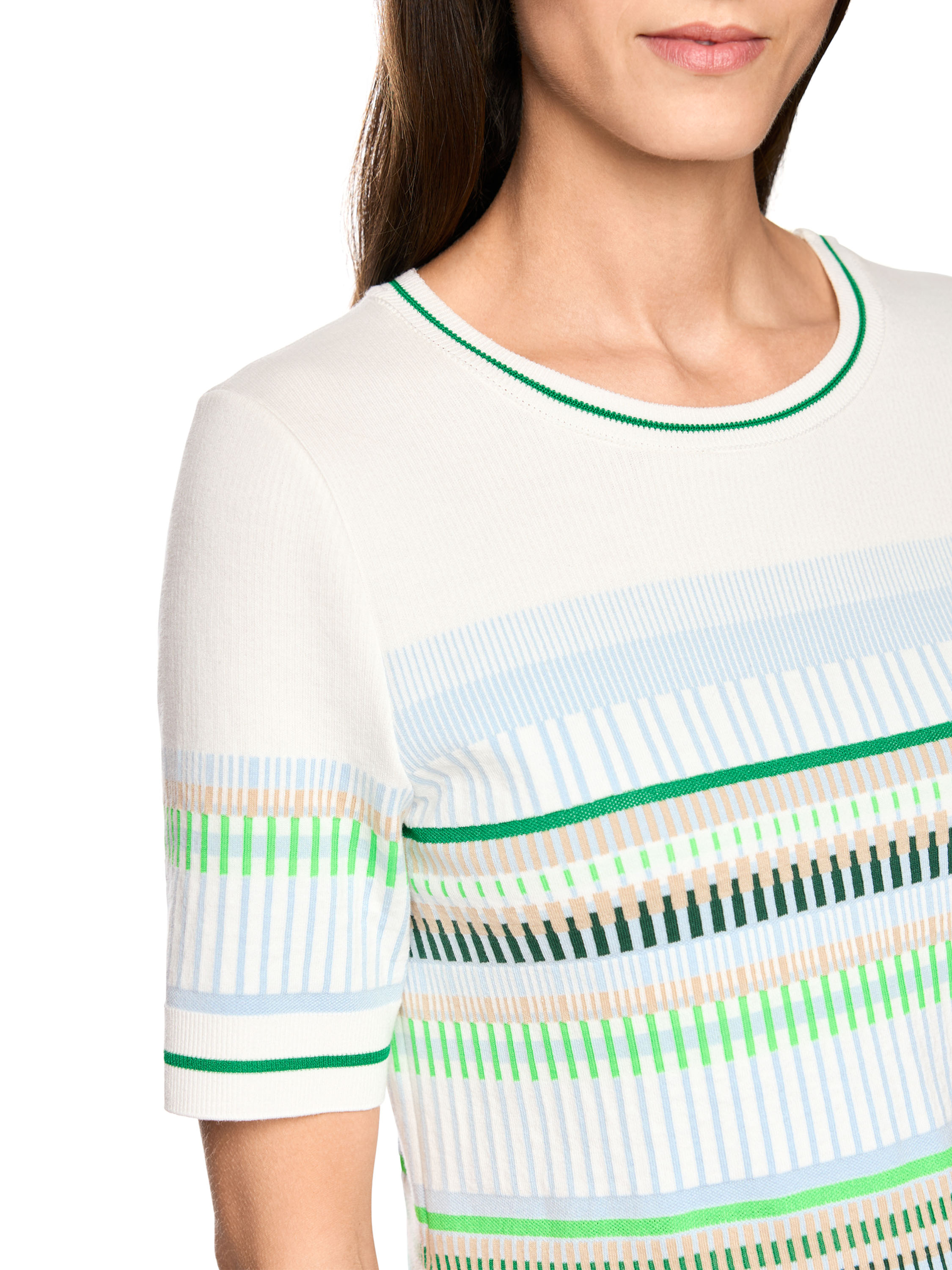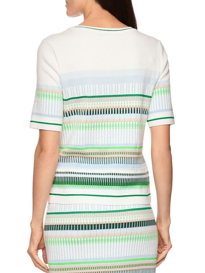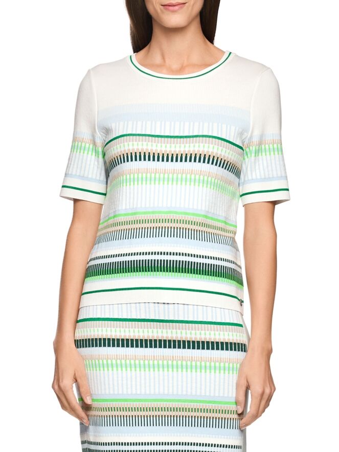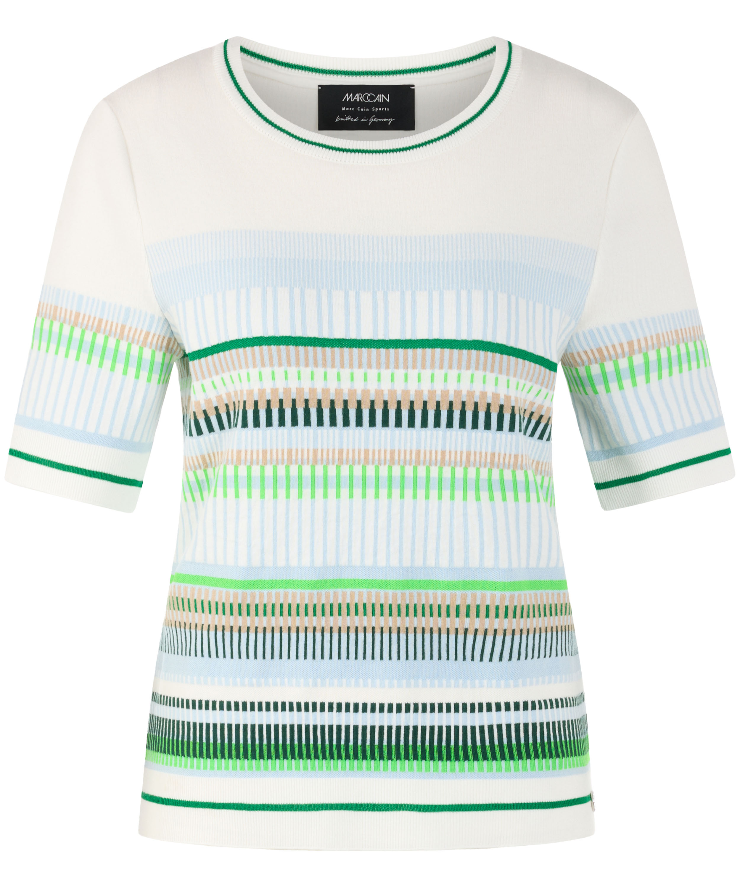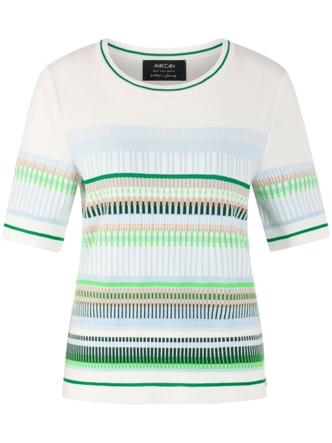 Een shirt van Marc Cain met een streeppatroon in de kleuren bleu, zand, licht- en donkergroen en wit. Langs de rand van de ronde hals, de onderkant en de korte mouwen is een fijn geribbelde tricot boord verwerkt met een streeppatroon in de kleuren groen en roomwit. Dit shirt kan op 30 graden worden gewassen.